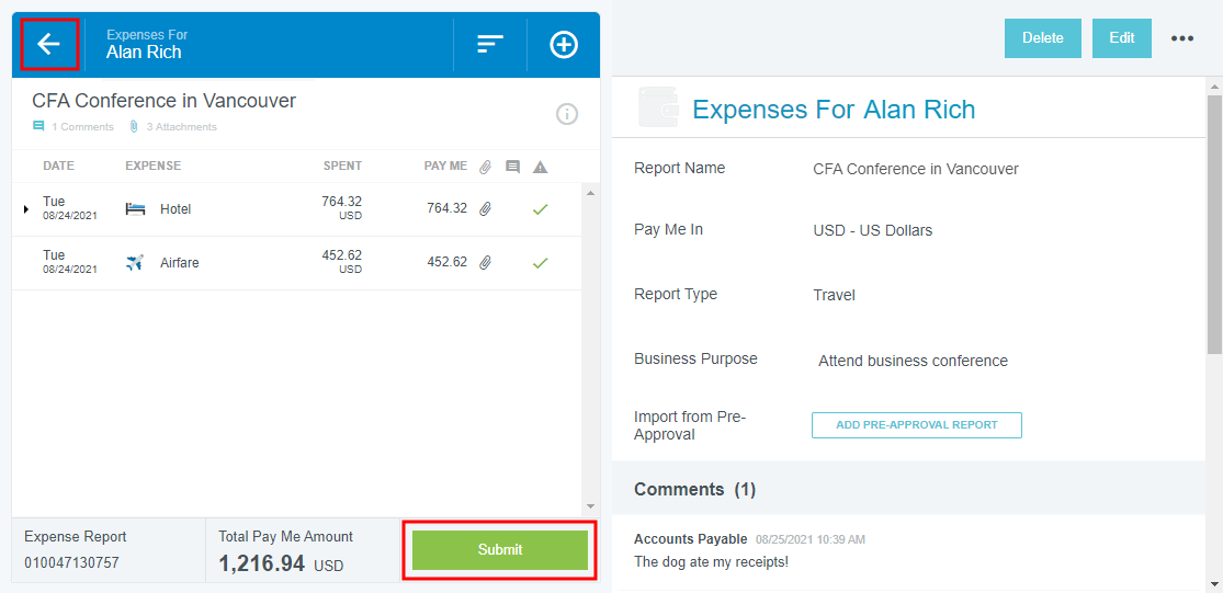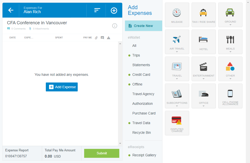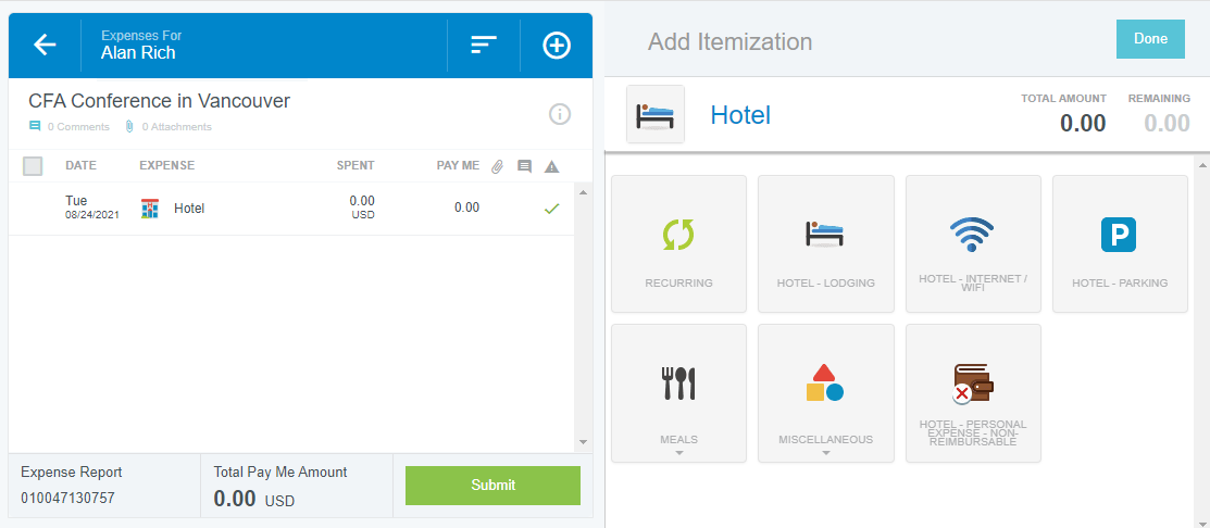 Erstellung einer Spesenabrechnung Mit Spesenabrechnungen können Sie Ausgaben gruppieren und organisieren, Details hinzufügen und zur Genehmigung einreichen. Sie können für jedes Event eine eigene Spesenabrechnung erstellen, oder mehrere Events in einer RKA erfassen. Alternativ zu dem unten beschriebenen Prozess können Sie eine neue Spesenabrechnung auch direkt aus der Beleggalerie erstellen, oder Ihr Unternehmen kann die automatische Erstellung von Ausgaben verwenden. Erstellung einer Spesenabrechnung 1. Klicken Sie auf dem Dashboard im Bereich Ausgaben auf + ERSTELLEN. Klicken Sie im Dashboard in einem mobilen Browser im Bereich Ausgaben auf +. Alternativ können Sie auf die Schaltfläche + in den Dashboards „Entwürfe“, „Zurückgesendet“ oder „Eingereicht“ klicken. Das Ausgabe-Eingabefenster wird geöffnet. Im Header einer Ausgabe werden alle grundlegenden Informationen gespeichert, die auf jede Ausgabe in dieser Abrechnung zutreffen. Je nach Konfiguration Ihres Unternehmens sind für Sie mehr oder weniger Felder sichtbar. RKA-Name: Dieser Name wird vom Ersteller zugewiesen und zum Identifizieren von Ausgaben genutzt. Wenn kein Name eingegeben wird, ist die Standardbezeichnung „Ausgaben für [Datum] [Uhrzeit]“. Rückzahlung in: Wählen Sie im Drop-down-Menü die Währung für die Rückzahlung an den Reisenden aus, falls verfügbar. Start-/Enddatum: Eventuell verlangt Ihr Unternehmen, dass Sie das Start- und Enddatum Ihrer Reise angeben. RKA-Typ: Eventuell verlangt Ihr Unternehmen, dass Sie einen RKA-Typ auswählen, wie z. B. „Reise“ oder „Keine Reise“. Geschäftszweck: Eventuell müssen Sie einen Grund dafür angeben, wieso Sie eine Spesenabrechnung einreichen. Wenn Sie später für die einzelnen Belegpositionen unterschiedliche Geschäftszwecke angeben, werden bis zu fünf davon in der Vorschau für die Abrechnung angezeigt. Wählen Sie SPEICHERN, wenn Sie alle erforderlichen Felder ausgefüllt haben. Ausgaben hinzufügen Wenn das Fenster „Ausgaben hinzufügen“ nicht bereits angezeigt wird, klicken Sie auf die Schaltfläche + oder die Schaltfläche + AUSGABEN HINZUFÜGEN in der Liste der Belegpositionen, um die erste Ausgabe zur RKA hinzuzufügen. Von rechts erscheint das Fenster Ausgaben hinzufügen. Hier können Sie aus verschiedenen Ausgabenkategorien auswählen und Sie haben Zugang zu gelöschten Positionen im Positionen im Papierkorb löschen und wiederherstellen sowie zu Ausgaben, die Sie per E-Mail in die Ausgaben über die Beleggalerie erstellen eingesandt haben. Es gibt eine Grenze von 100 Belegpositionen pro Bericht. In der Kopfzeile der Spesenabrechnung wird ein Countdown angezeigt, wenn Sie noch 20 Positionen vom Grenzwert entfernt sind. Wenn der Grenzwert erreicht ist, werden Sie durch eine Fehlermeldung aufgefordert, eine neue Spesenabrechnung für die zusätzlichen Belegpositionen zu erstellen. Ausgaben aus eWallet oder Beleggalerie hinzufügen Wenn im eWallet oder in der Beleggalerie links neben einer Ausgabenkategorie ein grüner Punkt angezeigt wird, sind in dieser Kategorie ungenutzte Positionen oder Belege verfügbar. Um eine Ausgabe aus der eWallet oder der Beleggalerie zu Ihrem Bericht hinzuzufügen, klicken Sie auf den entsprechenden Abschnitt, markieren Sie das Kontrollkästchen neben der Ausgabe, die sie hinzufügen möchten, und klicken Sie auf HINZUFÜGEN. Kreditkarten-Ausgaben Wenn Sie über eine Firmenkreditkarte verfügen, die mit Ihrem Emburse Enterprise-Konto verknüpft ist, können Sie im Abschnitt „Kreditkarte“ der eWallet gebuchte Kreditkartengebühren zu Ihrem Report hinzufügen. Umfassende Hinweise dazu, wie Sie Kreditkarten-Ausgaben zu Ihrer Spesenabrechnung hinzufügen können, finden Sie in dem Artikel Kreditkarten-Positionen. Warten Sie unbedingt, bis die Kreditkartentransaktion in Ihrer Emburse Enterprise-eWallet erscheint, bevor Sie eine Kreditkartenausgabe erstellen. Wenn Sie eine Ausgabe nur mit dem Beleg einreichen, bevor die Transaktion in Emburse Enterprise angezeigt wird, beantragen Sie stattdessen eine Barerstattung. Gemerkte Ausgaben Wenn Ihre Organisation diese Funktion aktiviert hat, können Sie häufig benutzte Belegpositionen, die Emburse Enterprise sich „gemerkt“ hat, einfach aus dem Offline-Bereich der eWallet zur Abrechnung hinzufügen. Weitere Details dazu finden Sie unter Häufig verwendete Ausgaben merken. NEUE AUSGABEN ERSTELLEN Im Gegensatz zu den Ausgaben, die Sie aus Ihrer eWallet oder Ihrer Beleggalerie hinzufügen, sind direkte Ausgaben diejenigen, die Sie manuell über die Schnittstelle in Ihren Bericht eingeben. Die Kacheln repräsentieren Ausgabenkategorien Ihres Unternehmens. Ein kleiner Pfeil nach unten zeigt an, dass es noch Unterkategorien gibt. Klicken Sie auf NEU ERSTELLEN, um die Kacheln des Ausgabentyps anzuzeigen. Klicken Sie auf eine Kachel mit einem kleinen Pfeil nach unten, um deren Unterkategorien anzuzeigen. Klicken Sie erneut darauf, um die Unterkategorien auszublenden. Sie können auch die Suchleiste oben verwenden, um nach Ausgabentypen anhand ihrer genauen Bezeichnungen zu suchen (d. h. die Suche „Flüge” liefert keine Ergebnisse, wenn Ihr Unternehmen diesen Ausgabentyp als „Flugkosten” bezeichnet). Um Ihrer Abrechnung eine Ausgabe hinzuzufügen, klicken Sie auf die entsprechende Kategorie oder Unterkategorienkachel für den gewünschten Ausgabentyp. Wenn Sie den Ausgabentyp später ändern müssen, klicken Sie einfach auf die Kachel Ausgabentyp und wählen Sie den neuen Ausgabentyp aus. Im Folgenden werden die drei Grundtypen von Direkt-Ausgaben beschrieben. Informationen zu zusätzlichen Ausgabenarten finden Sie unter Besondere Ausgabentypen. Standard-Ausgabeneintrag: Hierbei handelt es sich um das Grundformat für die meisten Ausgaben – einschließlich Flugtickets, Taxifahrten und Parkgebühren. Sie werden aufgefordert, Informationen wie Datum, Betrag, Beschreibung und Zuordnung einzugeben. Weitere Informationen zu Zuordnungen finden Sie in dem 
