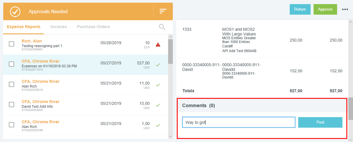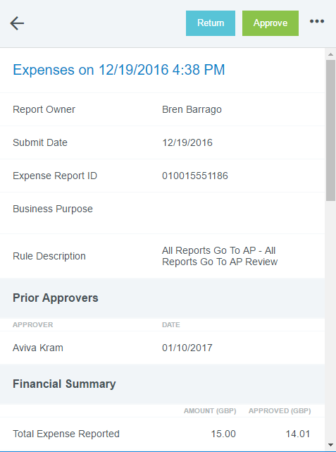 Ausgaben in Emburse Enterprise genehmigen Benutzer mit entsprechenden Berechtigungen können Spesenabrechnungen in Emburse Enterprise und per E-Mail genehmigen. Einzelheiten dazu, wie Ausgaben zur Genehmigung in Emburse Enterprise weitergeleitet werden, finden Sie unter Routing-Prozess zur Genehmigung von Ausgaben. Zugriff auf Berichte, die auf Genehmigung warten Wenn Sie Teil des Genehmigungsvorgangs sind und Positionen auf Ihre Genehmigung warten, erscheint auf dem Dashboard eine orangefarbene Benachrichtigungsleiste. Klicken Sie auf eine der Genehmigungsarten, um zum Genehmigungen-Dashboard zu gelangen. Sie können auch über den MENÜ-Button oben links auf Ihre Genehmigungen zugreifen. Die Anzahl der ausstehenden Genehmigungen wird in dem gelben Kreis angezeigt. Die Liste Genehmigungen erforderlich zeigt alle Ausgaben an, die Sie noch auf der Registerkarte Spesenabrechnung genehmigen müssen, einschließlich des Report-Inhabers, des Report-Namens, der Report-ID, des Einreichungsdatums, des ausgegebenen Betrags und des Währungscodes. Wählen Sie einen zu genehmigenden Bericht aus Schnellsuche 1. Klicken Sie auf das Vergrößerungsglas-Symbol, um den Reisenden oder die RKA-ID schnell zu finden. 2. In der Drop-down-Liste können Sie den Reisenden oder die RKA-ID auswählen und dann im Suchfeld danach suchen. Bei der Suche nach Reisenden können Sie auch nach dem Titel suchen Um nach der RKA-ID zu suchen, müssen Sie die vollständige ID-Nummer eingeben. 3. Ihre Suchergebnisse bleiben – auch nach dem Öffnen und Schließen von Reports – erhalten, bis Sie auf ABBRECHEN klicken oder Sie das Genehmigungen-Dashboard verlassen. Genehmigungen sortieren und filtern Klicken Sie auf die Schaltfläche SORT oben rechts, um die Liste nach Datum, Nachnamen, Betrag, Validierungs- oder Zuordnungsdatum zu sortieren. Mit dem Filterkriterium Validiert werden alle Ausgaben angezeigt, für die Warnungen vorliegen. Über den SORT-Button können Sie außerdem auf Filter zugreifen. Sie können Ihre Genehmigungen nach den von Ihrem Unternehmen festgelegten Kriterien filtern. Sie können auch benutzerdefinierte Filter erstellen. Überprüfung ausblenden Wenn Sie Mitglied einer großen Gruppe von Genehmigern sind, verwenden Sie den Filter ÜBERPRÜFUNG AUSBLENDEN, um nur die Berichte in Ihren Genehmigungslisten anzuzeigen, die derzeit nicht von anderen Genehmigern geprüft werden. Wenn ein Bericht in der gefilterten Liste von einem anderen Prüfer geöffnet wird, wird er aus der Liste entfernt. Vorschau für Berichtsinformationen anzeigen Um Berichtsinformationen aus der Liste „Genehmigungen erforderlich“ anzuzeigen, klicken Sie auf den Berichtsnamen. Die Berichtsvorschau wird auf der rechten Seite angezeigt. Profil des Berichtseigentümers anzeigen Klicken Sie in der Berichtsvorschau auf den Namen des Berichtseigentümers, um auf dessen Profil zuzugreifen. Profile enthalten Informationen wie z. B. den Reisenden-Titel, die E-Mail-Adresse und die zugewiesenen Funktionen. Klicken Sie auf WEITERE ANZEIGEN, um alle Informationen anzuzeigen. Der Abschnitt „Genehmiger-Kommentare“ des Benutzerprofils ermöglicht es Genehmigern, untereinander private Kommentare über den Benutzer auszutauschen. Außerdem können sie das Benutzerrisiko besser einschätzen, bevor sie eine Spesenabrechnung genehmigen. Genehmiger-Kommentare sind nur für autorisierte Genehmiger sichtbar, die über eine Regel zur Benutzerautorisierung Berechtigung dazu erhalten haben. Auf ihren eigenen Benutzerprofilen können Genehmiger keine Kommentare einsehen. Aktionen für Berichtsvorschau In der Vorschau haben Sie die Möglichkeit, eine komplette Spesenabrechnung zu genehmigen oder zurückzusenden. Klicken Sie einmal auf eine der in der Liste aufgeführten Spesenabrechnungen, damit eine Vorschau erscheint. Falls notwendig, können Sie mit der Bildlaufleiste an der Seite nach oben oder unten scrollen. Aus der Vorschau genehmigen Wenn Sie in der Vorschau auf GENEHMIGEN klicken, werden alle Belegpositionen des Berichts sofort genehmigt. Sobald der Genehmiger die Spesenabrechnung genehmigt und auf den zweiten GENEHMIGEN-Button klickt, wird die gesamte Spesenabrechnung zum nächsten Schritt des Genehmigungsvorgangs weitergeleitet. Wenn Ihr Unternehmen die Funktion „Zusätzlicher Genehmiger“ aktiviert hat, finden Sie unter Hinzufügen eines zusätzlichen Expense Approvers Informationen zum Hinzufügen eines zweiten Genehmigers zum Routing-Prozess des Berichts. Aus der Vorschau zurückkehren Wenn Sie auf RÜCKSENDUNG klicken, werden alle Belegpositionen in der Spesenabrechnung umgehend abgelehnt. Sobald der Genehmiger seinen Vermerk in das Feld eingegeben und auf RÜCKSENDUNG geklickt hat, wird die gesamte Spesenabrechnung an den Reisenden zurückgesandt. Andere Aktionen in der Vorschau Klicken Sie auf die Schaltfläche WEITERE AKTIONEN, um auf andere Funktionen im Vorschaubildschirm zuzugreifen. Öffnen: Öffnen Sie die Spesenabrechnung, um einzelne Belegpositionen zu genehmigen oder zurückzusenden. Nachverfolgung: Folgen Sie dem gesamten Laufgang der Spesenabrechnung durch den Genehmigungsrouting-Vorgang. PDF: Mit dieser Funktion werden verschiedene Versionen des PDF Report der Spesenabrechnung angezeigt: Nur das Deckblatt Vollständiger Bericht Vollständiger Report mit Vermerken und Belegen Vollständiger Report mit Belegen Nur Belege anzeigen Berichtspositionen anzeigen Wenn Sie eine Spesenabrechnung öffnen, können Sie Belegpositionen einzeln genehmigen oder zurücksenden, anstatt auf eine gesamte Spesenabrechnung in einem Zug zu reagieren. Bericht öffnen Um einen Report zu öffnen, doppelklicken Sie in der Liste der Genehmigungen auf den Report, klicken Sie in der Vorschau auf den Namen des Reports oder klicken Sie oben links in der Vorschau unter WEITERE AKTIONEN auf ÖFFNEN. Belegposition anzeigen Um eine Belegposition anzuzeigen, klicken Sie auf den Namen dieses Einzelpostens. Vorabgenehmigungen anzeigen, die an Belegpositionen an