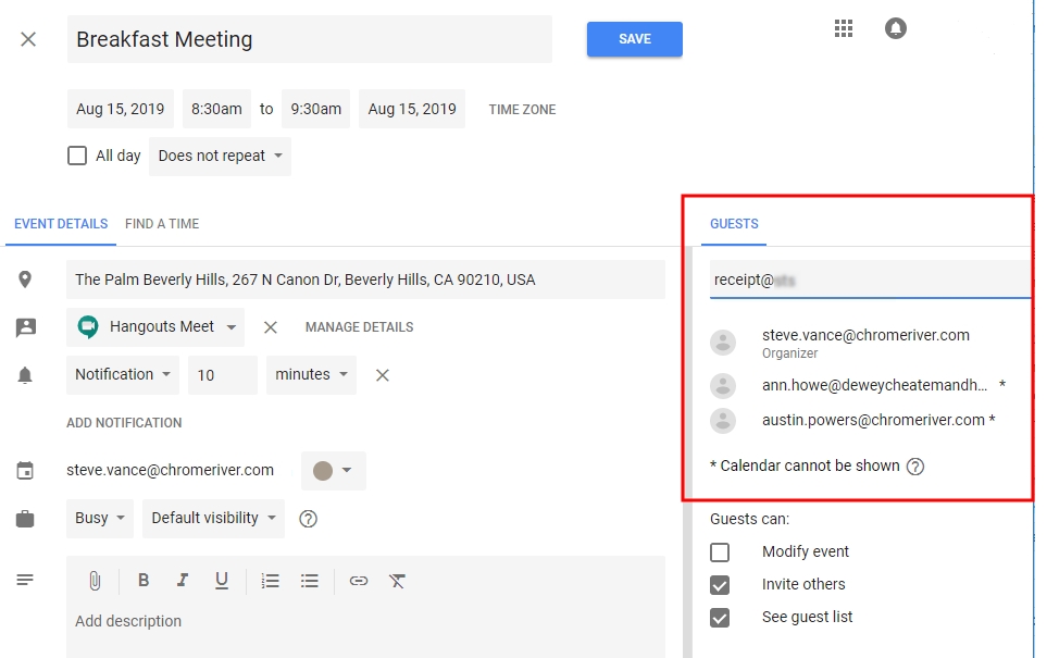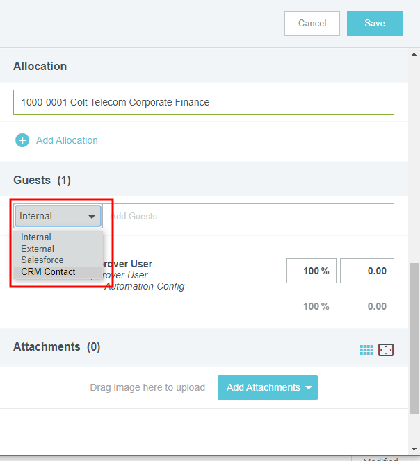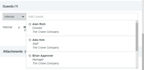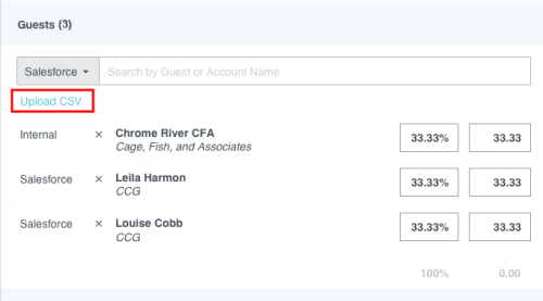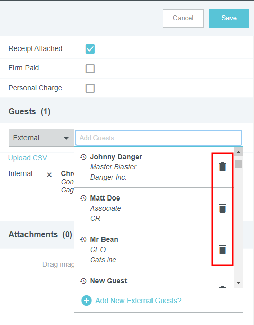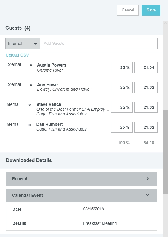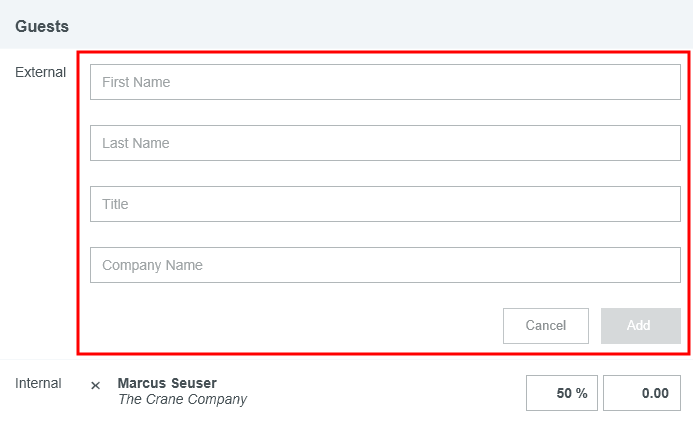 Gast-Ausgaben zu einem Bericht hinzufügen Bei einigen Ausgabenpositionen wie Mahlzeiten und Veranstaltungen können Sie zwischen Teilnehmern Ihres Unternehmens und Gästen unterscheiden. Wenn Sie bereits mit der Funktion Belegpositionen zu einer Reisekostenabrechnung zuordnen vertraut sind, werden Sie feststellen, dass die Gastauswahl ähnlich verläuft. Die Gastauswahl wird unten im Ausgaben-Eingabefenster angezeigt. Der Reisende wird automatisch als Gast hinzugefügt, um zu vermeiden, dass die Person doppelt gezählt wird. Interne Gäste Als interne Gäste zählen alle Benutzer von Emburse Expense Enterprise innerhalb Ihres Unternehmens. Emburse Enterprise identifiziert automatisch interne Gäste, die in der InterAction-Datenbank aufgeführt sind, und fügt sie automatisch Belegpositionen hinzu. Sie sind durch eine CRM-Nummer unterscheidbar. Um interne Gäste ohne InterAction zu einer Belegposition hinzuzufügen, klicken Sie auf das Feld Gäste, um das Gastauswahlfenster zu öffnen. Kürzlich ausgewählte Gäste erscheinen zuerst in der Liste. Wenn Sie in der Suchleiste einen Namen eingeben, erscheint im unteren Teil des Bildschirms eine Liste aller Gäste. Sie können die Liste mithilfe der Scroll-Leiste durchsuchen. Klicken Sie dann auf den gewünschten Namen, um diesen auszuwählen. Externe Gäste Alle anderen Gäste, die keine Benutzer von Emburse Enterprise innerhalb Ihres Unternehmens sind, gelten als externe Gäste. Für externe Gäste, die bereits im System hinterlegt sind, verläuft die Suche wie oben beschrieben. Kürzlich ausgewählte Gäste sind dabei mit einem Uhr-Symbol markiert. Neue Gäste hinzufügen Wenn ein externer Gast noch nicht im System hinterlegt ist, wählen Sie + NEUEN EXTERNEN GAST HINZUF.. Es erscheinen mehrere Felder, in denen Sie die Angaben des Gastes eintragen können. Je nach den Vorgaben Ihres Unternehmens kann es sein, dass Sie HINZUFÜGEN erst auswählen können, nachdem alle Felder ausgefüllt sind. Externe Gäste aus dem Verlauf löschen Sie können externe Gäste aus dem Dropdown-Menü für die Gastauswahl löschen, um die Liste der potenziellen Gäste zu optimieren und zu verkürzen. Klicken Sie einfach auf das Papierkorb-Symbol neben den Namen externer Gäste, um diese aus der Liste zu entfernen. Andere Gasttypen Je nach Konfiguration Ihres Unternehmens werden Ihnen möglicherweise andere Typen von Gästen im Dropdown-Menü der Gastauswahl angezeigt. Diese werden durch eine Integration mit dem CRM-System Ihres Unternehmens bereitgestellt und können andere Labels als die unten abgebildeten Beispiele haben. Wählen Sie den entsprechenden Typ aus, um auf die Liste der Gästekontakte Ihres Unternehmens zuzugreifen. Gäste-Hochladefunktion Bei großen Gästegruppen können Sie über die Gäste-Hochladefunktion von Emburse Enterprise eine Liste von Gästen direkt in die Abrechnung hochladen, statt die Angaben für jeden Gast manuell einzugeben. Bitte beachten Sie, dass mit dem Hochladen der Datei alle bereits in der Ausgabe hinterlegten Gastinformationen überschrieben werden. 1. Erstellen Sie eine CSV-Datei mit den Namen der internen Gäste und den Namen, Titeln und Unternehmen aller externen Gäste. Bei internen Gästen müssen Sie nur den Anmeldenamen oder die primäre E-Mail-Adresse des Emburse Enterprise-Kontos angeben. Sie können optional auch den ausgegebenen Betrag für jeden Gast angeben. Wenn Sie keine Beträge angeben, wird die Ausgabe-Belegposition zu gleichen Teilen auf alle Gäste aufgeteilt. Geben Sie keine Kommata in der CSV-Datei ein, das führt zum Fehler „Ungültiges Dateiformat“. Hier finden Sie eine Muster-CSV-Datei, die Sie individuell anpassen können. Anmeldename Vorname Nachname Titel Unternehmen Betrag svance 10,00 akram 10,00 Elrod Stooble Partner Dewey Cheatem & Howe 20,00 Hermione Anenome Partner Dewey Cheatem & Howe 20,00 2. Klicken Sie im Bereich Gäste des Eingabefensters für Ausgaben auf CSV HOCHLADEN, um die CSV-Datei anzuhängen. 3. Anschließend müssen Sie bestätigen, dass Sie alle in der Abrechnung vorhandenen Gäste überschreiben wollen. Klicken Sie auf HOCHLADEN. 4. Falls die Datei ungültig ist oder bestimmte Spalten korrigiert werden müssen, erhalten Sie eine Fehlermeldung. Zuordnung Das System teilt die Kosten automatisch gleichmäßig auf die Gäste auf, sodass 100 % des Gesamtbetrags zugeordnet werden. Sie können den Anteil oder die Beträge für jeden einzelnen Teilnehmer individuell anpassen und so Ausgabenanteile neu zuordnen. Im unteren Bereich wird die Gesamtprozentzahl in Grau angezeigt, sodass Sie sicher sein können, dass der angepasste Betrag 100 % ergibt. Sie sollten die manuelle Aufteilung erst vornehmen, nachdem Sie alle Gäste hinzugefügt haben, da der Betrag immer wieder gleichmäßig aufgeteilt wird, wenn ein neuer Gast hinzugefügt wird. Es ist sogar möglich, einem oder mehreren Gästen einen Betrag von 0,00 zuzuweisen, solange die Beträge der anderen Gäste 100 % des Gesamtbetrags für diese Ausgabe ausmachen. Gast-Ausgaben von Meetings erstellen Sie können Gäste, die an Geschäftsessen und Konferenzen teilnehmen, automatisch importieren, indem Sie Emburse Enterprise in einer Kalender-App, die ICS-Dateien unterstützt, wie Gmail oder Outlook als Teilnehmer „einladen“. Sobald Emburse Enterprise die eigentliche Ausgabe erhält, können Sie das Kalenderereignis mit der Kreditkartentransaktion oder dem Beleg zusammenführen, um Felder automatisch mit Daten über Gäste auszufüllen. Die App kann bei der Erstellung der Ausgabenposition sogar zwischen internen und externen Gästen unterscheiden. Die Ausgabendetails werden automatisch durch die vorhandene Beleg- oder Kreditkartenposition ausgefüllt. 1. Fügen Sie Emburse Enterprise zum ICS-Kalenderereignis hinzu, indem Sie eine Einladung an dieselbe E-Mail-Adresse senden, die Sie zum Einreichen von Belegen verwenden. (Weitere Details dazu finden Sie hier: Ausgabenpositionen per E-Mail erstellen.) 2. Gehen Sie zum Offline-Abs