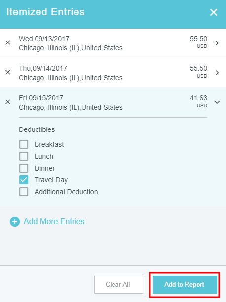Tagespauschale mit Vor.-Genehm. Ihr Unternehmen kann den Standard-Tagespauschalausgaben-Assistenten von Emburse Enterprise zum Menü für Vor-Genehmigungseinträge hinzufügen. Mit dem Assistenten lassen sich ganz einfach Tagespauschalbeträge zu Vor-Genehmigungsanfragen hinzufügen, indem sie automatisch basierend auf Daten und Orten berechnet werden. Tagespauschalausgaben-Assistent 1. Klicken Sie im Fenster Vor-Genehmigungstypen hinzufügen auf TAGESPAUSCHALE ASSISTENT. 2. Geben Sie das Startdatum und das Enddatum ein. Die Anzahl der Tage wird automatisch berechnet. 3. Wählen Sie den Ort aus. Unter Umständen hat sich Ihr Unternehmen dafür entschieden, statt bestimmter Sätze für einzelne Städte nur Sätze für In- und Ausland anzubieten. 4. Klicken Sie auf EINTRÄGE HINZUF., wenn Sie alle nötigen Details eingegeben haben. 5. Im Fenster Einzeln aufgeführte Einträge können Sie Abzüge wählen oder weitere Einträge hinzufügen. Wenn Sie fertig sind, klicken Sie auf ZUR AUSL. HINZUF.. War dieser Beitrag hilfreich? Ja Nein