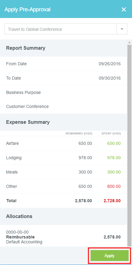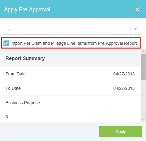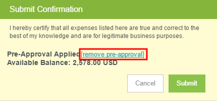 Eine Vorabgenehmigung an eine Spesenabrechnung anhängen Sie können eine neue Reisekostenabrechnung während des Erstellungsprozesses jederzeit mit einer Vorabgenehmigung verknüpfen. Dadurch haben Sie die Möglichkeit, tatsächliche Ausgaben mit vorab genehmigten Beträgen zu vergleichen, bevor Sie die Reisekostenabrechnung einreichen. Ausgabentyp-Mapping für Vor-Genehmigungen Wenn Ihre Organisation das Ausgabentyp-Mapping für Vor-Genehmigungen eingeführt hat, können Sie nur genehmigte Vor-Genehmigungsbeträge für die Ausgabentypen übernehmen, die Sie ursprünglich in Ihrer Vor-Genehmigungsanfrage aufgeführt haben. Wenn Sie beispielsweise eine Vor-Genehmigung für Ausgaben in Höhe von 500 US-Dollar für Flüge und 500 US-Dollar für eine Hotelunterkunft erhalten haben, Ihre Reisekostenabrechnung jedoch 500 US-Dollar für Flüge, 400 US-Dollar für Hotels und 100 US-Dollar für Transportspesen umfasst, können Sie nur die Vor-Genehmigung für 500 US-Dollar Flugkosten und 400 US-Dollar Hotelkosten nutzen, wodurch ein Saldo von 100 US-Dollar in der Vor-Genehmigungsanfrage verbleibt. Eine Ausgabe aus einer genehmigten Vorabgenehmigung erstellen Wenn Ihr Unternehmen diese Funktion aktiviert hat, können Sie die Angaben aus einer bereits genehmigten Vor-Genehmigung importieren, um ein automatisches Ausfüllen einiger mit dieser Vor-Genehmigung verbundenen Header-Felder für die neu zu erstellende Ausgabe zu ermöglichen. 1. Klicken Sie auf die Schaltfläche IMPORT BEI VOR-GENEHMIGUNG im Ausgaben-Header, wenn Sie eine neue RKA erstellen. 2 Wählen Sie die gewünschte Vorabgenehmigung aus der Liste der genehmigten Vorabgenehmigungen aus. Somit werden die Angaben aus dem Header der Vorabgenehmigung in das Ausgabe-Eingabefenster importiert. 3 Wenn Sie auf ERSTELLEN klicken, werden zudem alle Belegpositionsangaben der Vorabgenehmigung zu der Reisekostenabrechnung hinzugefügt, wodurch Sie deutlich weniger Informationen manuell eingeben müssen. Vorabgenehmigungen anhängen 1. Erstellen Sie eine Reisekostenabrechnung, die die tatsächlichen mit der Vorabgenehmigung verbundenen Ausgabenbeträge beinhaltet. Wenn der Entwurf der Reisekostenabrechnung eingereicht werden kann, klicken Sie gegebenenfalls auf den Header, um die Vorschau zu öffnen, und anschließend auf VOR.-GENEHM.-AUSGABE HINZUFÜGEN. 2 Öffnen Sie im Fenster „Vor.-Genehm. übernehmen“ das Dropdown-Menü Vor.-Genehm.-Ausgabe auswählen und treffen Sie die entsprechende Auswahl. Es werden nur Vorabgenehmigungsanfragen angezeigt, die in der gleichen Währung sind wie die Reisekostenabrechnung, die Sie erstellen. Sie können den Währungscode für die RKA nicht mehr ändern, nachdem Sie eine Vorabgenehmigung angehängt haben. 3 Wenn Ihr Unternehmen diese Funktion aktiviert hat, haben Sie die Option, Belegpositionen für Tagespauschale und Fahrtkosten aus der Vor-Genehmigung zu importieren, die Sie per Kontrollkästchen gewählt haben. 4. Stellen Sie sicher, dass sich alle mit der Vor-Genehmigung verbundenen Ausgaben in der RKA befinden. Eine Vorabgenehmigung kann nur einmal genutzt werden, sofern Ihr Unternehmen keine anderen Einstellungen vorgenommen hat. In der Ausgabenübersicht werden die verbleibenden Beträge für alle Ausgabentypen angezeigt. Der ausgegebene Betrag wird grün dargestellt, wenn er den ursprünglich genehmigten Betrag nicht übersteigt. Andernfalls wird er in Rot angezeigt. Klicken Sie auf ÜBERNEHMEN, um die Anfrage an Ihre Reisekostenabrechnung anzuhängen. 5. Sie werden aufgefordert zu bestätigen, dass die Ausgaben korrekt sind. Im Fenster „Bestätigung einreichen“ sehen Sie den Gesamtbetrag, der noch aus der Vorabgenehmigung verfügbar ist. Wenn Sie die Vorabgenehmigungsanfrage entfernen, bevor Sie Ihre Reisekostenabrechnung einreichen, können Sie eine andere Vorabgenehmigung anhängen, indem Sie im Fenster „Bestätigung einreichen“ VOR.-GENEHMIGUNG auswählen. 6. Wenn die richtige Vor-Genehmigungsanfrage angehängt wurde, klicken Sie auf SENDEN. Angehängte vorab genehmigte Ausgaben anzeigen Um die Details einer vorab genehmigten Ausgabe einzusehen, die mit einer RKA verknüpft ist, wählen Sie den PDF-Download-Button neben dem Namen der auf die RKA angewandte vorab genehmigten Ausgabe. So können Sie ganz einfach die ursprüngliche Vorabgenehmigung mit der verknüpften Reisekostenabrechnung vergleichen. Vorabgenehmigungen entfernen Vor-Genehmigungen werden von jeder gelöschten Reisekostenabrechnung getrennt, sodass Benutzer sie bei Bedarf wieder an einen neuen Bericht anhängen können. Beachten Sie, dass, wenn eine Reisekostenabrechnung mit beigefügter Vor-Genehmigung zurückgerufen oder zurückgesetzt wird, die Vor-Genehmigung dem Bericht beigefügt bleibt. War dieser Beitrag hilfreich? Ja Nein