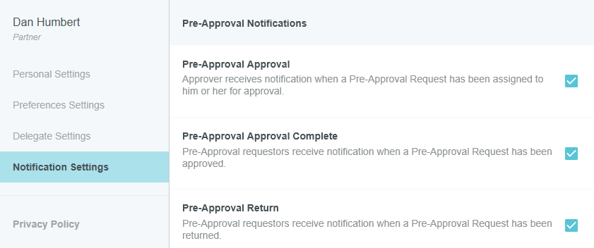 Vor-Genehmigungs-E-Mail-Benachrichtigungen Emburse Enterprise-Benutzer können sich für unternehmensspezifische E-Mail-Benachrichtigungen von Emburse Enterprise anmelden. Einstellungen für E-Mail-Benachrichtigungen können im Menü Benutzer über EINSTELLUNGEN eingerichtet werden. Klicken Sie auf BENACHRICHTIGUNGSEINSTELLUNGEN und markieren Sie die blauen Kästchen neben den Benachrichtigungen, die Sie erhalten möchten. VOR-GENEHMIGUNGS-E-Mail-Benachrichtigungen Name Betreffzeile Beschreibung Empfänger Vor-Genehmigung erfolgreich genehmigt „Emburse Enterprise Pre-Approval – Anfrage genehmigt“ Der Ersteller von Vor-Genehmigungen erhält eine Benachrichtigung, wenn eine Vor-Genehmigungsanfrage von allen zugewiesenen Genehmigern genehmigt wurde. Reisender, Ersteller Genehmigung der Vor-Genehmigung „Emburse Enterprise Pre-Approval – Anfrage [Name des Erstellers]“ Ein Genehmiger erhält eine Benachrichtigung, wenn ihm ein Antrag auf Vor-Genehmigung zur Genehmigung zugewiesen wurde. Genehmiger Rücksendung der Vor-Genehmigung Rücksendung „Emburse Enterprise Pre-Approval – Anfrage zurückgegeben“ Der Ersteller der Vor-Genehmigung und der Reisende erhalten eine Benachrichtigung, wenn eine Anfrage zur Vor-Genehmigung zurückgesandt wurde. Reisender, Ersteller War dieser Beitrag hilfreich? Ja Nein