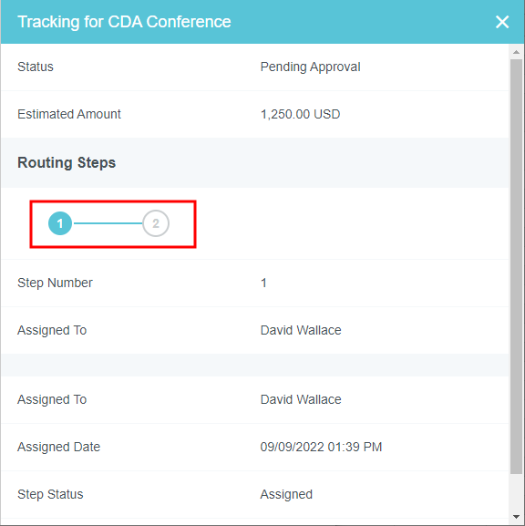 Vor.-Genehm. nachverfolgen Um Ihre eingereichte Vor-Genehmigungsanfrage nachzuverfolgen, klicken Sie auf IN DEN LETZTEN 90 TAGEN EINGEREICHT im Vor-Genehmigungsbereich des Dashboards. Um von anderen Orten in der Benutzeroberfläche auf Ihre eingereichten Vor-Genehmigungen zuzugreifen, klicken Sie auf den MENÜ-Button und anschließend auf VOR KURZEM EINGEREICHT im Abschnitt Vor-Genehmigung des Dropdown-Menüs. Suchen Sie die Vor-Genehmigung in der Liste und klicken Sie darauf, um sie in der Vorschau anzuzeigen. Klicken Sie dann auf die drei Punkte und wählen Sie NACHVERFOLGUNG im Dropdown-Menü. Auf Breitbildgeräten sehen Sie die Schaltfläche NACHVERFOLGUNG statt der drei Punkte. Sie können die Vor-Genehmigungsanfrage im Nachverfolgungsmenü verfolgen, zum Beispiel, wem sie zugewiesen wurde, die jeweiligen Routingregeln, die voraussichtlichen Routingschritte und ihren Status bei jedem Schritt. Wenn mehrere Routingschrittnummern angezeigt werden, können Sie jede davon anklicken, um Details für den jeweiligen Schritt anzuzeigen. Klicken Sie oben rechts auf das X, um zur Vorschau für diese Vor-Genehmigung zurückzukehren. War dieser Beitrag hilfreich? Ja Nein