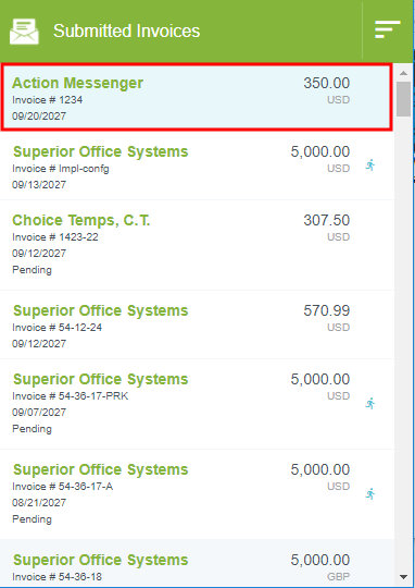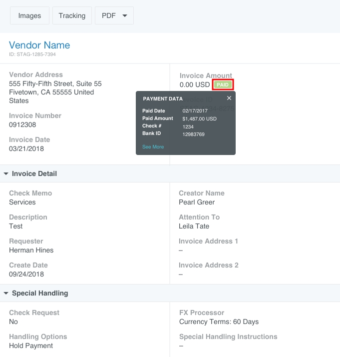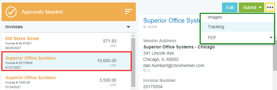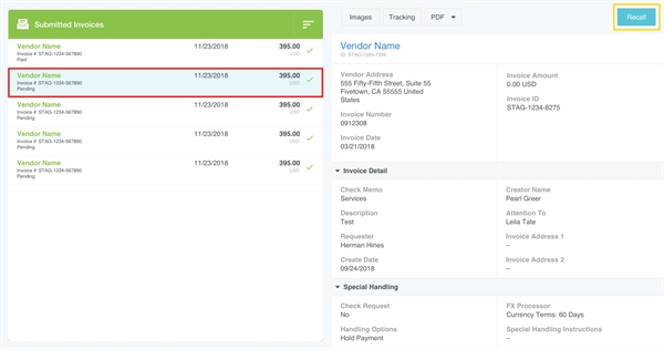 Rechnungsrouting-Nachverfolgung Über das Nachverfolgungsmenü können Sie sehen, wo sich eine Rechnung im Genehmigungsvorgang befindet, und die Änderungen daran nachverfolgen. Sie erreichen das Menü über die Menüs Eingereichte Rechnungen oder Genehmigungen erforderlich. Zugriff über ein Breitbildgerät Klicken Sie auf die Rechnung, die Sie nachverfolgen möchten, und klicken Sie anschließend auf NACHVERFOLGUNG im Vorschaubereich. Im Menü Genehmigungen erforderlich müssen Sie Ihr Browser-Fenster möglicherweise verbreitern, damit die Schaltfläche NACHVERFOLGUNG zu sehen ist, oder auf die drei Punkte klicken, um sie im Dropdown-Menü anzuzeigen. Zugriff über ein Gerät mit schmalem Bildschirm Klicken Sie auf die Rechnung, die Sie nachverfolgen möchten. Die Vorschau ersetzt das Menü Eingereichte Rechnungen bzw. Genehmigungen erforderlich. Klicken Sie auf die drei Punkte und anschließend auf NACHVERFOLGUNG im Dropdown-Menü. Rechnungsnachverfolgung Das Nachverfolgungsmenü zeigt alle aktuellen Schritte des Genehmigungsrouting-Vorgangs an sowie Routing-Regel oder -Grund für diesen Schritt. Wenn diese Ansicht leer ist, hat die Rechnung das gesamte Genehmigungsrouting erfolgreich abgeschlossen und befindet sich im Status „Genehmigt“, „Exportiert“, „Bezahlt“ oder „Teilweise bezahlt“. Klicken Sie auf ZUKÜNFT. ANZEIGEN, um den künftigen Routingpfad der Rechnung zu sehen. Klicken Sie auf PROGNOSE AUSBLENDEN, um den künftigen Pfad auszublenden. Klicken Sie auf einen Routingschritt, um die vollständigen Details über diesen Schritt anzuzeigen. Bezahlte Rechnungsdaten anzeigen Sehen Sie sich Details über Rechnungszahlungen an, indem Sie auf das Label „Bezahlt“, „Teilweise bezahlt“ oder „Exportiert“ neben dem Rechnungsbetrag in der Vorschau für bezahlte Rechnungen klicken. Im neuen Pop-up-Fenster sehen Sie Daten wie das Zahlungsdatum, den bezahlten Betrag, die Schecknummer und die Bank-ID. Rechnung zurückrufen Mit der Funktion „Rechnungs-Routing zurückrufen“ können die Ersteller und Anforderer von Rechnungen ausstehende Rechnungen zurückrufen, die in der Liste „Eingereichte Rechnungen“ oder im Bericht „Meine Rechnungsanfragen“ erscheinen. Das Zurückrufen einer Rechnung hat zur Folge, dass das Routing zurückgesetzt wird und die Rechnung in die Liste „Genehmigungen erforderlich“ des Erstellers oder Anforderers verschoben wird. Jegliche zuvor hinzugefügte Vermerke bleiben jedoch bestehen. Beachten Sie bitte, dass nur ausstehende Rechnungen zurückgerufen werden können; vollständig genehmigte Rechnungen können nicht zurückgerufen werden. Falls Ihr Unternehmen den Rückruf von Reisekostenabrechnungen unterstützt, wird diese Funktion bei der Auswahl einer zulässigen Reisekostenabrechnung aktiviert. 1. Klicken Sie auf die ausstehende Rechnung in der Liste „Eingereichte Rechnungen“ und klicken Sie danach in der Vorschau auf ZURÜCKRUFEN. 2 Klicken Sie im Popup-Bestätigungsfenster auf ZURÜCKRUFEN, und die betroffene Rechnung wird in Ihre Liste „Genehmigungen erforderlich“ verschoben. War dieser Beitrag hilfreich? Ja Nein