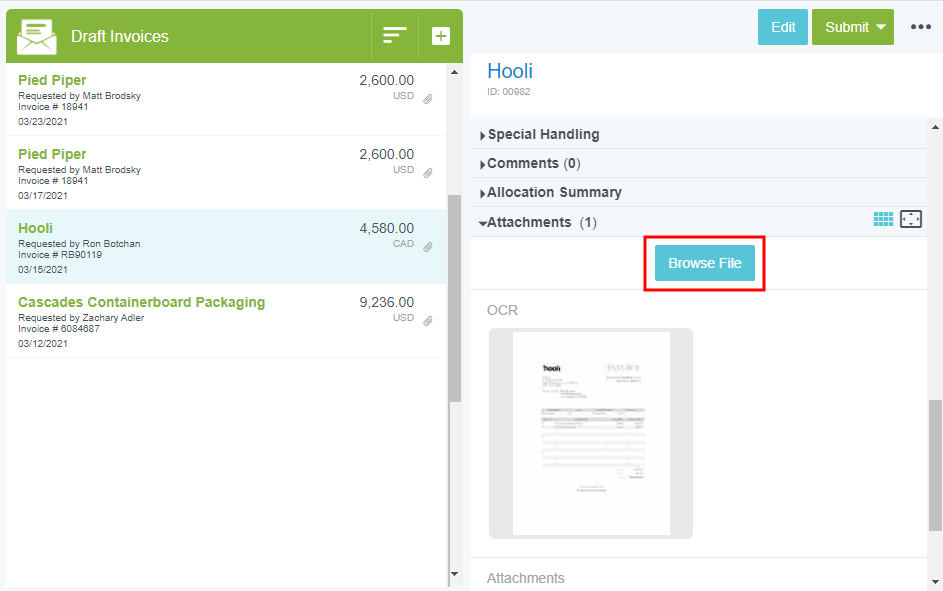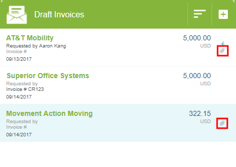 Rechnungsbilder hinzufügen Sie können einer Rechnung während der Erstellung oder jederzeit danach Bilder anhängen. Sie können auch eine neue Rechnung per Fax oder eingescanntem E-Mail-Anhang mit Deckblatt erstellen. Beachten Sie, dass Bilder nicht aus Rechnungen mit dem Status „Exportiert“ oder „Bezahlt“ gelöscht werden dürfen. Wenn ein Bild über die Emburse Enterprise-App angehängt wird, sind nur JPG-, PDF- und PNG-Dateien von bis zu 10 MB zulässig. Bilder, die über oder per Scannen oder Faxen hinzugefügt wurden, dürfen eine Gesamtgröße von 100 MB nicht überschreiten. Weitere Details dazu finden Sie unter Rechnungsbildspezifikationen. Rechnungen mit mehr als einem angehängten Bild haben in der Liste „Rechnungsentwürfe“ ein Büroklammer-Symbol. Bilder aus der App hinzufügen Sie können einer Rechnung während ihrer Erstellung oder Bearbeitung direkt Bilder anhängen. Sie können Bilder auch direkt aus der Vorschau in den Menüs „Rechnungsentwürfe“ und „Eingereichte Rechnungen“ anhängen, ohne die Rechnung zu öffnen. Tippen Sie auf DATEI SUCHEN, um das Bild der Rechnung hochzuladen. Auf Desktop-Computern können Sie das Bild einfach an eine beliebige Stelle im Vorschaubereich ziehen, um es hochzuladen. Gescannte Bilder mit Deckblatt per Fax oder E-Mail anhängen Um Bilder per Fax oder E-Mail an eine bestehende Rechnung anzuhängen, können Sie in dieser Rechnung oder ihrer Vorschau ein Deckblatt erstellen. Um eine neue Rechnung zu erstellen, indem Sie ein Bild faxen oder scannen und per E-Mail versenden, können Sie über das Dropdown-Menü „User“ (Benutzer), auf das Sie überall in Emburse Enterprise zugreifen können, ein allgemeines Deckblatt generieren. ÜBER DAS DECKBLATT EINER BESTEHENDEN RECHNUNG Mit dieser Methode können Sie ein Bild oder auch mehrere Bilder an eine bestehende Rechnung anhängen. Neue Bilder werden an vorhandene Bilder angefügt, statt sie zu überschreiben. 1. Klicken Sie in der Rechnung oder ihrer Vorschau auf PDF (Breitbildgerät) oder das Symbol mit den drei Punkten (Geräte mit schmalem Bildschirm) und wählen Sie in der Dropdown-Liste DECKBLATT. Dies generiert ein Rechnungsdeckblatt mit einem einmaligen Rechnungs-ID-QR-Code, der das Bild beim Upload zur richtigen Rechnung leitet. Geräte mit schmalem Bildschirm Breitbildgeräte 2. Legen Sie das Deckblatt auf das/die Rechnungsbild(er) und befolgen Sie die Anweisungen auf dem Deckblatt, um die Bilder per Fax oder eingescanntem E-Mail-Anhang einzureichen. 3. Sie erhalten eine Bestätigung per E-Mail, wenn die Belege erfolgreich eingereicht wurden. Im Falle einer fehlgeschlagenen Einreichung erhalten Sie eine detaillierte Fehlermeldung. ÜBER EIN ALLGEMEINES DECKBLATT Mit dieser Methode können Sie eine oder mehrere Rechnungen zur Erstellung als neue Rechnungseinträge, ie in Ihren Rechnungsentwürfen erscheinen, einreichen. 1. Klicken Sie in der App auf Ihren Benutzernamen und wählen Sie im Dropdown-Menü NEUES RECHNUNGSDECKBLATT DRUCKEN aus. In einer neuen Registerkarte wird ein wiederverwendbares Rechnungsdeckblatt erzeugt. 2. Legen Sie das Deckblatt auf das Rechnungsbild und befolgen Sie die Anweisungen auf dem Deckblatt, um das Bild per Fax oder eingescanntem E-Mail-Anhang an die Nummer bzw. E-Mail auf dem Deckblatt einzureichen. Um mehrere neue Rechnungen zu einzureichen, erstellen Sie mehrere Kopien des Deckblatts und verwenden Sie diese als Trennseiten zwischen den Rechnungen. Sie erhalten eine Bestätigung per E-Mail, wenn die Belege erfolgreich eingereicht wurden. Im Falle einer fehlgeschlagenen Einreichung erhalten Sie eine detaillierte Fehlermeldung. Bilder per E-Mail hinzufügen – Ohne Deckblatt Je nach Konfiguration von Emburse Invoice Enterprise in Ihrem Unternehmen können Sie unter Umständen neue Rechnungen erstellen, indem Sie PDF-Dateien ohne Deckblatt per E-Mail weiterleiten. Weitere Details dazu finden Sie unter Rechnungen per E-Mail erstellen. War dieser Beitrag hilfreich? Ja Nein