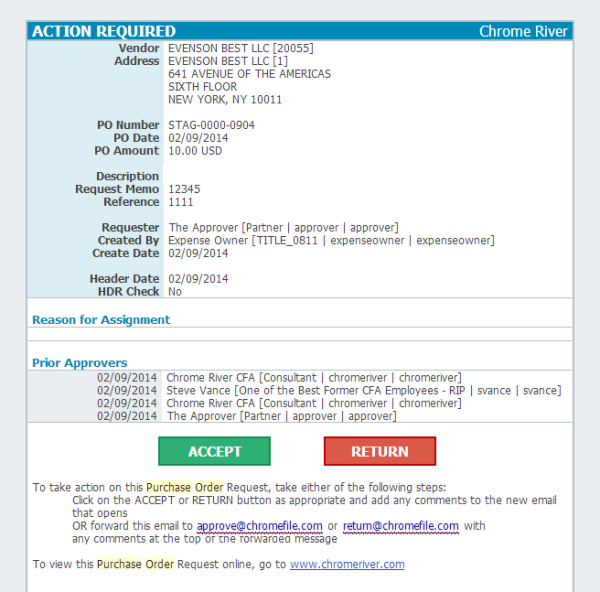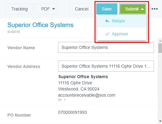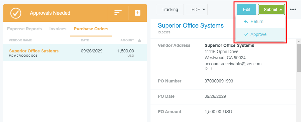 Genehmigen von Bestellungen in Emburse Enterprise oder per E-Mail Wenn Sie Teil des Genehmigungsvorgangs sind und Bestellungen auf Ihre Genehmigung warten, erscheint auf dem Dashboard eine gelbe Benachrichtigungsleiste. Sie können Bestellungen entweder in der App oder per E-Mail genehmigen oder zurücksenden. Auf Genehmigungen zugreifen Klicken Sie im Startbildschirm auf die Anzahl an Bestellungen, deren Genehmigung noch aussteht, um zum Genehmigungen-Dashboard zu gelangen. Klicken Sie von jeder beliebigen anderen Stelle in der App auf das Symbol Menü oben links und anschließend auf BESTELLUNG in der Liste „Genehmigungen“. Die Anzahl der ausstehenden Genehmigungen wird in dem gelben Kreis angezeigt. Sie können eine Bestellung sofort genehmigen oder zurücksenden, und zwar direkt im Menü „Genehmigungen erforderlich“. 1. Klicken Sie auf eine der in der Liste aufgeführten Bestellungen, um eine Vorschau anzuzeigen. 2. Klicken Sie auf die Schaltfläche SENDEN und wählen Sie RÜCKSENDUNG oder GENEHMIGEN. Genehmigungen sortieren und filtern Die Liste „Genehmigungen erforderlich“ zeigt alle Bestellungen an, die noch auf Ihre Genehmigung warten. Tippen Sie auf die SORT-Schaltfläche oben rechts, um die Liste nach Bestelldatum, Bestellnummer, Betrag oder Lieferant zu sortieren. Über die SORT-Schaltfläche können Sie außerdem auf Filter zugreifen. Sie können Ihre Genehmigungen nach den von Ihrem Unternehmen festgelegten Kriterien filtern. Dieses Symbol kennzeichnet eine Bestellung, die mit einem temporären Lieferanten angelegt wurde. Je nach Konfiguration Ihres Unternehmens können Sie möglicherweise direkt im Genehmigungen-Dashboard mehrere Bestellungen auf einmal genehmigen oder zurücksenden, indem Sie die Kontrollkästchen neben den gewünschten Bestellungen aktivieren und auf SENDEN und anschließend auf GENEHMIGEN oder RÜCKSENDUNG klicken. Eine Bestellung aufrufen Klicken Sie auf eine Bestellung in der Liste „Genehmigungen erforderlich“, um sie in der Vorschau anzuzeigen, und klicken Sie dann auf BEARBEITEN in der oberen linken Ecke der Vorschau, um die Details vor der Genehmigung oder Rücksendung zu bearbeiten. Je nach den Konfigurationseinstellungen Ihres Unternehmens können Sie eventuell nur Kommentare und/oder Bilder vor der Genehmigung oder Rücksendung der Rechnung hinzufügen. Wenn Sie auf SPEICHERN klicken, werden Ihre Änderungen gespeichert, ohne dass die Bestellung sofort genehmigt oder zurückgesandt wird. Genehmigung über die App Klicken Sie auf SENDEN und anschließend auf GENEHMIGEN. Ihr Unternehmen bestimmt, ob Sie die Möglichkeit haben, einen zusätzlichen Prüfer aus der Dropdown-Liste auszuwählen, und ob ein Kommentar optional ist. Klicken Sie auf GENEHMIGEN. Rücksendung über die App Klicken Sie auf SENDEN und anschließend auf RÜCKSENDUNG. Im nächsten Schritt müssen Sie die Person oder die Gruppe auswählen, an die Sie die Bestellung zurücksenden möchten. Geben Sie den erforderlichen Kommentar zur Rücksendung ein und klicken Sie auf RÜCKSENDUNG, um die Bestellung abzuschicken. Andere Genehmigungsaktionen Verwenden Sie die Schaltflächen am oberen Rand des Vorschaubildschirms, um auf andere Aktionen zuzugreifen. Beachten Sie, dass sich bestimmte Aktionen unter der Schaltfläche mit den drei Punkten befinden können. Nachverfolgung: Folgen Sie dem gesamten Laufgang der Bestellung durch den Genehmigungsrouting-Vorgang. PDF: Klicken Sie auf den Pfeil, um unterschiedliche Versionen des PDF-Berichts der Bestellung anzuzeigen: Bestellungsbericht Vollständiger Bericht Vorherige Bestellung: Zugehörige vorherige Bestellungen anzeigen. Audit Auditverlauf der Bestellung anzeigen. Per E-Mail genehmigen oder zurücksenden Sie erhalten außerdem eine E-Mail-Benachrichtigung für jede Bestellanforderung, die Ihrer Zustimmung bedarf. Sie können AKZEPTIEREN auswählen, um Bestellungen zu genehmigen, oder RÜCKSENDUNG, um sie mit Fragen oder Kommentaren an den Ersteller zurückzusenden, indem Sie die E-Mail einfach weiterleiten. Dies kann von jedem E-Mail-System und jeder Software aus erfolgen, auch von Smartphones und Tablets aus. Wenn Sie Apple Mail unter iOS 26.1 verwenden, funktioniert das Auswählen der Schaltflächen Akzeptieren oder Rücksendung in Genehmigungs-E-Mails möglicherweise nicht wie erwartet. Stattdessen halten Sie die jeweilige Schaltfläche gedrückt und wählen anschließend im Menü „E-Mail“, um die Aktion erfolgreich abzuschließen. Akzeptieren: Leitet die Bestellungs-E-Mail, die Sie erhalten haben, an approve@chromefile.com weiter. Rücksendung Leitet die Bestellungs-E-Mail, die Sie erhalten haben, an return@chromefile.com weiter. Alle Kommentare, die Sie in die weitergeleitete Nachricht eingeben, werden automatisch in den Abschnitt „Notizen“ der Bestellung eingefügt. War dieser Beitrag hilfreich? Ja Nein