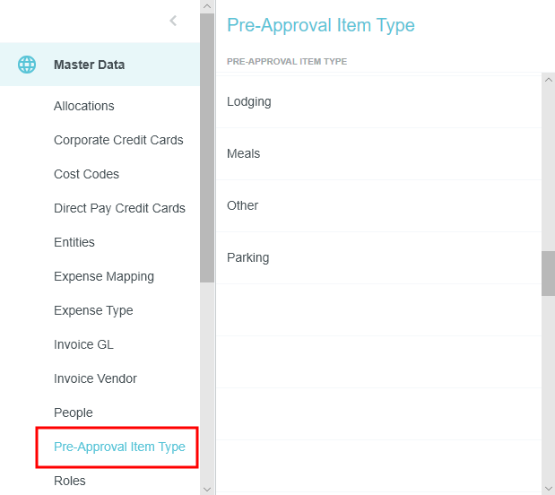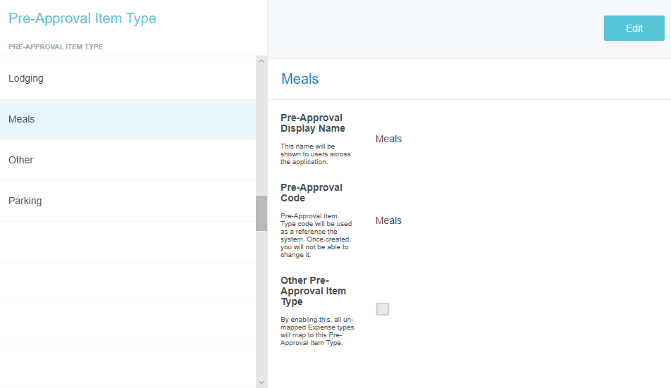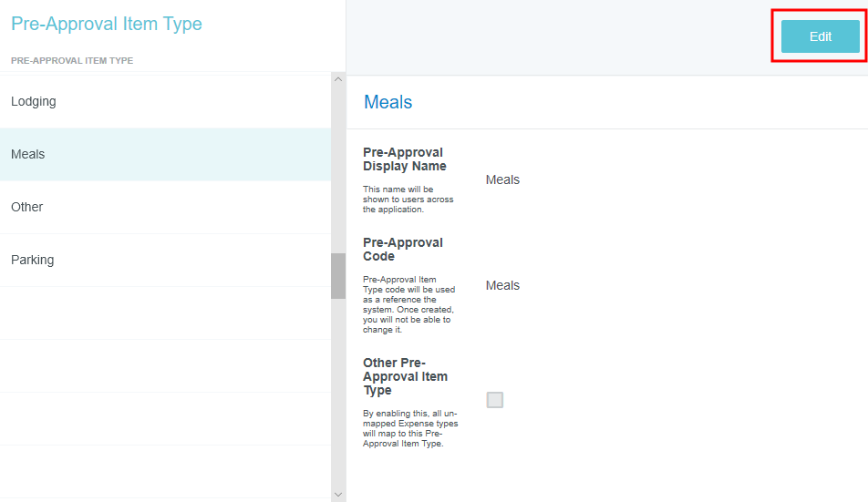 Bildschirm Vor-Genehmigungs-Positionstyp Admin Im Verwaltungsmenü des Vor-Genehmigungs-Positionstyps können Sie den Vor-Genehmigungs-Positionstypen Standard-Kostencodes zuordnen und die Codes der Händlereinschränkungskategorien den Ausgabentypen für Emburse-Karten zuordnen. Klicken Sie auf ADMIN-EINSTELLUNGEN > STAMMDATEN > VOR-GENEHMIGUNGS-POSITIONSTYP. Vorschau Vor-Genehmigungs-Positionstyp Wenn Sie auf einen Vor-Genehmigungs-Positionstyp klicken, um ihn in der Vorschau anzuzeigen, sehen Sie den Anzeigenamen, den Vor-Genehmigungscode und ob es sich um den Standard-Positionstyp für alle nicht zugeordneten Ausgabentypen handelt oder nicht. Vor-Genehmigungs-Positionstyp bearbeiten 1. Wählen Sie den gewünschten Vor-Genehmigungs-Positionstyp und klicken Sie auf BEARBEITEN. 2 Hier können Sie den Anzeigenamen des Vor-Genehmigungs-Positionstyps ändern. Der neue Name wird automatisch überall dort aktualisiert, wo er referenziert wird, einschließlich anderer Verwaltungsbildschirme wie Mosaike & Kacheln& und Mosaike & Kacheln, und diese Änderung erfordert keine Aktualisierung Ihrer Exporte oder Geschäftsregeln. Wenn Sie den Namen auf der entsprechenden Kachel des Vor-Genehmigungs-Positionstyp in der Benutzerschnittstelle ändern möchten, müssen Sie dies im Mosaike & Kacheln Verwaltungsbildschirm tun. Der entsprechende Code für den Vor-Genehmigungs-Positionstyp darf nicht geändert werden. 3 Aktivieren Sie Andere Vor-Genehmigungs-Positionstypen, um diesen Positionstyp als Standard für alle nicht zugeordneten Ausgabentypen zu verwenden. 4. Klicken Sie auf SPEICHERN. Händlerkategorie-Codezuordnung für Emburse-Karten Kunden, die die Vorteile von Emburse-Karten nutzen, können je nach Händlerkategorie festlegen, für welche Ausgaben die Karten verwendet werden können. Wenn ein Kartenantrag genehmigt wurde, können Benutzer die Karte nur für Ausgaben verwenden, die unter die ausgewählten Händlerkategorien fallen. Die Einschränkungen gelten für die gesamte Vor-Genehmigung und nicht für die Beträge der einzelnen Belegpositionen. Derzeit können nur Karten, die von Emburse-Karten ausgegeben werden, auf eine bestimmte Händlerkategorie beschränkt werden. 1. Wählen Sie den gewünschten Vor-Genehmigungs-Positionstyp und klicken Sie im Abschnitt „Kreditkartentransaktionen“ auf BEARBEITEN. 2 Verwenden Sie das Dropdown-Menü, um einen Händlerkategorie-Code auszuwählen, der diesem Vor-Genehmigungs-Positionstyp zugeordnet werden soll. Sie können mehrere Codes zu einem einzigen Vor-Genehmigungs-Positionstyp hinzufügen. 3 Wenn Sie fertig sind, klicken Sie auf SPEICHERN. War dieser Beitrag hilfreich? Ja Nein