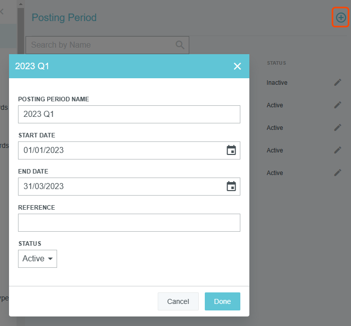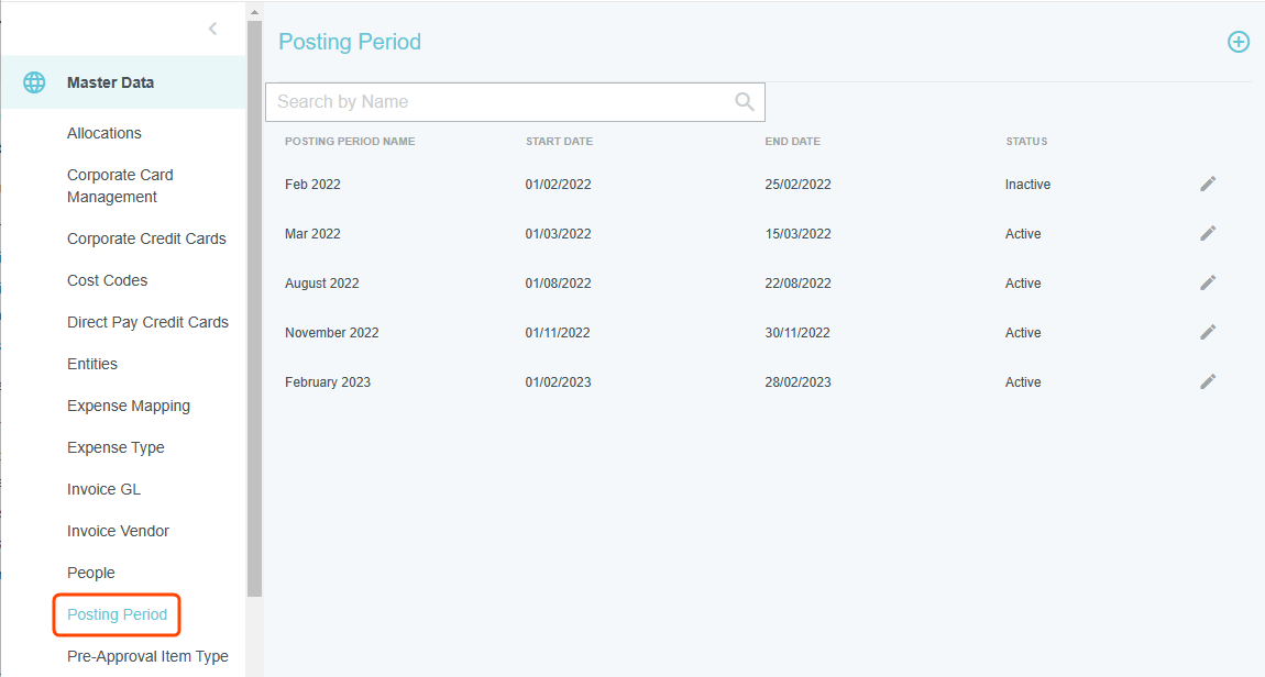 Verwaltungsmenü „Buchungszeitraum“ Wenn Ihr Unternehmen die Funktion Buchungszeitraum von Emburse Enterprise aktiviert hat, können Sie auf diesem Bildschirm Buchungszeiträume erstellen, ändern, aktivieren und deaktivieren, die Benutzer beim Erstellen neuer Rechnungen auswählen können. Der Begriff „Buchungszeitraum“ bezieht sich auf den Zeitraum, in dem eine Transaktion für Buchhaltungszwecke gebucht werden sollte. Dies kann dem Zeitraum entsprechen, in dem ein Kauf eingeleitet, eine Transaktion durchgeführt oder eine Bestellung erfüllt wurde – oder einem anderen von Ihrem Unternehmen festgelegten Zeitraum. Die Buchungszeiträume können Monate, Quartale, Jahre oder jede andere Zeiteinheit sein. Klicken Sie auf ADMIN-EINSTELLUNGEN > STAMMDATEN > BUCHUNGSZEITRAUM. Neuen Buchungszeitraum erstellen Die Buchungszeiträume müssen eindeutig benannt sein und sich gegenseitig ausschließen. Es ist nicht möglich, einen neuen Buchungszeitraum mit demselben Namen wie ein bestehender Buchungszeitraum oder mit Daten, die sich mit denen eines bestehenden Buchungszeitraums überschneiden, zu erstellen. 1. Klicken Sie auf das blaue Plus in der oberen rechten Ecke des Verwaltungsmenüs. 2. Geben Sie dem Zeitraum einen eindeutigen Namen, ein Anfangs- und Enddatum und optional einen Referenzcode von bis zu 50 Zeichen. 3. Setzen Sie das Status-Dropdown-Menü auf Aktiv und klicken Sie auf FERTIG. Buchungszeitraum bearbeiten Die Buchungszeiträume müssen eindeutig benannt sein und sich gegenseitig ausschließen. Es ist nicht möglich, einen Buchungszeitraum zu bearbeiten, wenn Sie ihm denselben Namen wie ein bestehender Buchungszeitraum geben oder Daten auswählen, die sich mit denen eines bestehenden Buchungszeitraums überschneiden. 1. Klicken Sie auf das graue Stiftsymbol rechts neben dem gewünschten Buchungszeitraum. 2. Nehmen Sie die gewünschten Änderungen vor und klicken Sie auf FERTIG. War dieser Beitrag hilfreich? Ja Nein
