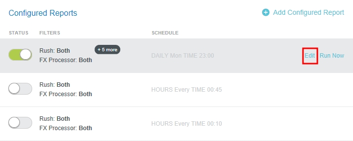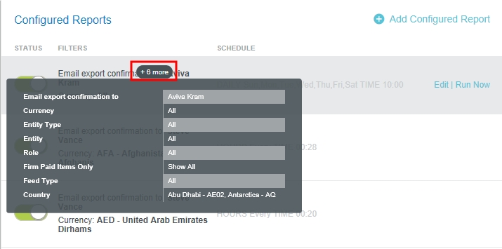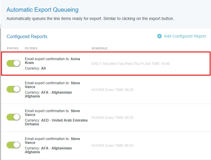 Automatisierte Exporte über den Report Scheduler Neben der Anzeige und Bearbeitung von geplanten Reports ermöglicht der Zeitplaner für Reports von Emburse Enterprise das automatische Hinzufügen und Verwalten von Exporten. Benutzer mit den entsprechenden Sicherheitsberechtigungen können mehrere Zeitpläne hinzufügen, den Zeitplan für den automatischen Export ein- und ausschalten und die Filtereinstellungen ändern, um den Zeitplan für den automatischen Export anzupassen. Informationen zur Aktivierung des Benutzerzugriffs finden Sie unter „Zugriff auf Funktionen in der Report-Planung konfigurieren“ im Artikel Zeitplaner für Reports. 1. Klicken Sie im Admin-Menü auf NACHVERFOLGUNGS-BENACHRICHTIGUNGEN > ZEITPLANER FÜR BERICHTE. Weitere Informationen zum Hinzufügen, Bearbeiten und Planen automatisierter Exporte finden Sie unter Report Scheduler (Zeitplaner für Berichte). Automatische Export-Warteschlange für AUSGABE Sie können einplanen, dass das System automatisch alle exportfähigen Belegpositionen in eine Warteschlange stellt. Diese Funktion ist die gleiche wie ein Klick auf den Button EXPORTIEREN. Der Export wird gemäß den im Abschnitt „Konfigurierte Berichte“ aktivierten Zeitplänen ausgeführt. Im folgenden Beispiel wird der Export täglich (Sonntag bis Samstag) um 10:00 Uhr UTC durchgeführt. In der Spalte Status wird angezeigt, ob der Exportplan aktiv ist. Klicken Sie auf den Kippschalter, um den Status zu ändern. Die automatische Exportwarteschlange verfügt über mehrere Filter. Wenn der Zeitplan mehr verwendet, als in der Liste der Konfigurierten Berichte angezeigt werden kann, wird eine kleine schwarze Schaltfläche angezeigt. Wenn Sie dann mit der Maus über den Zeitplan fahren, zeigt diese Schaltfläche an, wie viele weitere vorliegen. Klicken Sie auf diesen Button, um alle Filter in einem Pop-up-Fenster anzuzeigen. Um Filter hinzuzufügen oder zu bearbeiten, fahren Sie mit der Maus über den gewünschten Zeitplan und klicken Sie auf BEARBEITEN. Die automatische Exportwarteschlange enthält einen Länderfilter mit Mehrfachauswahl, der die Ergebnisse nach Land des Reisenden einschränkt. Sie können weiterhin Länder hinzufügen, indem Sie diese aus der Dropdown-Liste auswählen. Detaillierte Anleitungen zum Hinzufügen, Bearbeiten und Planen von automatischen Exporten, einschließlich Beispielen von gängigen Zeitplanintervallen und Parametern, finden Sie unter Report Scheduler (Zeitplaner für Berichte). Automatisierter Rechnungsexport Sie können das System so einplanen, dass genehmigte Rechnungen automatisch exportiert werden, Diese Funktion ist die gleiche wie ein Klick auf den Button EXPORTIEREN. Der Export wird gemäß den im Abschnitt „Konfigurierte Berichte“ aktivierten Zeitplänen ausgeführt. Im folgenden Beispiel wird der Export wöchentlich, am Montag um 23:00 Uhr UTC, einschließlich Rechnungen, die Eilzahlungen und/oder Fremdwährungszahlungen enthalten, durchgeführt. In der Spalte Status wird angezeigt, ob der Exportplan aktiv ist. Klicken Sie auf den Kippschalter, um den Status zu ändern. Automatisierter Rechnungsexport hat mehrere Filter. Wenn der Zeitplan mehr verwendet, als in der Liste der Konfigurierten Berichte angezeigt werden kann, wird eine kleine schwarze Schaltfläche angezeigt. Wenn Sie dann mit der Maus über den Zeitplan fahren, zeigt diese Schaltfläche an, wie viele weitere vorliegen. Klicken Sie auf diesen Button, um alle Filter in einem Pop-up-Fenster anzuzeigen. Beachten Sie, dass der Filter „Export-Bestätigung per E-Mail an“ einen Wert haben MUSS, sonst wird der Zeitplan nicht ausgeführt. Es gibt mehrere Filter, mit denen Sie die Anzahl der exportierten Rechnungen eingrenzen können. Um Filter hinzuzufügen oder zu bearbeiten, fahren Sie mit der Maus über den gewünschten Zeitplan und klicken Sie auf BEARBEITEN. Rush und FX Prozessor Filter bieten Ihnen folgende Auswahl: Beide: Beinhaltet diese Art der Rechnung und alle anderen Arten Ausschließen: Diese Art der Rechnung wird nicht exportiert. Nur: Nur diese Art der Rechnung. Detaillierte Anleitungen zum Hinzufügen, Bearbeiten und Planen von automatisierten Rechnungsexporten, einschließlich Beispielen von gängigen Zeitplanintervallen und Parametern, finden Sie unter Report Scheduler (Zeitplaner für Berichte). War dieser Beitrag hilfreich? Ja Nein