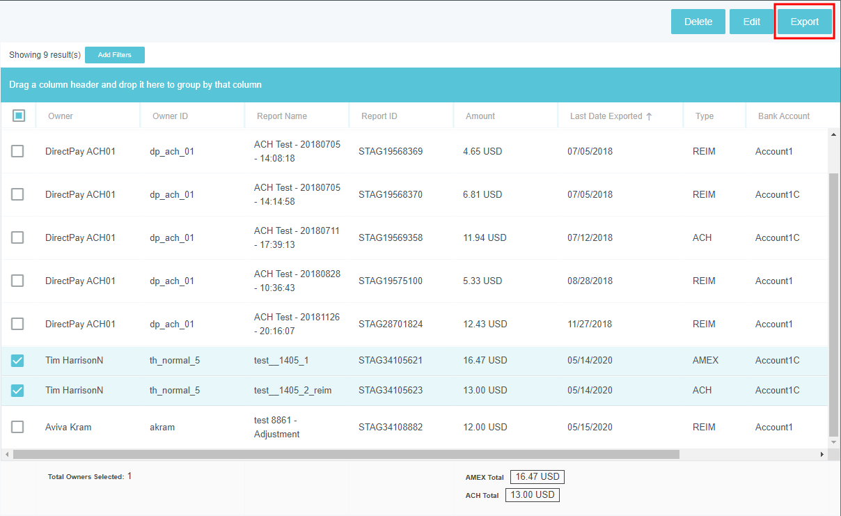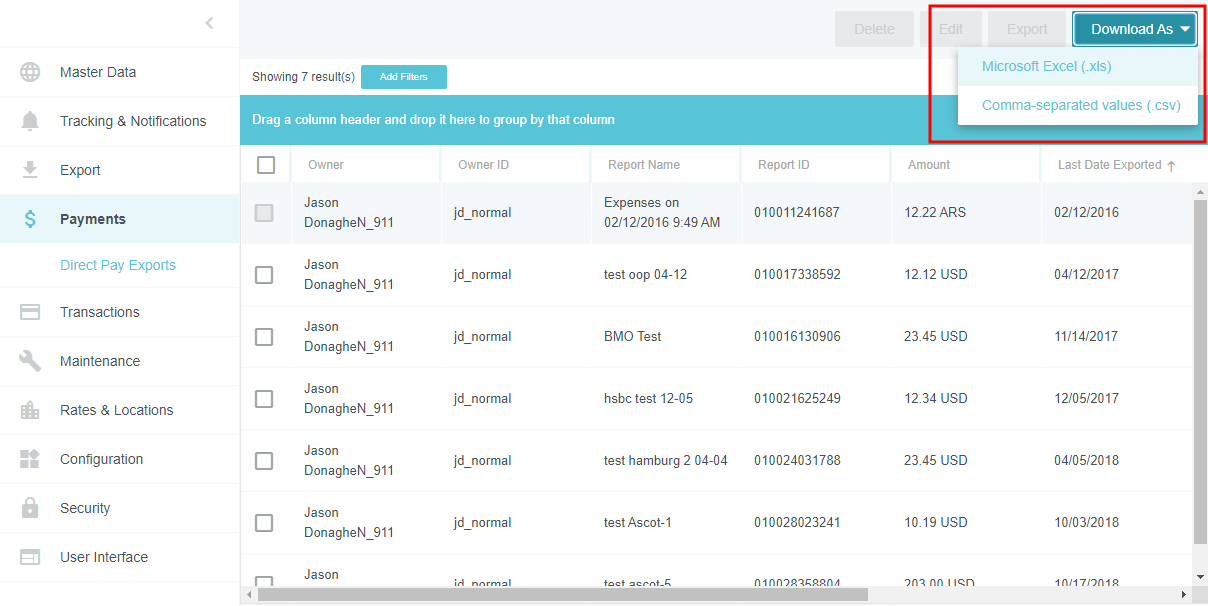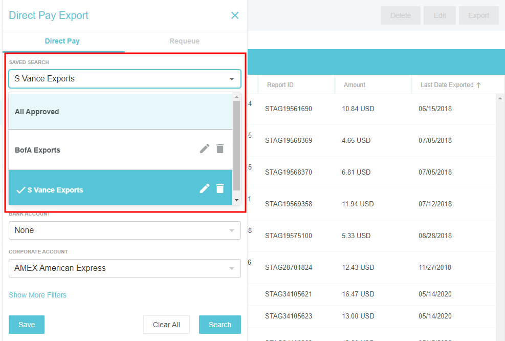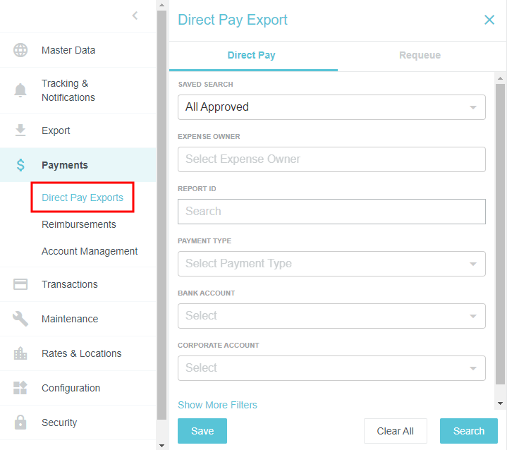 Exporte der Direktzahlung Die Verfügbarkeit dieser Funktion hängt von den Sicherheitsregeln Ihres Unternehmens ab. Nur Ausgaben, die einen regulären Export durchlaufen haben, können per DIREKTZAHLUNG exportiert werden (siehe Genehmigte Ausgaben exportieren für weitere Informationen). Es besteht die Möglichkeit, Berichte mit negativen Zahlungswerten zu exportieren, wenn der Gesamtwert des Exports positiv ist. Nähere Informationen zur DIREKTZAHLUNG finden Sie hier: DIRECT PAY-Kreditkarten. Klicken Sie auf ADMIN-EINSTELLUNGEN > ZAHLUNGEN > EXPORT DER DIREKTZAHLUNG. Genehmigte Ausgaben finden und filtern Wenn Sie auf SUCHEN klicken, ohne Filterkriterien auszuwählen, zeigt Ihnen der Bildschirm alle Ausgaben an, die genehmigt und in das Buchhaltungssystem exportiert wurden. Sie können die Ergebnisse auch filtern, um nur bestimmte Ausgaben zu bezahlen. Geben Sie die Kriterien an, anhand derer Sie Ihren Filter erstellen möchten (z. B. Reisender, Zahlungsart). Klicken Sie dann auf SUCHE. Um Ihre Filterkriterien für die zukünftige Verwendung zu speichern, klicken Sie auf SPEICHERN, bevor Sie suchen, und klicken Sie dann auf NEUE SUCHE ERSTELLEN. Geben Sie den gewünschten Namen für die Suche ein und klicken Sie auf ERSTELLEN. Ihre gespeicherte Suche wird im Dropdown-Menü GESPEICHERTE SUCHE verfügbar sein. Um eine gespeicherte Suche zu bearbeiten oder zu löschen, wählen Sie sie aus dem Dropdown-Menü aus und klicken Sie dann auf das Bleistiftsymbol (zum Bearbeiten) oder das Papierkorbsymbol (zum Löschen). Genehmigte DIREKTZAHLUNGSAUSGABEN exportieren Die Liste zeigt Ausgaben, die auf das Bankkonto des Antragstellers (ACH oder REIM) erstattet werden müssen, und Ausgaben, die auf die Kreditkarte des Unternehmens (AMEX) erstattet werden müssen. Wählen Sie die genehmigten DIREKTZAHLUNGSAUSGABEN aus, die Sie exportieren möchten. Am unteren Bildschirmrand sehen Sie die Gesamtanzahl der ausgewählten Reisenden und separate Gesamtbeträge für jede Zahlungsart, die Sie exportieren möchten. Klicken Sie auf EXPORTIEREN in der oberen rechten Ecke. Im Anschluss erhalten Sie eine E-Mail-Bestätigung. Ausgaben, die in grauer Kursivschrift angezeigt werden, können nicht eingereicht werden. Bewegen Sie den Cursor über das Kontrollkästchen für diese Ausgabe, um den Grund anzuzeigen. Wenn Sie versuchen, eine Ausgabe zu exportieren und kein Bankkonto ausgewählt wurde, wird eine Fehlermeldung angezeigt. Weitere Informationen finden Sie nachstehend unter Bankkonten für die Erstattung von Ausgaben bearbeiten. Bankkonten für die Erstattung von Ausgaben bearbeiten Sie können verschiedene Firmenbankkonten auswählen, von denen aus jede Ausgabe erstattet werden soll. Wählen Sie eine Ausgabe in der Liste aus und klicken Sie auf BEARBEITEN. Wählen Sie im Popup-Fenster über das Dropdown-Menü das Bankkonto aus, von dem aus Sie die Ausgaben bezahlen möchten, und klicken Sie auf BEARBEITEN. Genehmigte Ausgaben löschen Für Zahlungen, die außerhalb von Emburse Enterprise erfolgen, können Sie genehmigte Ausgaben aus einem Export entfernen. Hinweis: Zahlungen, die über Global Reimbursements Powered by Wise getätigt wurden, können nicht aus einem Export entfernt werden. Markieren Sie alle Ausgaben, die entfernt werden sollen, und klicken Sie auf LÖSCHEN am oberen Bildschirmrand. Geben Sie im Bestätigungs-Popup „LÖSCHEN“ ein und klicken Sie dann auf LÖSCHEN. Exportdaten herunterladen Um eine .csv- oder .xls-Version aller Daten auf dem Bildschirm „Export der Direktzahlung“ herunterzuladen, klicken Sie auf HERUNTERLADEN ALS und wählen Sie den gewünschten Dateityp aus. Die generierte Datei enthält alle Elemente, die vom aktuellen Filter auf dem Bildschirm zurückgegeben werden. DIREKTZAHLUNGSTRANSAKTIONEN wieder in die Warteschlange stellen Wenn die DIREKTZAHLUNG eines Benutzers aufgrund einer ungültigen Bankkontonummer oder Routingnummer zurückgegeben wird, erhält der Administrator eine Benachrichtigungs-E-Mail mit dem Namen des Reisenden und der Exportwarteschlangen-ID. Der Administrator kontaktiert den Reisenden, um ihn zu bitten, die Bankdaten zu aktualisieren. Dann kann der Administrator die Spesenabrechnung für den nächsten DIREKTZAHLUNGSEXPORT über das Menü „DIREKTZAHLUNGSEXPORTE wieder in die Warteschlange stellen“ in Emburse Enterprise anfordern. Hinweis: Zahlungen, die über Global Reimbursements Powered by Wise getätigt werden, werden automatisch zurückerstattet, wenn sie zurückgegeben werden. Klicken Sie zunächst auf den Reiter WIEDER IN DIE WARTESCHLANGE STELLEN. Geben Sie die ID für erneute Warteschlange aus der E-Mail-Benachrichtigung ein, wählen Sie den Reisenden aus der Dropdown-Liste und klicken Sie dann auf WIEDER IN DIE WARTESCHLANGE STELLEN. Alternativ können Sie auch die ID für erneute Warteschlange und den Zahlungstyp eingeben, die alle Zahlungen für diesen Typ wieder in die Warteschlange stellen. War dieser Beitrag hilfreich? Ja Nein