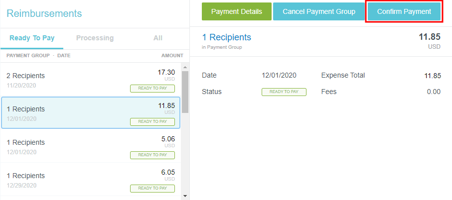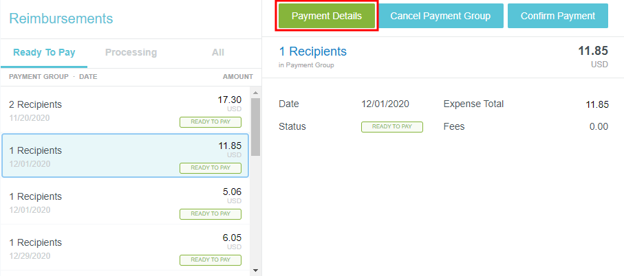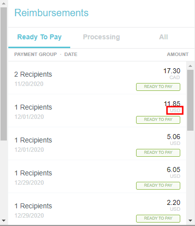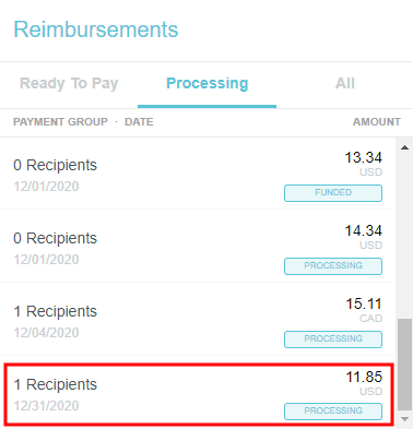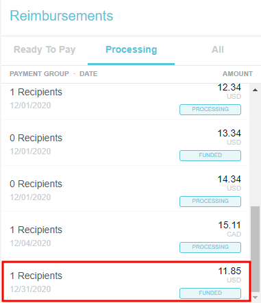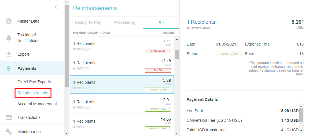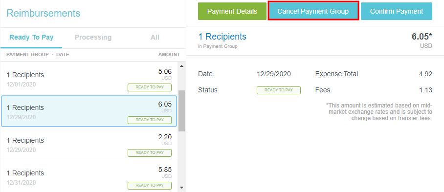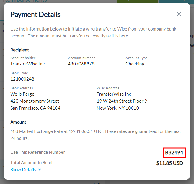 Verwaltungsmenü „Rückerstattungen“ Im Verwaltungsmenü „Rückerstattungen“ können Sie alle Zahlungschargen verwalten und überwachen sowie den Verlauf und den Status aller vorherigen Zahlungen anzeigen. Um Global Reimbursements Powered by Wise-Zahlungen zu verarbeiten, müssen Sie zunächst ein oder mehrere Bankkonten über den Global Reimbursements Powered by Wise-Admin verbinden. Klicken Sie auf ADMIN-EINSTELLUNGEN > ZAHLUNGEN > RÜCKERSTATTUNGEN. Es gibt drei Registerkarten: Zahlungsbereit: Zahlungsgruppen, die exportiert, aber noch nicht bezahlt wurden. Wird verarbeitet: Zahlungsgruppen, die sich im Status „Finanziert“ oder „Wird verarbeitet...“ befinden. Alle: Ein Verlauf aller Zahlungsgruppen, unabhängig von ihrem Status. Klicken Sie auf eine Zahlungsgruppe, um eine Liste der Empfänger und den Status ihrer Zahlungen zu sehen. Rückerstattung veranlassen Die in der Registerkarte Zahlungsbereit aufgeführten Zahlungsgruppen wurden alle über den Global Reimbursements Powered by Wise-Bildschirm exportiert. Jede Gruppe kann Ausgaben in mehreren Zielwährungen enthalten, aber alle werden von demselben Bankkonto bezahlt, das zu Ihrem Unternehmen gehört. Der Währungscode unter dem Betrag gibt die Ursprungswährung des Bankkontos an, von dem aus diese Gruppe bezahlt wird. 1. Klicken Sie auf eine Zahlungsgruppe, um ihre grundlegenden Informationen anzuzeigen. Für internationale Zahlungen werden Gebühren erhoben, die unten rechts aufgeführt sind. Für Zahlungen von und in dieselbe Währung wird keine Gebühr erhoben. 2. Klicken Sie auf ZAHLUNGSDETAILS, um die Referenznummer abzurufen, die Sie benötigen, um die Überweisung für diese Zahlungsgruppe einzuleiten. 3. Stellen Sie sicher, dass die Empfängerdetails und der zu sendende Gesamtbetrag stimmen. Klicken Sie auf DETAILS ANZEIGEN, um Informationen zu den Zahlungen und Gebühren zu erhalten. Sie sehen den Gesamtbetrag, der von Ihrer Ursprungswährung überwiesen wird, und eine Aufschlüsselung der Beträge, die in jeder Zielwährung ausgezahlt werden. Der Wechselkurs ist für 24 Stunden (oder bis zu 3 Tage am Wochenende oder einem Feiertag) garantiert. 4. Kopieren Sie die Referenznummer unten auf dem Bildschirm und verwenden Sie sie, wenn Sie die Überweisung für diese Zahlungsgruppe bei Ihrer Bank veranlassen. 5. Nachdem Sie die Überweisung veranlasst haben, kehren Sie zum Verwaltungsbildschirm „Rückerstattungen“ zurück, wählen Sie die Zahlungsgruppe aus und klicken Sie auf ZAHLUNG BESTÄTIGEN. 6. Klicken Sie im Popup-Fenster „Zahlung bestätigen“ auf BESTÄTIGEN. 7. Diese Zahlungsgruppe wird nun in der Registerkarte „Wird verarbeitet …“ mit dem Status „Finanziert“ angezeigt. 8. Sobald Wise das Geld erhält, ändert sich der Status von „Finanziert“ in „Wird verarbeitet...“. 9. Sobald jeder Empfänger in der Zahlungsgruppe seine Rückerstattung erhalten hat, wechselt die Gruppe zur Registerkarte Alle und zeigt den Status „Bezahlt“ an. Eine Statusliste und deren Definitionen finden Sie hier: Zahlungsstatusdefinitionen Zahlungsgruppe abbrechen Sie können Zahlungsgruppen stornieren, solange sie sich noch im Status Zahlungsbereit befinden. 1. Wählen Sie in der Registerkarte „Zahlungsbereit“ die Gruppe aus und klicken Sie auf ZAHLUNGSGRUPPE ABBRECHEN. 2. Klicken Sie im Popup-Fenster „Zahlungsgruppe abbrechen“ auf WEITER. 3. Alle Ausgaben in der Zahlungsgruppe werden wieder in die Warteschlange auf dem Global Reimbursements Powered by Wise-Bildschirm gesetzt und die Zahlungsgruppe wird gelöscht. Fehlerbehebung bei fehlgeschlagenen Zahlungen Bei fehlgeschlagenen Zahlungen sehen Sie den Grund für den Fehler für jede Zahlungsgruppe und jede einzelne Zahlung, damit Sie Fehler bei der Erstattung beheben können. Am häufigsten werden Zahlungsausfälle durch Probleme mit den Bankdaten des Endbenutzers verursacht. Wenn dies die Ursache für Ihren Zahlungsfehler ist, benachrichtigen Sie den betroffenen Endbenutzer darüber, dass er seine Bankdaten aktualisieren muss. Zahlungsstatusdefinitionen Zahlungsbereit: Für diese Gruppe wurde noch keine Überweisung eingeleitet. Finanziert: Die Überweisung wurde eingeleitet, aber Wise hat das Geld noch nicht erhalten. Wird verarbeitet: Wise hat das Geld erhalten. Teilweise bezahlt: Die Zahlung für einen oder mehrere Benutzer wurde abgelehnt (z. B. wurde das Bankkonto eines Benutzers geschlossen), Wise hat das Geld zurückerstattet und die Ausgaben wurden wieder auf dem Bildschirm „Export der Direktzahlung“ in die Warteschlange gesetzt. Benutzer müssen ihre Bankkontodaten aktualisieren, bevor diese Ausgaben wieder exportiert werden können. Bezahlt: Jeder Empfänger in der Zahlungsgruppe hat seine Rückerstattung erhalten. Fehlgeschlagen: Die Zahlungsgruppe konnte nicht erstellt werden und alle Ausgaben wurden wieder auf dem Bildschirm „Export der Direktzahlung“ in die Warteschlange gesetzt. Storniert: Ein Administrator hat die Zahlungsgruppe manuell storniert. War dieser Beitrag hilfreich? Ja Nein