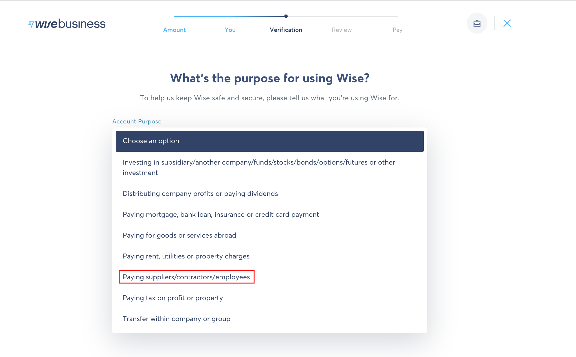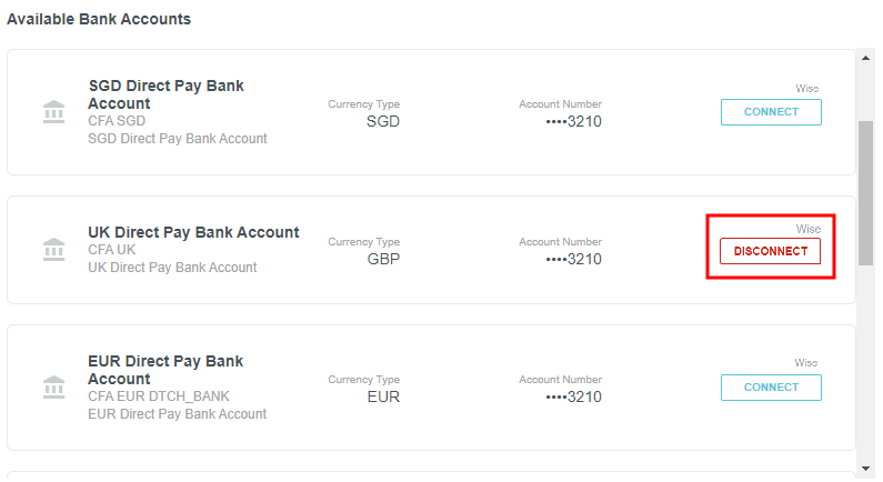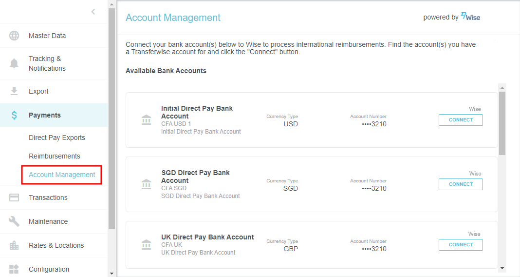 Kontoverwaltung Im Verwaltungsmenü „Kontoverwaltung“ können Sie ein oder mehrere Bankkonten mit dem internationalen Zahlungspartner von Emburse Enterprise, Wise, verbinden. Die Verbindung eines Bankkontos ist der erste Schritt, um Ihrem Unternehmen die Bearbeitung internationaler Rückerstattungen zu ermöglichen. Weitere Informationen dazu finden Sie hier: Global Reimbursements Powered by Wise Klicken Sie auf ADMIN-EINSTELLUNGEN > ZAHLUNGEN > KONTOVERWALTUNG. Alle Bankkonten, die Ihr Unternehmen dem Implementierungsteam von Emburse Enterprise zur Verfügung gestellt hat, werden auf dem Bildschirm „Kontoverwaltung“ angezeigt. Sie müssen sie einzeln mit Wise verbinden. Ein Bankkonto mit Wise verbinden Jedes Geschäftsprofil ist mit einer Rechtseinheit des Unternehmens verknüpft. Wenn Ihr Unternehmen beispielsweise in den USA ansässig, aber in Großbritannien und Australien geschäftlich tätig ist, haben Sie für jedes Land eine andere Geschäftseinheit und müssen für jedes Land ein eigenes Profil mit eigenem Bankkonto erstellen. 1. Suchen Sie das gewünschte Bankkonto und klicken Sie auf VERBINDEN. 2. Sie werden zum Anmeldebildschirm von Wise umgeleitet. Wenn Ihr Unternehmen bereits über ein Wise-Konto verfügt, geben Sie die zugehörige E-Mail-Adresse und das zugehörige Passwort ein und klicken Sie auf ANMELDEN. Wenn Ihr Unternehmen noch kein Wise-Konto besitzt, klicken Sie auf REGISTRIEREN. Die Registrierung für ein Wise-Konto erfolgt über einen mehrstufigen Verifizierungsprozess, bei dem Sie einen Identitäts- und Adressnachweis vorlegen müssen. Klicken Sie hier für Informationen zu den Dokumenten, die Sie vor Beginn der Registrierung benötigen, sowie zur Dauer des Verifizierungsprozesses. Klicken Sie hier, um auf das gesamte Wise Hilfe-Center zuzugreifen. Die angezeigten Bildschirme zur Registrierung variieren je nach Land und Branche. Alle Kunden müssen jedoch den Zweck für die Verwendung von Wise angeben. Wählen Sie im Dropdown-Menü die Option „Lieferanten/Auftragnehmer/Mitarbeiter bezahlen“. 3. Die Kontoverifizierung kann sofort erfolgen oder mehrere Tage in Anspruch nehmen. Sobald Sie ein verifiziertes Wise-Konto haben, können Sie sich bei Wise anmelden und Ihr Unternehmensprofil mit dem Bankkonto verknüpfen, das Sie im Bildschirm „Kontoverwaltung“ von Emburse Enterprise ausgewählt haben. Klicken Sie im Bestätigungsfenster auf ZUGRIFF GEWÄHREN. 4. Auf dem Bildschirm „Kontoverwaltung“ erscheint für dieses Bankkonto nun eine rote Schaltfläche TRENNEN, um anzuzeigen, dass es verknüpft ist. Nun können Sie über den Bildschirm Global Reimbursements Powered by Wise Zahlungsgruppen für dieses Bankkonto anlegen und über die Informationen auf dem Bildschirm Global Reimbursements Powered by Wise Rückerstattungen veranlassen und verfolgen. War dieser Beitrag hilfreich? Ja Nein