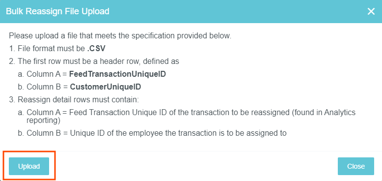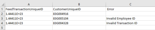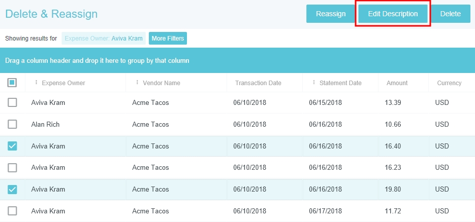 Transaktionen löschen & neu zuweisen Im Verwaltungsmenü „Transaktionen löschen & neu zuweisen“ können Sie einerseits nicht verwendete Kreditkartentransaktionen eines einzelnen Benutzers löschen und sie andererseits auch von einem Benutzer zu einem anderen verschieben – wenn ein Benutzer das Unternehmen verlässt zum Beispiel –, bevor Sie alle Ausgabentransaktionen einsenden. Klicken Sie auf ADMIN-EINSTELLUNGEN > TRANSAKTIONEN > LÖSCHEN & NEU ZUWEISEN. Kreditkartentransaktionen löschen Hinweis: Ein Administrator kann die eigenen Transaktionen aus Sicherheitsgründen nicht löschen. 1. Verwenden Sie die Filter, um die gewünschte(n) Transaktion(en) zu finden. 2. Wählen Sie die Transaktion(en) aus und klicken Sie auf LÖSCHEN. Sie können die Spaltenüberschriften auch mit Drag & Drop in die blaue Leiste ziehen, um die Ergebnisse nach Spaltenüberschrift zu gruppieren. 3. Sie müssen das Löschen noch einmal bestätigen, indem Sie das Wort "LÖSCHEN" in das Feld eintippen. Klicken Sie anschließend auf LÖSCHEN. Ausgaben-Transaktionen neu zuweisen Administratoren können alle Benutzer außer jene mit Status „nicht aktiv“ anwählen, um alle aktiven Transaktionen zu sehen, die in keiner Reisekostenabrechnung erscheinen. Es können einige oder alle Transaktionen ausgewählt und zu einem neuen Benutzer verschoben werden. Hinweis: Wird eine Transaktion neu zugewiesen, die Teil eines zusammengeführten Sets ist, werden alle im Set enthaltenen Transaktionen neu zugewiesen 1. Verwenden Sie die Filter, um die gewünschte(n) Transaktion(en) zu finden. 2. Wählen Sie die Transaktion(en) aus und klicken Sie auf NEU ZUWEISEN. 3. Suchen Sie im Suchfeld des Pop-up-Fensters nach der gewünschten Person, an die die Transaktion(en) neu zugewiesen werden soll(en). Klicken Sie dann auf NEU ZUWEISEN. Transaktionsbeschreibung bearbeiten Über die Schaltfläche TRANSAKTION BEARBEITEN können Sie zu jeder Transaktion Beschreibungen hinzufügen – beispielsweise eine Erklärung, wenn eine ältere Transaktion nicht verwendet wird. Wenn der Benutzer zum Beispiel aufgrund einer Flugstornierung eine Gutschrift erhält, möchte dieser vielleicht mit der Ausgabe der Kreditkarten-Position warten, bis er die Gutschrift für einen anderen Flug einlösen kann. 1. Wählen Sie die gewünschten Transaktion(en) aus und klicken Sie auf BESCHREIBUNG BEARBEITEN. 2. Geben Sie die Beschreibung ein und klicken Sie auf ÜBERNEHMEN. Alle ausgewählten Transaktionen erhalten die gleiche Beschreibung. Transaktionen gesammelt neu zuweisen Für Kunden, die mehrere Transaktionen mehreren Benutzern neu zuweisen müssen, ermöglicht die Schaltfläche GESAMMELT NEU ZUWEISEN Administratoren das Hochladen einer CSV-Datei, die alle Neuzuweisungen enthält, anstatt jede manuell auszuwählen. 1. Klicken Sie auf GESAMMELT NEU ZUWEISEN. 2. Das Popup-Fenster enthält Spezifikationen für die hochzuladende CSV-Datei: Das Dateiformat muss .CSV sein Die erste Zeile muss eine Kopfzeile sein, definiert als Spalte A = FeedTransactionUniqueID Spalte B = CustomerUniqueID Detailzeilen für die Neuzuweisungen müssen enthalten: Spalte A = eindeutige Feed-Transaktions-ID der neu zuzuweisenden Transaktion Spalte B = eindeutige ID des Mitarbeiters, dem die Transaktion zugewiesen werden soll Hier finden Sie eine Muster-CSV-Datei, die Sie individuell anpassen können. 3. Wenn die CSV-Datei korrekt formatiert ist, klicken Sie auf HOCHLADEN und wählen Sie die Datei aus. 4. Überprüfen Sie im Popup-Fenster zur Bestätigung des Hochladens, ob die richtige Datei ausgewählt wurde, und klicken Sie auf HOCHLADEN. 5. Im Popup-Fenster „Ergebnisse gesammelt neu zuweisen“ werden Ihnen die Anzahl der erfolgreich neu zugewiesenen Transaktionen und die Anzahl der Fehler angezeigt. 6. Klicken Sie auf ERGEBNISSE HERUNTERLADEN, um eine CSV-Datei zu erhalten, die zeigt, welche Transaktionen fehlerhaft waren und um welche Fehler es sich gehandelt hat. Sample Bulk Reassign.csv96 Bytes War dieser Beitrag hilfreich? Ja Nein