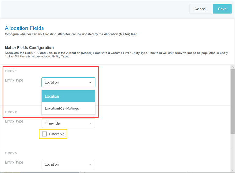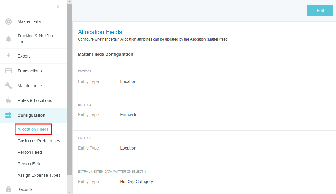Zuordnungsfelder Auf dem Bildschirm Zuordnungsfelder können Benutzer mit Administratorrechten konfigurieren, ob bestimmte Zuordnungsattribute durch den Zuordnungen-Feed aktualisiert werden können. Weitere Informationen finden Sie hier: Verwaltungsmenü „Daten-Feed“. Um die Spezifikation des Zuordnungen-Datenfeeds anzuzeigen, siehe Verwaltungsmenü „Daten-Feed“. 1. Klicken Sie auf ADMIN-EINSTELLUNGEN > KONFIGURATION > ZUORDNUNGSFELDER. 2. Klicken Sie auf BEARBEITEN, um Listentypen für die Aufnahme von Listenverknüpfungen in den Zuordnungen-Datenfeed zu definieren. Konfiguration der Zuordnungsfelder Der Zuordnungen-Feed erlaubt die Eingabe von Werten in Liste 1, Liste 2 oder Liste 3 nur dann, wenn ein zugehöriger Listentyp vorhanden ist. 1. Verwenden Sie die Listentyp-Drop-down-Menüs, um jedes Listenfeld mit einem Emburse Enterprise-Listentyp zu verknüpfen. 2. Markieren Sie das Kästchen FILTERBAR, wenn Sie möchten, dass Benutzer nach dieser Liste filtern können. 3. Klicken Sie auf SPEICHERN. WEITERE BELEGPOSITIONSDATEN (ZUORDNUNG ZUORDNUNGSKATEGORIE1) Für ältere Konfigurationen und Organisationen, die nicht den „Matter-On-Select“-Feed verwenden, können Sie in diesem Abschnitt den Listentyp „Matter-On-Select 1“ angeben, indem Sie das Feld „Zusätzliche Belegposition Daten 1 Rechtswerte“ eines Zuordnungssatzes verwenden, um die Teilmenge der Listencodes zu identifizieren, die bei der Auswahl der Zuordnung angezeigt werden sollen. War dieser Beitrag hilfreich? Ja Nein