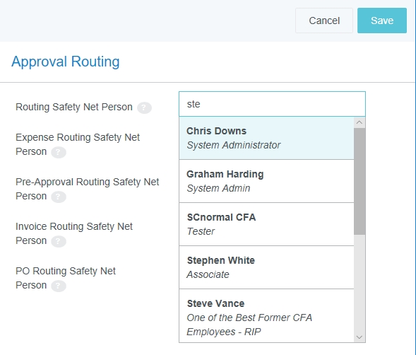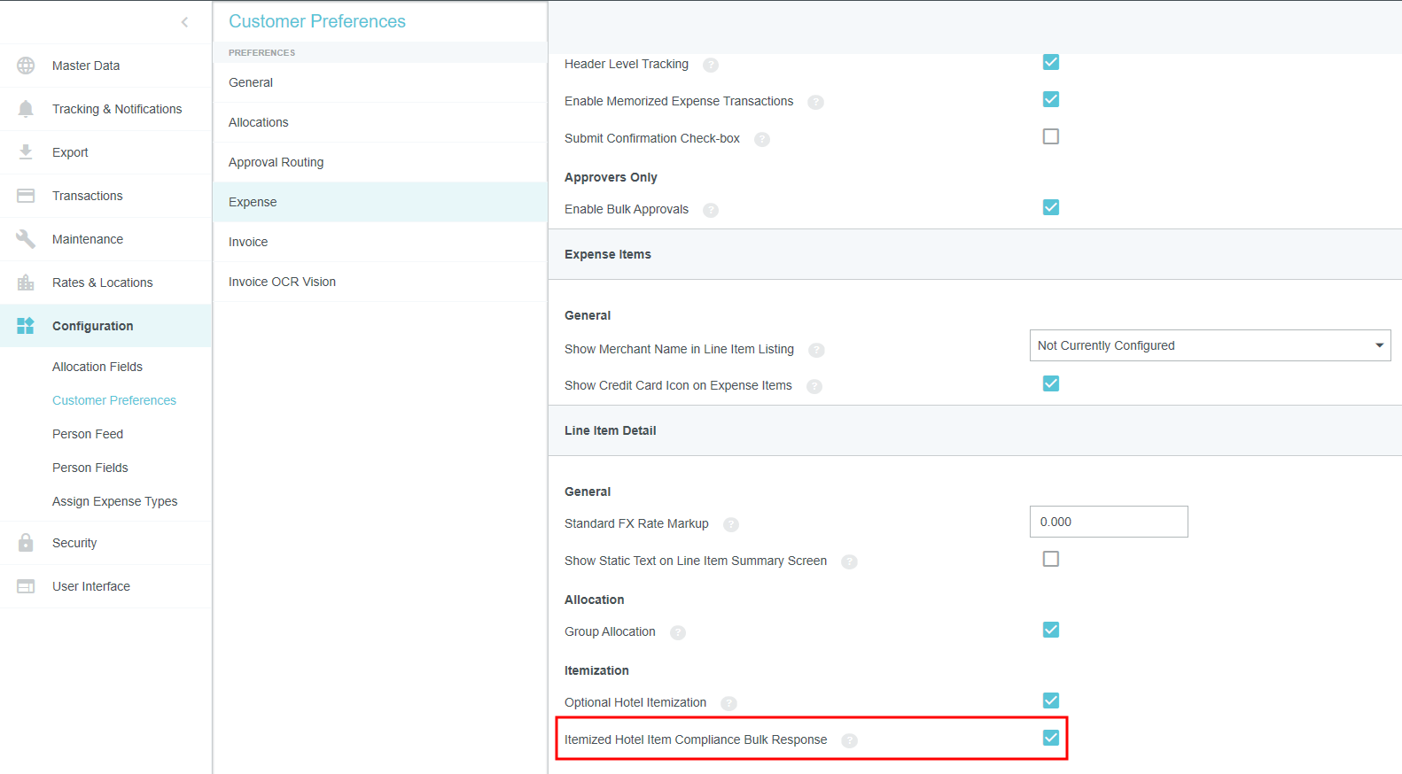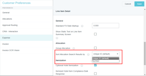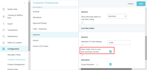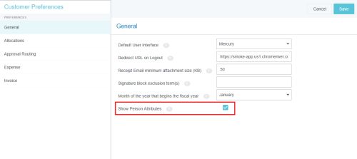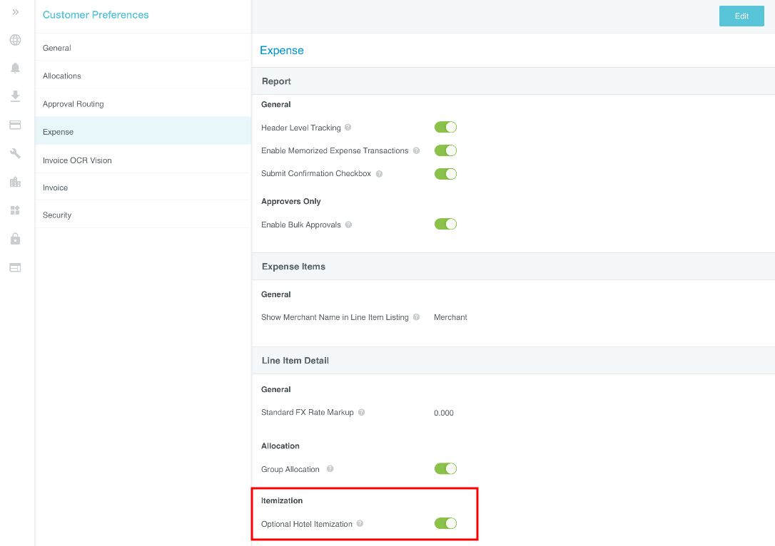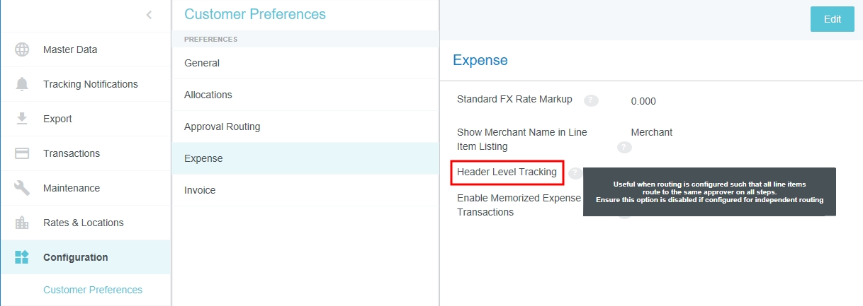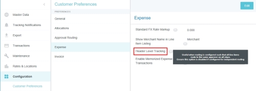 Kundeneinstellungen Mit diesem Verwaltungsmenü können Administratoren bestimmte globale, kundenspezifische Eigenschaften bearbeiten, die mit Kategorien wie Zuordnungen, Genehmigungsrouting, Ausgaben und Rechnungen verknüpft sind. Sie können auch allgemeine Präferenzen wie die URL, an die Benutzer beim Abmelden weitergeleitet werden, sowie die minimale Anhangsgröße für per E-Mail versendete Belege anpassen. Auf Verwaltungsmenü „Kundeneinstellungen“ zugreifen 1. Klicken Sie auf den MENÜ-Button in der oberen linken Ecke und dann auf ADMIN-EINSTELLUNGEN. 2. Klicken Sie auf KONFIGURATION > KUNDENEINSTELLUNGEN. Die hier sichtbaren Kategorien und Optionen hängen von der Konfiguration Ihres Unternehmens bei Emburse Enterprise ab. Es kann sein, dass in Ihrem Verwaltungsmenü nicht alle hier aufgeführten Kategorien sichtbar sind. Kundeneinstellungen bearbeiten 1. Klicken Sie auf eine Kategorie, um zu sehen, welche Optionen Sie bearbeiten können. Über das Fragezeichen-Symbol können Sie eine Beschreibung jeder Option anzeigen lassen. 2. Klicken Sie auf BEARBEITEN, um Änderungen vorzunehmen. 3. Wenn Sie die gewünschten Änderungen vorgenommen haben, klicken Sie auf SPEICHERN. Allgemein Beginn des Steuerjahres (Monat) Wenn das Steuerjahr Ihres Unternehmens in einem anderen Monat als Januar beginnt, können Sie dies in den Kundeneinstellungen konfigurieren, um die Vorteile der Datumsfilter für das Steuerjahr in den Emburse Analytics Reports zu nutzen. 1. Um den Monat auszuwählen, in dem das Geschäftsjahr Ihres Unternehmens beginnt, klicken Sie auf die Registerkarte „Allgemein“ und dann auf BEARBEITEN. 2. Verwenden Sie das Dropdown-Menü neben „Monat des Jahres, in dem das Geschäftsjahr beginnt“, um den gewünschten Startmonat auszuwählen. Personenattribute anzeigen Ihr Unternehmen kann bestimmen, ob ein PROFIL ANZEIGEN-Link im Menü „Benutzer“ angezeigt werden soll. Wenn Sie auf diesen Link klicken, wird ein Bildschirm geöffnet, der den Benutzern alle ihre Personenattribute anzeigt, einschließlich Listen, Listentypen und Rollen. 1. Klicken Sie in der Registerkarte „Allgemein“ auf BEARBEITEN. 2. Klicken Sie auf das Kontrollkästchen neben „Personenattribute anzeigen“. 3. Klicken Sie auf SPEICHERN. Genehmigungsrouting – Person des Routing-Sicherheitsnetzes Über die Registerkarte Genehmigungsrouting können Administratoren einen Standardbenutzer wählen, der der Genehmigung einer Spesenabrechnung, Vorabgenehmigung, Rechnung oder eines Auftrags zugewiesen wird, wenn kein anderer Benutzer der in den Routing-Regeln angegebenen Rolle zugewiesen wurde. Diese Routing-Sicherheitsnetz-Person wird manchmal als „Find Me/Fix Me“-Person bezeichnet. Best Practice: Wählen Sie einen Benutzer aus, der normalerweise kein Genehmiger für das Kreditorenmanagement ist, sodass offensichtlich ist, dass die Routing-Regeln beachtet werden müssen, wenn dieser Person eine Genehmigung zugewiesen wird. Klicken Sie auf BEARBEITEN, um den gewünschten Benutzer aus der Dropdown-Liste auszuwählen, und klicken Sie dann auf SPEICHERN. Kunden von älteren Emburse Enterprise-Versionen können die Sicherheitsperson erst dann mit Hilfe dieses Eingabefensters bearbeiten, wenn sie ein Support-Ticket erstellt haben, das ihre bestehende Routing-Regel mit den hier eingegebenen Werten aktualisiert. Genehmigungsrouting – Alternative E-Mail-Adressen zur Genehmigung Kunden können alternative Genehmigungs-E-Mail-Adressen für Endbenutzer aktivieren. Dies macht es ihnen möglich, Ausgaben oder Rechnungen einfach zu genehmigen, ohne sich bei ihrem Unternehmens-E-Mail-Konto anmelden zu müssen. Diese Funktion kann den Genehmigungsprozess vereinfachen, indem es Genehmigern ermöglicht, Genehmigungs-E-Mails von nicht firmeneigenen E-Mail-Konten wie denen auf ihren persönlichen Mobilgeräten weiterzuleiten. 1. Klicken Sie auf der Registerkarte „Genehmigungsrouting“ auf BEARBEITEN. 2. Klicken Sie auf das Kontrollkästchen neben „Alternative E-Mail-Adressen zur Genehmigung“. 3. Klicken Sie auf SPEICHERN. Wenn diese Funktion aktiviert wurde, können Genehmiger in ihren Kontoeinstellungen alternative E-Mail-Adressen hinzufügen, von denen sie Ausgaben und/oder Rechnungen genehmigen können. Spesen Händlername im Belegpositionseintrag anzeigen Kunden, die autorisierte Benutzerregeln verwenden, können die benutzerdefinierten Felder (UDAs) „Händlername“ auf den Dashboards Entwurf, Eingereicht, Zurückgesendet und Genehmigung erforderlich anzeigen lassen. Administratoren von Kunden, die autorisierte Benutzerregeln konfiguriert haben, können diese Funktion über das Verwaltungsmenü „Kundeneinstellungen“ aktivieren. 1. Klicken Sie in der Registerkarte „Ausgaben“ auf BEARBEITEN. 2. Wählen Sie im Drop-down-Menü neben „Händlername im Belegpositionseintrag anzeigen“ HÄNDLER aus. 3. Klicken Sie auf SPEICHERN. Nachverfolgung auf Header-Ebene aktivieren Bei Unternehmen, in denen die Ausgaben für alle Schritte zum selben Genehmiger gehen, können Benutzer mit Nachverfolgung auf Header-Ebene einfach ganze Abrechnungen verfolgen, statt einzelne Belegpositionen in einer Abrechnung nachzuverfolgen. Administratoren können die Option „Nachverfolgung auf Header-Ebene“ im Verwaltungsmenü „Kundeneinstellungen“ aktivieren. Die Benutzer sehen dann keine Nachverfolgungsschritte für jede einzelne Belegposition mehr. Stattdessen basiert die Nachverfolgung der gesamten RKA auf dem Routing der ersten Belegposition in der Abrechnung. Hinweis: Diese Option sollte nicht aktiviert werden, wenn Ihre Organisation für unabhängiges Routing konfiguriert ist. 1. Klicken Sie in der Registerkarte „Ausgaben“ auf BEARBEITEN. 2. Klicken Sie auf das Kontrollkästchen neben „Nachverfolgung auf Kopfzeilenebene“. 3. Klicken Sie auf SPEICHERN. Gemerkte Ausgabentransaktionen aktivieren Kunden von Emburse Enterprise können eine Funktion aktivieren, mit der sich Benutzer häufig verwendete Ausgaben