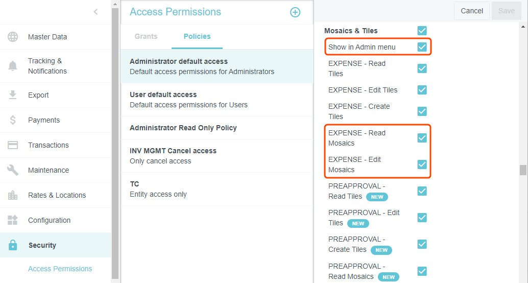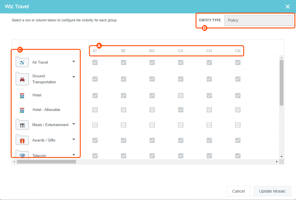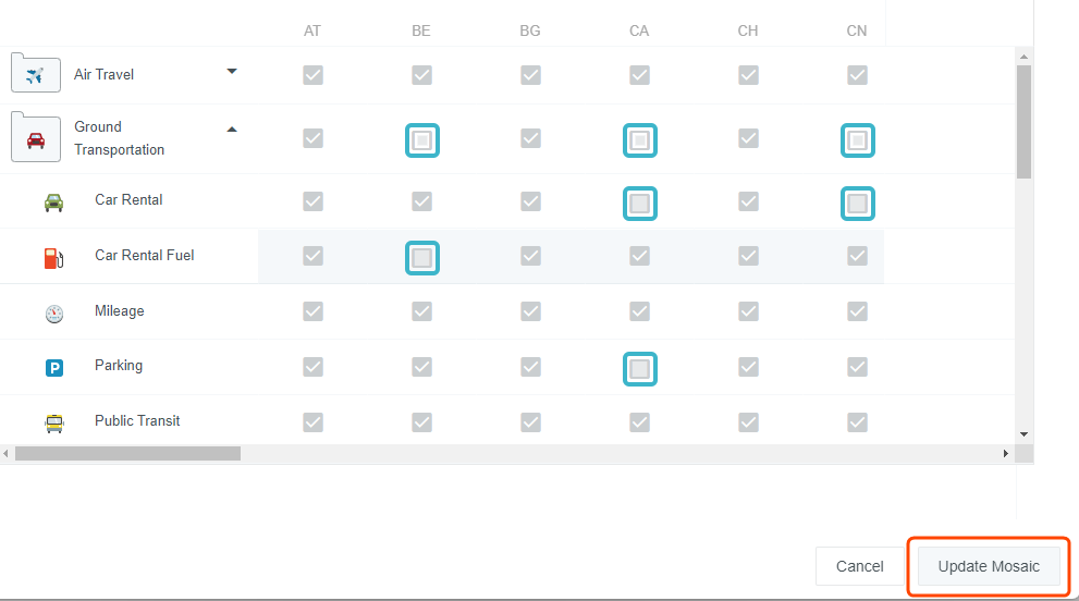 Automatische Mosaik-Erstellung Kunden, die eine große Anzahl von Mosaiken benötigen, können mit der automatischen Mosaik-Erstellung mehrere Mosaike aus einer einzigen Vorlage erstellen lassen. Sie könnten zum Beispiel für jedes Land, in das Ihre Mitarbeiter regelmäßig geschäftlich reisen, ein eigenes Reisemosaik erstellen. Wenn Aktualisierungen erforderlich sind, muss ein Administrator lediglich die Vorlage aktualisieren, damit sich die Änderungen auf alle Ländermosaike auswirken, oder er kann die Tabellenansicht verwenden, um Änderungen an einzelnen Mosaiken vorzunehmen. Wenn Ihr Unternehmen diese Funktion aktiviert hat, sehen Sie oben in der Mosaik-Liste zwei Registerkarten, die über das Verwaltungsmenü „Mosaike und Kacheln“ zugänglich sind. Standard: Die Standardmosaike Ihres Unternehmens sowie alle als Vorlagen verwendeten Mosaike Erzeugt: Mosaike, die während der Implementierung der automatischen Mosaik-Erstellung aus einer Vorlage erstellt werden Zugriffsberechtigungen Um die Vorteile der automatischen Mosaik-Erstellung voll ausschöpfen zu können, ist es wichtig, dass die richtigen Zugriffsberechtigungen festgelegt wurden. 1. Navigieren Sie im Menü „Admin“ zu SICHERHEIT > ZUGRIFFSBERECHTIGUNGEN und wählen Sie die entsprechende Richtlinie aus. 2. Vergewissern Sie sich im Abschnitt Mosaike und Kacheln, dass alle folgenden Berechtigungen aktiviert sind: Im Admin-Menü anzeigen AUSGABE – Mosaike lesen AUSGABE – Mosaike bearbeiten Eine Mosaik-Vorlage bearbeiten Mosaik-Vorlagen werden auf die gleiche Weise bearbeitet wie normale Mosaike. Weitere Informationen finden Sie unter „Mosaik bearbeiten“ in Mosaike & Kacheln. Erzeugte Mosaike bearbeiten In der Tabellenansicht können Sie leicht individuelle Änderungen an einer großen Anzahl von erzeugten Mosaiken vornehmen, indem Sie einfach Kästchen im Kachelraster aktivieren oder deaktivieren. 1. Wählen Sie die Vorlage, die mit den gewünschten erzeugten Mosaiken verbunden ist, und klicken Sie auf TABELLENANSICHT. Die Spaltenüberschriften am oberen Rand entsprechen den Listen, z. B. verschiedenen Ländern oder Geschäftsbereichen, für die Ihr Unternehmen Mosaike erstellt hat. In diesem Beispiel werden die Länder mit zweistelligen Codes bezeichnet, aber Ihr Unternehmen kann sie auch mit Namen bezeichnen. Im Feld Listentyp wird der Listentyp angezeigt, der mit den Listen verbunden ist, die die Spaltenüberschriften bilden. Um zu ändern, welche Spalten (d. h. Listen) hier erscheinen, müssen Sie zum Verwaltungsmenü Listen navigieren und Listen für diesen Listentyp hinzufügen oder entfernen. Ausführliche Informationen finden Sie unter „Spalten (Listen) in erzeugten Mosaiken bearbeiten“ weiter unten. Die Zeilen stellen die einzelnen Ausgabenkacheln dar, die in der Vorlage erscheinen. Um zu ändern, welche Kacheln und Ordner hier erscheinen, müssen Sie die Mosaik-Vorlage bearbeiten. Weitere Informationen finden Sie unter „Mosaik bearbeiten“ in Mosaike & Kacheln. Wenn Sie noch kein Changeset erstellt oder ausgewählt haben, werden Sie dazu aufgefordert, wenn Sie das erste Mal auf das Kachelgitter klicken. Ein Changeset ist nur eine Möglichkeit, Änderungen an der Benutzeroberfläche vorzunehmen, die verfolgt und bei Bedarf leicht rückgängig gemacht werden können. Sie können ein vorhandenes Changeset auswählen (z. B. eines, das Sie bereits erstellt haben und das die entsprechenden Änderungen enthält, die Sie vornehmen möchten) oder ein neues erstellen. Weitere Details dazu finden Sie unter Changesets erstellen und veröffentlichen. 2. Um eine Zeile zur Bearbeitung freizugeben, klicken Sie auf eine beliebige Stelle der Zeile. Es erscheint die Schaltfläche „ALLES AUSWÄHLEN“. Klicken Sie gegebenenfalls darauf, um sie in die Schaltfläche „AUSWAHL AUFHEBEN“ zu verwandeln. Um eine Spalte zur Bearbeitung freizugeben, klicken Sie auf die Spaltenüberschrift. Ein Schlosssymbol erscheint, wenn Sie den Mauszeiger über die Spaltenüberschrift bewegen. 3. Um eine Ausgabenkachel zum Mosaik einer Liste hinzuzufügen oder daraus zu entfernen, aktivieren oder deaktivieren Sie das entsprechende Kästchen im Kachelraster. Ein blaues Quadrat erscheint über jedem geänderten Kontrollkästchen, damit Sie den Überblick behalten. 4. Wenn Sie fertig sind, klicken Sie auf MOSAIK AKTUALISIEREN. Spalten (Listen) auf erzeugten Mosaiken bearbeiten Die Spalten im Kachelraster entsprechen den Listen, z. B. verschiedenen Ländern oder Geschäftsbereichen, für die Ihr Unternehmen Mosaike erstellt hat. Administratoren können ändern, welche Listen im Kachelraster angezeigt werden, z. B. wenn Ihr Unternehmen einen neuen Geschäftsbereich einrichtet oder die Geschäftstätigkeit in einem bestimmten Land einstellt. Das Feld in der oberen linken Ecke zeigt den Listentyp an, der bestimmt, welche Listen als Spalten im Kachelraster erscheinen. Navigieren Sie einfach zum Bildschirm „Listenverwaltung“ und ergänzen oder entfernen Sie Listen für den Listentyp, der in der oberen rechten Ecke des Rasters angezeigt wird. Ausführliche Informationen finden Sie unter „Neue Liste erstellen“ oder „Liste bearbeiten“ unter Verwaltungsmenü „Listen“. War dieser Beitrag hilfreich? Ja Nein
