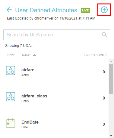 Verwaltung von benutzerdefinierten Attributen Im Verwaltungsmenü Benutzerdefinierte Attribute (UDA) können Sie ganz einfach benutzerdefinierte Felder oder Datenattribute erstellen und aktualisieren, die Sie auf Formulare setzen können, um die für Ihr Unternehmen erforderlichen Informationen zu sammeln. Es wird dringend empfohlen, dass Sie Änderungen in der QS-Umgebung erstellen und testen und dann Cross-Environment Publishing verwenden, um die Änderungen in die Produktion zu bringen. Ausführliche Informationen finden Sie unter „Changesets zwischen diversen Umgebungen veröffentlichen“ in dem Artikel Changesets erstellen und veröffentlichen. UDAs anzeigen 1. Klicken Sie auf ADMIN-EINSTELLUNGEN > BENUTZEROBERFLÄCHE > BENUTZERDEFINIERTE ATTRIBUTE. 2. Wählen Sie das Changeset aus, das Sie verwenden möchten. Wenn ein Changeset nicht vorhanden ist, können Sie Live am Prod (oder QA) auswählen und auf ANZEIGEN klicken. Ein Changeset ist nur eine Möglichkeit, Änderungen an der Benutzeroberfläche vorzunehmen, die verfolgt und bei Bedarf leicht rückgängig gemacht werden können. Sie können ein vorhandenes Changeset auswählen (z. B. eines, das Sie bereits erstellt haben und das die entsprechenden Änderungen enthält, die Sie vornehmen möchten) oder ein neues erstellen. Weitere Details dazu finden Sie unter Changesets erstellen und veröffentlichen. 3. Ihnen wird eine Liste aller für Ihre Organisation definierten UDAs angezeigt. Die Zahl rechts zeigt die Gesamtzahl der Ausgaben- und Vor-Genehmigungsformulare an, die mit diesem UDA verknüpft sind. Klicken Sie auf ein UDA, um seine Details anzuzeigen. Klicken Sie auf VERKNÜPFTE FORMULARE, um alle Ausgaben- und Vor-Genehmigungsformulare anzuzeigen, die dieses UDA verwenden und von allen daran vorgenommenen Änderungen betroffen sind. Neues UDA erstellen 1. Klicken Sie auf den blauen Plus-Button oben in der Liste der benutzerdefinierten Attribute. 2. Wenn Sie sich nicht in einem Changeset befinden, werden Sie aufgefordert, ein Changeset zu wählen oder ein neues zu erstellen. 3. Geben Sie die Details des neuen UDA ein. Name: Der eindeutige Systemname für das UDA. Der Name muss mit einem Buchstaben beginnen und darf nur alphanumerische Zeichen oder Unterstriche enthalten. Leerzeichen sind nicht erlaubt. Label: Der angezeigte Name, den Benutzer in der Benutzeroberfläche sehen. Das Label sollte ein Wort oder ein Satz sein, der den Benutzern hilft, die Informationen zu verstehen, die sie zur Verfügung stellen müssen. Typ: Verwenden Sie die Dropdown-Liste, um den Typ des UDA auszuwählen, das Sie erstellen möchten: Kontrollkästchen: Zeigt ein Kontrollkästchen an und speichert den Wert als 1 (aktiviert) oder 0 (deaktiviert). Format: Legen Sie fest, ob das Label vor oder hinter dem Kontrollkästchen angezeigt wird. Am besten positionieren Sie das Label vor dem Kontrollkästchen. Währung: Zeigt ein Betragsfeld im gleichen Format wie die Währung des ausgegebenen Betrags an. Die Eingabe muss numerisch sein. Datum: Zeigt ein Feld an, in dem ein Datum manuell eingegeben oder aus einem Kalender ausgewählt werden kann. Liste: Zeigt eine Dropdown- oder durchsuchbare Liste basierend auf dem zugeordneten Listentyp an und speichert den Listencode der ausgewählten Liste. Weitere Details dazu finden Sie unten unter „UDA-Eigenschaften von Listen“. Nummer: Zeigt ein numerisches Feld an. Die Eingabe muss numerisch sein. Genauigkeit: Geben Sie die Anzahl der Dezimalstellen für das UDA von 0 bis 5 an. Text: Zeigt ein Textfeld an. Eingaben können alphanumerische oder Sonderzeichen sein. Erforderlich: Aktivieren Sie dieses Kontrollkästchen, um das UDA zu einem Pflichtfeld auf jedem Formular zu machen, in dem es angezeigt wird. Für mehr Flexibilität lassen Sie das Kontrollkästchen „Erforderlich“ deaktiviert und wählen Sie auf dem Bildschirm Formular-Verwaltung aus, ob das UDA für jedes Formular erforderlich oder optional ist. Validierungsnachricht: Wenn Sie ERFORDERLICH aktivieren, werden Sie aufgefordert, eine optionale Validierungsnachricht festzulegen. Sie wird rot unter dem UDA angezeigt, wenn der Benutzer versucht, das Formular zu speichern, ohne einen Wert in das UDA einzugeben. UDA-Eigenschaften von Listen Listen-UDAs sind Dropdown- oder durchsuchbare Listenfelder. Wenn Sie ein Listen-UDA erstellen, werden Sie aufgefordert, es mit einem bestimmten Listentyp zu verknüpfen, der die Liste der Werte enthält, aus denen Benutzer auswählen können. Weitere Informationen zum Erstellen und Definieren eines Listentyps finden Sie unter Verwaltungsmenü „Listen“. Listen-UDAs haben eine Reihe von zusätzlichen Eigenschaften, die im Folgenden beschrieben werden. Es wird empfohlen, dass Sie mit dem Emburse Enterprise-Implementierungsberater Ihres Unternehmens sprechen, bevor Sie die erweiterten Eigenschaften von Listen-UDAs konfigurieren. Listentyp Der Listentyp identifiziert die Liste der zur Auswahl verfügbaren Werte. Nicht durchsuchbar: Eine Dropdown-Liste mit Werten wird angezeigt, wenn Benutzer auf das Feld klicken, und sie können nur aus dieser Liste auswählen. Durchsuchbar: Wenn Benutzer eine Eingabe in das Feld machen, ändert sich die Dropdown-Liste und zeigt die Teilmenge der Werte an, die der eingegebenen Suchzeichenfolge entsprechen. Durchsuchbare Listen-UDAs werden normalerweise verwendet, wenn die Liste der Werte relativ groß ist. Eigenschaften durchsuchbarer Listen Extradaten 1 anzeigen: Fügt den Wert Extradaten 1 der Liste vor dem Listennamen (bzw. Extradaten 2) hinzu, wenn er in der Dropdown-Liste angezeigt wird. Extradaten 2 anzeigen: Fügt den Wert Extradaten 2 der Liste vor dem Listennamen hinzu, wenn er in der Dropdown-Liste angezeigt wird. Enable Elastic aktivieren: Diese erweiterte Einstellung, die Sie mit Ihrem Implementation Consultant besprechen sollten, bietet eine erweiterte Suchfunktion und kann die Leistung bei sehr großen Listen verbessern. Filtern nach: Die Listen innerhalb eines Listen-UDA