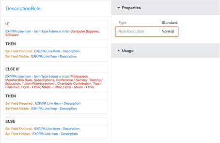 Verwaltungsmenü „UI-Regeln“ Mit der UI-Regeln-Verwaltung können Benutzer mit den entsprechenden Berechtigungen Details zu den Regeln bearbeiten und anzeigen, die für die Formulare und Kacheln Ihres Unternehmens gelten. So erhalten Sie einen vollständigen Überblick darüber, welche UI-Regeln sich auf das Verhalten von Belegpositionen und Headern auswirken und was die Regeln bewirken. Dieses Thema behandelt nur Regeln für die Benutzeroberfläche. Um andere Arten von Regeln zu erstellen und zu verwalten, siehe Verwaltungsmenü „Geschäftsregeln“. Der erlaubt Bildschirm derzeit nur eine begrenzte Bearbeitung von UI-Regeln. In zukünftigen Versionen werden wir die Unterstützung der Visualisierungsabdeckung weiter ausbauen und die Möglichkeit einführen, UI-Regeln zu erstellen und zu duplizieren. UI-Regeln-Verwaltung aktivieren Um die Vorteile dieser Funktion zu nutzen, muss ein Administrator sie über das Verwaltungsmenü Verwaltung der Zugriffsberechtigungen aktivieren. Damit kann Ihr Unternehmen den Zugriff auf Benutzerebene steuern, indem es die Funktion für alle Administratoren, nur für eine bestimmte Gruppe von Administratoren oder für mehrere Gruppen von Administratoren aktiviert. Wählen Sie die entsprechende Richtlinie aus und aktivieren Sie unter UI-Regeln die Option „Im Admin-Menü anzeigen“. Um den UI-Regeln-Editor zu aktivieren, markieren Sie „UI-Regeln bearbeiten“. Die Möglichkeit, Änderungen an UI-Regeln zu veröffentlichen, wird durch die Berechtigung „Changesets veröffentlichen“ unter Changeset Manager gesteuert. UI-Regeln-Verwaltung aufrufen Klicken Sie auf ADMIN-EINSTELLUNGEN > BENUTZEROBERFLÄCHE > UI-REGELN und wählen Sie ein Changeset aus. Ein Changeset ist nur eine Möglichkeit, Änderungen an der Benutzeroberfläche vorzunehmen, die verfolgt und bei Bedarf leicht rückgängig gemacht werden können. Sie können ein vorhandenes Changeset auswählen (z. B. eines, das Sie bereits erstellt haben und das die entsprechenden Änderungen enthält, die Sie vornehmen möchten) oder ein neues erstellen. Weitere Details dazu finden Sie unter Changesets erstellen und veröffentlichen. Sie sehen die vollständige Liste der UI-Regeln für Ihr Unternehmen. Verwenden Sie das Suchfeld, um eine bestimmte Regel zu finden, und klicken Sie darauf, um weitere Einzelheiten anzuzeigen. Gegenwärtig werden etwa 90 % der Kundenregeln mit vollständiger Visualisierung unterstützt. Für Regeln, die noch nicht visualisiert werden können, wird die Meldung „Diese UI-Regel wird derzeit im UI-Regeleditor nicht unterstützt“ angezeigt. UI-Regeln verstehen UI-Regeln müssen mit einem bestimmten Formular oder einer Kachel verknüpft sein, um ausgeführt werden zu können. UI-Regeln verbessern das Erlebnis der Benutzeroberfläche, indem sie u. a. folgende Möglichkeiten bieten: Standardwerte für Felder oder UDAs in einer Belegposition oder einem Header festlegen. Sie können die Felder oder UDAs einer Belegposition oder eines Headers ein- oder ausblenden, aktivieren, deaktivieren, erforderlich machen oder nicht erforderlich machen. Setzen Sie den Wert eines Feldes oder UDAs bedingt auf einen fest codierten Wert, den Wert eines anderen Feldes oder UDAs oder den Wert eines Personenattributs oder einer Personenliste. Auslöser UI-Regeln werden so definiert, dass sie auf Grundlage eines bestimmten Auslösers ausgeführt werden, der im UI-Regeleditor unter Eigenschaften > Regelausnahme angezeigt werden kann. In den Eigenschaften einer UI-Regel können Sie zwischen vier verschiedenen Auslösern für die Regelausführung wählen. Nur bei Berichterstellung: Bei UI-Regeln für Header bedeutet dieser Auslöser, dass die Regel nur dann ausgeführt wird, wenn der Benutzer eine neue Reisekostenabrechnung erstellt. Nur bei Belegpositionserstellung: Bei UI-Regeln für Belegpositionen bedeutet dieser Auslöser, dass die Regel nur ausgeführt wird, wenn eine Belegposition erstellt wird. Dies könnte z. B. für einen versteckten UDA verwendet werden, den die Reisenden nicht sehen müssen, der aber Informationen enthält, die für Genehmiger und beim Export enthalten sein sollten. Nur bei Feldabfrage: Die Regel wird ausgeführt, wenn sich der Wert eines angegebenen Feldes oder UDAs ändert und auf dieses Feld übertragen wird. Sie können zum Beispiel festlegen, dass das Feld „Zulässiger Betrag“ durch das Feld „Ausgegebener Betrag“ gefüllt wird. Das bedeutet, dass das Feld „Zulässiger Betrag“ den Wert des Feldes „Ausgegebener Betrag“ „abfragt“ und diesen Wert anpasst, wenn sich das Feld „Ausgegebener Betrag“ ändert. normal Diese Regel wird jedes Mal ausgeführt, wenn der Header oder die Belegposition gerendert wird, d. h. immer dann, wenn er/sie im Erstellungs-, Bearbeitungs- oder Anzeigemodus angezeigt wird. Dieser Auslöser kann mit dem Auslöser „Nur bei Feldabfrage“ kombiniert werden. Im folgenden Beispiel ist der Auslöser der Beschreibungsregel „Normal“, d. h. er wird immer dann ausgelöst, wenn die Belegposition gerendert wird. UI-Regeln bearbeiten Der UI-Regeln-Admin-Bildschirm kann verwendet werden, um Regelaktionen zu bearbeiten, die sich darauf beziehen, wie Felder angezeigt werden (Feld sichtbar/ausgeblendet, Feld optional/erforderlich und Feld aktiviert/deaktiviert einstellen) und um die Eigenschaften der Regelausführung zu bearbeiten. 1. Wählen Sie die gewünschte Regel in der Liste aus und klicken Sie auf BEARBEITEN. 2. Wenn Sie noch kein Changeset ausgewählt haben, werden Sie aufgefordert, jetzt eines auszuwählen oder zu erstellen. 3. Klicken Sie auf die gewünschte Aktion oder Eigenschaft, um Änderungen vorzunehmen. Hinweis: Wenn Sie den Bildschirm für die Verwaltung der UI-Regeln verlassen, bevor Sie Ihre Änderungen gespeichert haben, erhalten Sie die Warnmeldung „Nicht gespeicherte Änderungen“. 4. Wenn Sie fertig sind, klicken Sie auf SPEICHERN. Hinweis: Wenn Sie nicht für alle Aktionssegmente Werte auswählen, bevor 