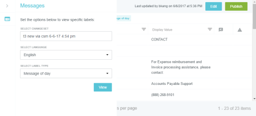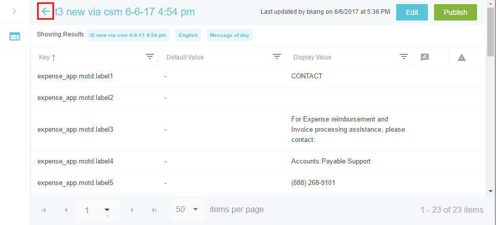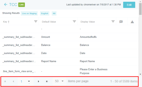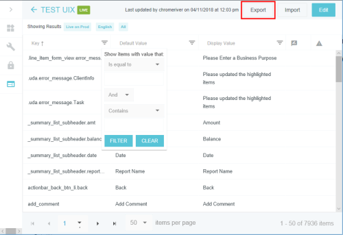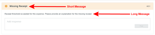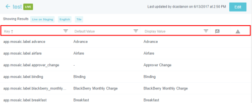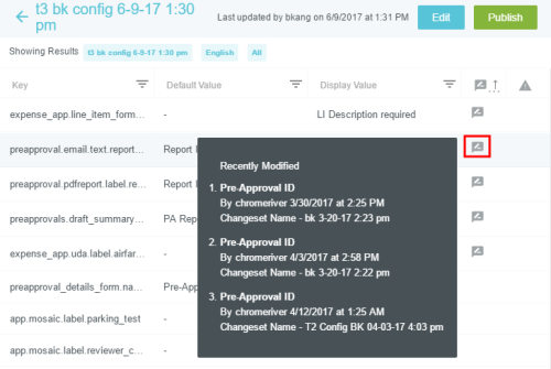 Textbeschriftungen auf dem Bildschirm anpassen Im Verwaltungsmenü „Nachrichten“ können Sie die Textbeschriftungen anpassen, die in der gesamten Benutzeroberfläche von Emburse Enterprise angezeigt werden – einschließlich Beschriftungen in allen von Ihrem Unternehmen unterstützten Sprachen – mit den folgenden Ausnahmen: Um Nachrichten mit Geschäftsregeln einfach anzupassen, verwenden Sie stattdessen das Verwaltungsmenü „Regelnachrichten“. Um Kacheln des Ausgabentyps anzupassen, verwenden Sie das Verwaltungsmenü „Mosaike & Kacheln“. Klicken Sie auf ADMIN-EINSTELLUNGEN > BENUTZEROBERFLÄCHE > NACHRICHTEN. Informationen zur Anpassung der Infos über die Firma auf der Willkommensseite finden Sie hier: Innerhalb eines Changesets suchen/sortieren 1. Wählen Sie das gewünschte Changeset. Ein Changeset ist nur eine Möglichkeit, Änderungen an der Benutzeroberfläche vorzunehmen, die verfolgt und bei Bedarf leicht rückgängig gemacht werden können. Sie können ein vorhandenes Changeset auswählen (z. B. eines, das Sie bereits erstellt haben und das die entsprechenden Änderungen enthält, die Sie vornehmen möchten) oder ein neues erstellen. Weitere Details dazu finden Sie unter Changesets erstellen und veröffentlichen. 2. Wenn Ihr Unternehmen Nachrichten in mehreren Sprachen anbietet, wählen Sie die gewünschte Sprache. Jede Sprache ist eine separate Nachrichtendatei. 3. Wählen Sie die Label-Art, die Sie bearbeiten möchten, oder wählen Sie Alle, um alle Label anzuzeigen. 4. Klicken Sie auf ANZEIGEN. 5. Die aktuellen Filterparameter erscheinen als blaue Tags oben in der Liste. Um die Filterkriterien zu ändern, klicken Sie einfach auf den blauen Pfeil links neben dem Changeset-Namen. Der Filter erscheint von links. 6. Die Seitensteuerung befindet sich beim Scrollen durch die Liste unten, damit Sie einfach durch die Seiten navigieren oder eine bestimmte Seite wählen können. 7. Die Liste lässt sich nach den Spaltennamen oben sortieren. Schlüssel: Jedes Stück Text in der Benutzeroberfläche hat eine eindeutige Kennung, einen „Schlüssel“. Standardwert: Der standardmäßige Emburse Enterprise-Wert für diesen Schlüssel. Das ist der Text, den Emburse Enterprise für Kunden, die andere Sprachen verwenden, in diese Sprachen übersetzt. Anzeigewert: Damit können Kunden den Standardwert mit diesem Text überschreiben. Beispielsweise kann ein Unternehmen den Standardbegriff „Flugreise“ zu „Flug“ ändern. Bitte beachten Sie, dass diese Standardanzeigewerte von Ihrem Unternehmen übersetzt werden müssen, wenn Sie Nutzern andere Sprachen anbieten. Bearbeitungssymbol: Wenn ein Wert in einem Changeset-Entwurf bearbeitet wurde, der noch nicht implementiert wurde, erscheint in dieser Spalte ein Symbol. Fahren Sie mit dem Mauszeiger über das Symbol, um Details zu den kürzlich erfolgten Änderungen zu sehen, zum Beispiel von wem sie stammen und wann sie vorgenommen wurden. Konfliktsymbol: Diese Spalte warnt Sie, wenn jemand eine Änderung an dem Wert vorgenommen hat, die sich von Ihrer Bearbeitung unterscheidet, und diese Änderungen bereits implementiert wurden. Fahren Sie mit dem Mauszeiger über das Symbol, um Details zu den widersprüchlichen Änderungen zu sehen, zum Beispiel von wem sie stammen, wann sie vorgenommen wurden und wann die Änderungen veröffentlicht wurden. Sie müssen den Konflikt lösen, bevor Sie Ihr Changeset veröffentlichen. Weitere Details finden Sie unter „Konflikte auflösen“ in Changeset-Manager. 8. Klicken Sie auf die Überschrift einer Spalte, um nach diesem Wert zu sortieren. Es erscheint ein Pfeil, der anzeigt, ob Ergebnisse in auf- oder absteigender Reihenfolge angezeigt werden. 9. Klicken Sie auf das Filtersymbol rechts neben einem Spaltennamen, um die Ergebnisse nach dieser Spalte zu filtern. Label hinzufügen Um ein neues Label über das Verwaltungsmenü „Nachrichten“ hinzuzufügen, müssen Sie die Schlüsselwerte für die Nachricht kennen, sowohl für die kurze Nachricht, die als Überschrift fungiert, als auch für die lange Nachricht, die als Beschreibung dient. Wenn Sie eine Bezeichnung für Nachrichten mit Geschäftsregeln hinzufügen, wird empfohlen, stattdessen das Verwaltungsmenü „Regelnachrichten“ zu verwenden. Wenn Ihr Unternehmen für die Anzeige mehrerer Sprachen konfiguriert ist, müssen Sie außerdem in jeder Sprachdatei Nachrichtenschlüssel erstellen und die kurzen und langen Nachrichten übersetzen. Der Nachrichtenschlüssel enthält ein Präfix, das von der Art der Regel, auf die verwiesen wird (Einreichungs-Compliance, Routing, Belegpositions-Compliance usw.), vom Nachrichtencode der Regel, auf die er verweist, und von der Nachricht selbst in diesem Format abhängt: Beispiele für Nachrichtenschlüssel expense_app.drlrules.line_item_compliance.short.201=Beleg erforderlich expense_app.drlrules.line_item_compliance.long.201=Sie benötigen einen Beleg für solche eine hohe Starbucks-Ausgabe. expense_app.drlrules.submit_compliance.short.303=Doppelte Position expense_app.drlrules.submit_compliance.long.303=Sie haben an diesem Tag bereits eine Uber-Ausgabe. Eine ist genug. preapprovals_app.drlrules.submit_compliance.short.210=Sie können den Mustang nicht als Ausgabe geltend machen preapprovals_app.drlrules.submit_compliance.long.210=Ich sagte, Sie können diesen Mustang NICHT als Ausgabe geltend machen! expense_app.drlrules.routing.long.30=Schauen Sie sich das an preapprovals_app.drlrules.routing.short.20=AP-Review invoice.drlrules.line_item_compliance.321=Zu viel Toilettenpapier auf dieser Rechnung. invoice.drlrules.line_item_compliance.short.423=Sie benötigen einen Beleg. invoice.drlrules.line_item_compliance.long.423= Sie können an einem Freitagabend ohne Beleg nicht so viel ausgeben, da wir nicht wissen, ob Sie mit den Jungs unterwegs waren oder tatsächlich gearbeitet haben. invoice.drlrules.submit_compliance.short.2203=Header-Beschreibung fehlt invoice.drlrules.submit_compliance.long.2203=Bi