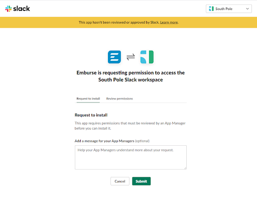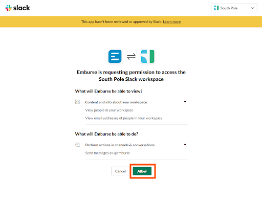 Emburse Enterprise-Benachrichtigungen über Slack erhalten Mit dem Slack-Konnektor von Emburse Enterprise können Benutzer entscheiden, ob sie bestimmte Benachrichtigungen über Slack erhalten möchten. Administratoren mit entsprechenden Berechtigungen können die Integration gemäß den folgenden Schritten einrichten. Slack Connector einrichten 1. Klicken Sie in den Admin-Einstellungen auf APP-INTEGRATION > VERBINDUNGEN. Klicken Sie anschließend auf VERBINDEN. 2. Wenn Sie nicht der Slack-Administrator Ihres Unternehmens sind, wird der folgende Bildschirm in einer neuen Registerkarte geöffnet. Wenn Sie der Slack-Administrator sind, fahren Sie bitte mit Schritt 8 fort. 3. Wählen Sie ggf. den richtigen Slack-Arbeitsbereich für Ihr Unternehmen in der oberen rechten Ecke aus. Klicken Sie dann auf SENDEN. 4. Sie werden zur Emburse-Seite im App-Verzeichnis von Slack umgeleitet, und die Anfrage wird als ausstehend angezeigt. 5. Der Slack-Administrator Ihres Unternehmens erhält eine Anfrage zur Genehmigung der Installation in Slack. Dem Slack-Administrator wird eine Bestätigungsnachricht in Slack angezeigt. 6. Wenn Sie nicht der Slack-Administrator Ihres Unternehmens sind, erhalten Sie eine Nachricht über Slackbot, sobald die Installation genehmigt wurde. 7. Klicken Sie nicht auf die Schaltfläche, um auf das App-Verzeichnis zuzugreifen. Kehren Sie stattdessen zur Seite der Verbindungsverwaltung in Emburse Enterprise zurück, und klicken Sie erneut auf die Schaltfläche VERBINDEN. 8. Sie müssen die Berechtigungen akzeptieren, um die Installation der App abzuschließen. Klicken Sie auf ZULASSEN. 9. Eine neue Registerkarte wird geöffnet, um zu bestätigen, dass die Installation abgeschlossen ist. 10. Wenn Sie zur Verbindungsverwaltung in Emburse Enterprise zurückkehren, sehen Sie, dass Slack installiert wurde. Benutzererfahrung Sobald die Slack-Installation abgeschlossen ist, sehen Benutzer die Option, Slack als Sendemethode für bestimmte Benachrichtigungstypen unter KONTOEINSTELLUNGEN > BENACHRICHTIGUNGSEINSTELLUNGEN auszuwählen. Benutzer erhalten die Benachrichtigungen innerhalb von Slack unter APPS > EMBURSE. War dieser Beitrag hilfreich? Ja Nein