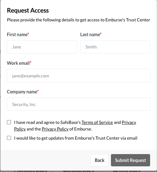 Sicherheitsdokumentation im Emburse Trust Center anzeigen Das Emburse Trust Center ist eine sichere Plattform, über die Emburse seinen Kunden auf einfache Weise sensible Sicherheits- und Compliance-Dokumente zur Verfügung stellen kann, darunter W-9-Formulare, Compliance-Zertifizierungen und häufig gestellte Fragen. 1. Navigieren Sie zu trust.emburse.com. 2. Wählen Sie Emburse Enterprise aus dem Auswahlmenü oben auf der Seite oder aus der Liste im Bereich Emburse Trust Center aus. 3. Auf dieser Seite finden Sie allgemeine Dokumente und Richtlinien zu Emburse. Um Dokumente zu Emburse Enterprise herunterzuladen, darunter SOC 1-, SOC 2-, ISO 27001-, ISO 27701- und PCI DSS-Dokumente, klicken Sie oben auf der Seite oder im Bereich „Dokumente“ auf Zugriff erhalten. 4. Geben Sie Ihre geschäftliche E-Mail-Adresse ein und klicken Sie auf Weiter. 5. Wenn die Domäne Ihrer E-Mail-Adresse mit einem bestehenden Kundendomänennamen übereinstimmt, erhalten Sie Zugriff auf bestimmte Produktinformationen im Trust Center, die Sie einsehen und herunterladen können. Wenn die Domäne nicht mit einer bestehenden Kundendomäne übereinstimmt, werden Sie aufgefordert, das Formular zur Anforderung des Zugriffs mit Ihrer E-Mail-Adresse und Ihren Unternehmensdaten auszufüllen. 6. Die Anfrage wird zur Überprüfung an das Sicherheitsteam von Emburse gesendet. Wenn sie genehmigt wird, erhalten Sie per E-Mail einen Link, über den Sie die Dokumentation aus dem Trust Center herunterladen können. War dieser Beitrag hilfreich? Ja Nein