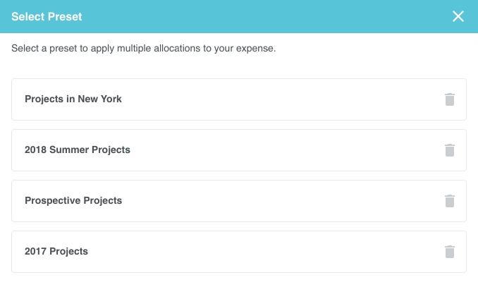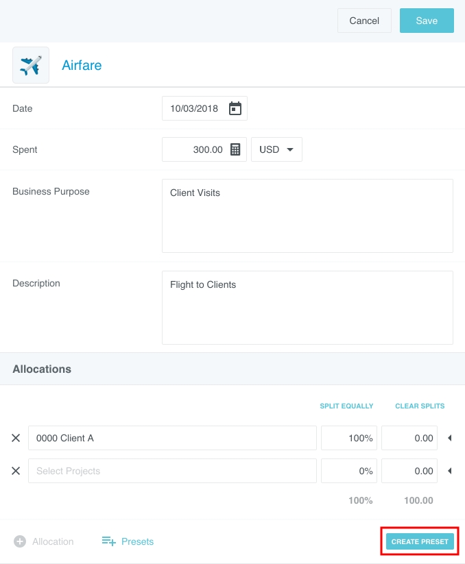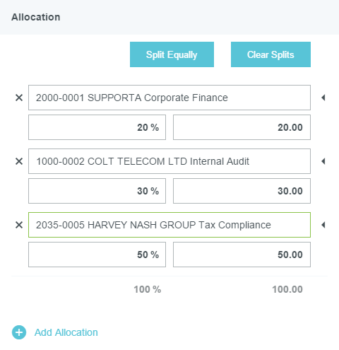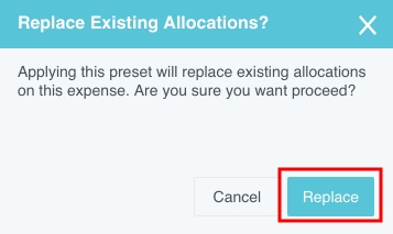 Allocate Line Items on an Expense Report Emburse Expense Enterprise provides the ability to easily search for allocations (which your organization may refer to as matters, cost codes or some other term) when allocating line items on an expense report. Choosing an Allocation After you select an expense type from the Add Expenses Screen, the Expense Entry screen opens to allow you to enter details about the expense, including the allocation number. Click the Search for Allocation field opens a drop-down list. Recently selected allocations will be listed at the top and indicated by a clock icon. Click the desired allocation to select it. As you begin to enter a name or number into the search bar, the list will automatically scroll to allocations containing that text. Split Allocation Emburse Enterprise gives users the ability to split one expense among multiple allocations. Click + ADD ALLOCATION. Two allocation fields will appear, with the first allocation populated at 100%. Click Search for Allocation to open the same drop-down list, and scroll or begin typing to find the desired allocation. By default, the expense will be split evenly among them. You may manually change the allocation amounts by changing the percentage or amount next to each allocation. The total percentage will be shown in gray at the bottom so you can be sure the adjusted amounts add up to 100%. It is best to do this after all allocations have been added, since the amounts will redistribute equally as each new allocation is added. Click ADD ALLOCATION to include more allocations for the split. Click SPLIT EQUALLY to distribute the expense equally among all allocations. Click CLEAR SPLITS to zero out all but the first allocation, which will be allotted 100% of the expense. Click the X on the left to remove an allocation. Allocation Grouping If your organization has activated this feature and you frequently use multiple allocations on a single expense, you may create preset allocation groupings for future use. 1. Once you have added all the desired allocations to a report, simply click CREATE PRESET to save that group with a unique name. 2. When you have entered a name, click CREATE. 3. The next time you need that group of allocations for a report, just click the PRESETS button in the Allocation section of the Expense Entry screen. 4. Find the desired group in the list and click to add it to the report. 5. You will be asked to confirm that you wish to replace any existing allocations. Click REPLACE. 6. The group of allocations you selected will now appear on your report. Was this article helpful? Yes No