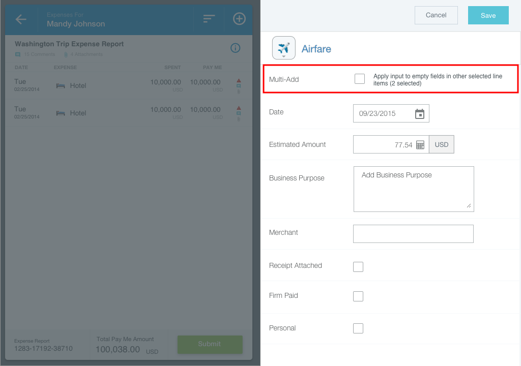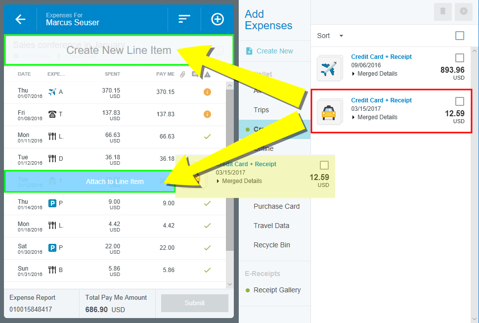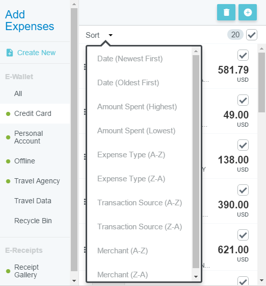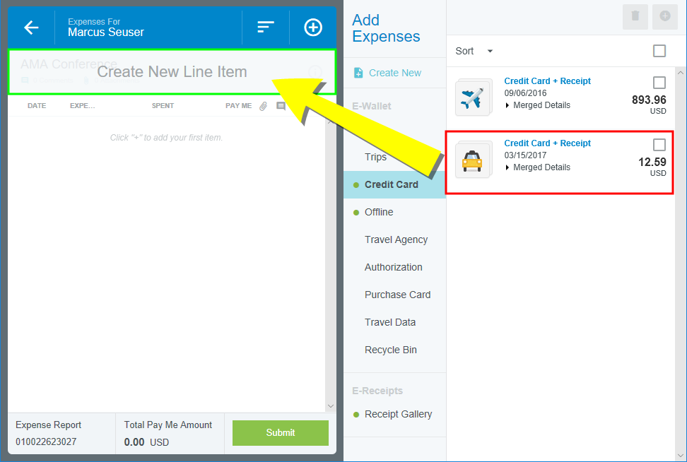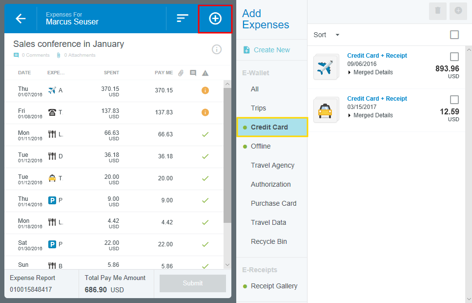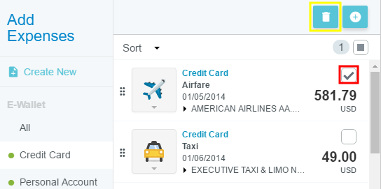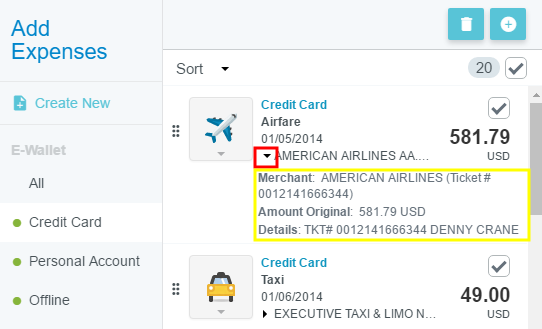 Add Credit Card Items to an Expense Report In addition to the Recycle Bin, your eWallet contains all the credit card items that have been automatically imported into Emburse Enterprise for you. It may take up to 3 business days for transactions to appear in Emburse Enterprise. Be sure to wait for the credit card transaction to appear in your Emburse Enterprise eWallet before creating a credit card expense. If you submit an expense with just the receipt before the transaction appears in Emburse Enterprise, you are requesting a cash reimbursement instead. View Credit Card Items You can access your eWallet credit card items by creating a new expense or opening a draft expense. Select the + BUTTON and then select CREDIT CARD to see your items. A green dot next to an expense category in the eWallet indicates that there are unused items available. If the credit card feed supports additional data, you will see an arrow next to a credit card expense that you may select to view additional details. If your organization uses the Emburse Credit Cards Gateway, select View Purchases to display item-level purchase information, including line items and merchant-level breakdowns. The same itemized purchase details that display in the eWallet also display in the Downloaded Details section after you add the credit card item to an expense. Note that credit card items may only be added to reports that are in the same currency as the posted expense. For example, if the original currency of the expense is EUR but it posts to the credit card in USD, that transaction may only be added to an expense report with a Pay Me amount in USD. Drag to Add an Item Users of wide-screen mobile devices may drag eWallet credit card items onto a report to create a new line item. If your device is too narrow to display the eWallet next to the report, see Add Multiple Items, below. Select the item you wish to add and drag it to the narrow "Create New Line Item" drop zone that appears over the report header area. If you drag the item anywhere else, it will not attach to the report. The Line-Item Entry screen will appear on the right and any attached receipt images will appear in the viewer on the left. Check the pre-populated line-item details, make any necessary additions or changes, and select SAVE. If your report already has line items on it, you may choose between attaching the credit card item to an existing line item or dragging it to the "Create New Line Item" drop zone. Add Multiple Items 1. To add multiple credit card items to your report, or to add a single item if your device's screen is too narrow to drag items, select the check box above the amount of the desired credit card item(s). 2. Next, select the blue + BUTTON in the upper right-hand corner to attach the item(s) to the report. 3. The radio button below the + BUTTON will display how many items have been selected. Selecting the radio button will change it to a check box. This will add all the credit card items to your report when you select the + BUTTON. 4. A new expense-entry window will open for each item, with the date and amount populated. Check the pre-populated line-item details, make any necessary additions or changes, and select SAVE. If your report already has line items on it, you may choose between attaching the credit card item to an existing line item or dragging it to the "Create New Line Item" drop zone. Bulk-Add Large Numbers of Items If your organization has activated the Multi-Add functionality, you may bulk-add numerous credit card items and only be required to fill out the Expense Entry screen once. After you have selected the check boxes for every credit card item you wish to add to the report and selected ADD, you will see a Expense Entry check box on the expense-entry screen. Select the box to apply the data you entered in the Expense Entry screen to all the credit card items you checked. This feature only works if all the items you selected are of the same type (in this case, Credit Card). Sort and Edit Items You can sort the items in the Credit Card list by selecting SORT in the upper left-hand corner of the list and selecting a sort criterion from the drop-down list. Choices include sorting by date, amount spent, expense type, transaction source and merchant. Select the arrow next to the name of the merchant to display more details about the item. If necessary, you can change the expense type of the credit card item by selecting its expense type tile and selecting a new expense type. Delete Items Users with appropriate permissions may delete credit card items. Deleting a credit card item from a draft expense report will return it to the eWallet. Selecting a credit card item in the eWallet and selecting the TRASH button will send it to your recycle bin rather than deleting it permanently. For more information, see Delete and Restore Items in the Recycle Bin. Was this article helpful? Yes No