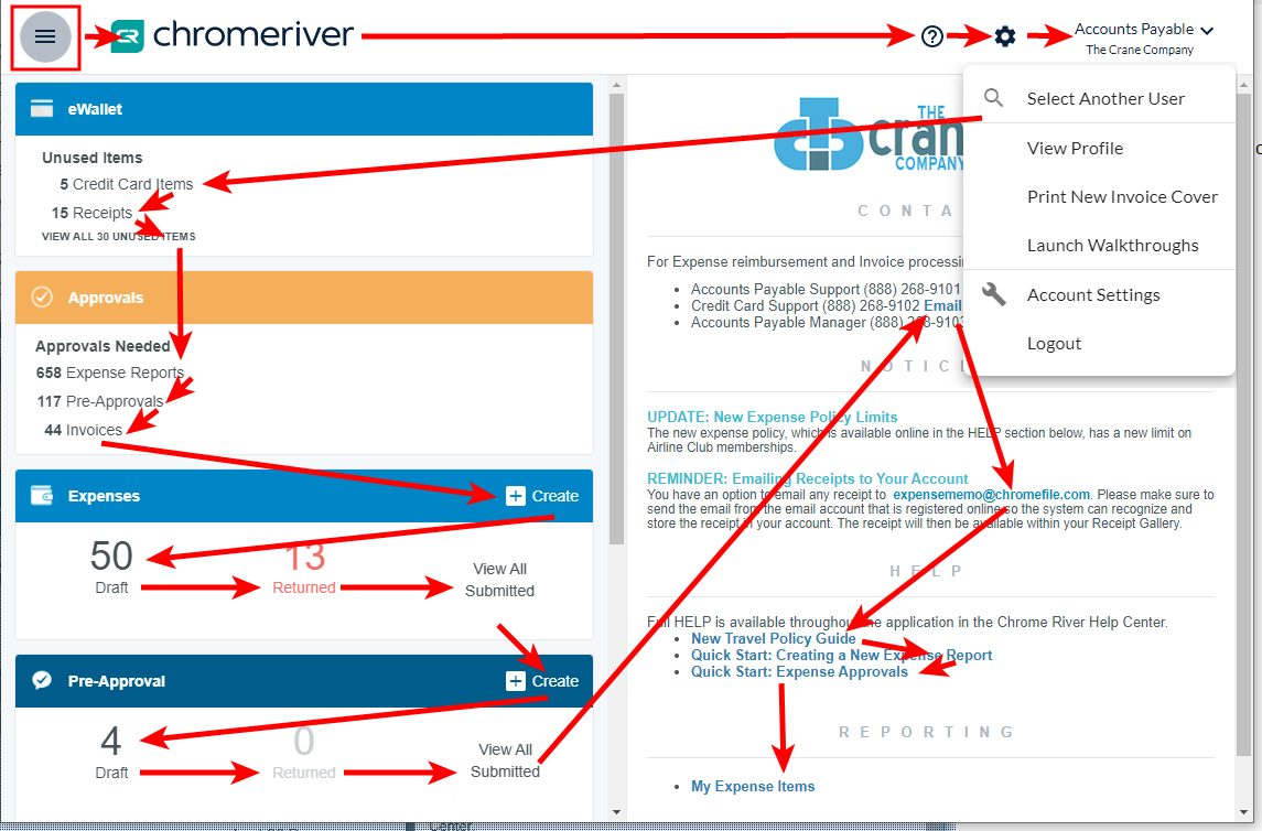 Navigating Emburse Enterprise The Navigation Bar remains at the top of your screen no matter where you are in the Emburse Enterprise application. Emburse Assistant If you're just getting started with Emburse Enterprise, Emburse Assistant is an invaluable tool located under the Help question mark in the upper right corner of Emburse Enterprise. In addition to a link to the Help Center, Emburse Assistant contains targeted announcements for users with administrator permissions and in-app guides for all users, including how-to walkthroughs and helpful tips. Announcements will pop up in the lower right corner of Emburse Enterprise when administrators log in. To view announcements later, simply click the Help question mark and select Announcements. Mouse/Touch Navigation Tap the QUESTION MARK icon to access the Emburse Enterprise Help Center. If you have appropriate permissions, you will see a GEAR icon that takes you straight to the Admin Settings menu. You may also access Admin Settings from the MENU in the upper left. Depending on the size of your screen, the Navigation Bar may display text or just icons. On smaller screens, the Help Center link is found in the USER icon drop-down menu. NAVIGATION Tap the MENU button in the upper left to navigate among the different Emburse Enterprise modules and go directly to the desired function in each. A menu will slide in from the left. If you are an approver, the items that require your approval will appear at the top. Depending on your organization’s configuration and your permissions, you may use the menu to access such features as expenses, invoices, the eWallet, eReceipts, Inquiry Reports, Emburse Analytics and the Admin Settings menu. Tap DASHBOARD to collapse the menu. HOME Tap the Emburse Enterprise Logo in the Navigation Bar to return to the Dashboard at any time. USER Depending on the size of your screen, you can click the USER icon or your User Name in the right corner of the Navigation Bar to see, choose, or act as a delegate; edit your account settings (including your password); access the Emburse Enterprise Help Center (on smaller screens); or log out of the application. Keyboard Navigation Users may also navigate among the user-interface elements inside Emburse Enterprise by using the Tab key. The first Tab keystroke will highlight the left navigation menu. The next Tab keystroke will highlight the Emburse Enterprise logo that functions as a “Home” button, and subsequent Tabs will highlight other options on the Dashboard in clockwise order around the interface. TAB: Move forward SHIFT then TAB: Move backward ENTER: Select a button or menu item ESC: Close an open menu or pop-up window Expense Report 1. Tab over to the + CREATE button and click ENTER. 3. Enter the Report name and tab through the remaining fields to enter the required information. 4. Tab though until the SAVE button is highlighted, then click ENTER to save. When creating and submitting expense reports and pre-approvals in Emburse Enterprise on a desktop device, you will need to press CTRL + ENTER for PCs or COMMAND + ENTER for Macs in order to save and leave edit mode. Click ESC to cancel. Was this article helpful? Yes No