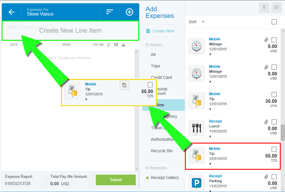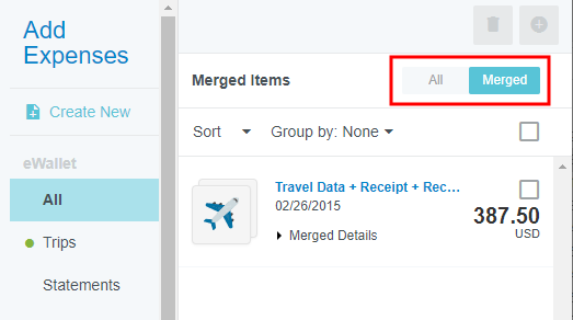 Attach eWallet Transactions to a Report The eWallet is where you will find all of your transactions, including Trips; Credit Card items; Personal Account items; Offline items submitted via the Emburse Enterprise mobile app, Snap & Send, or CR SNAP; Travel Agency items; Travel Data items; and Authorizations. You may see more or fewer types of transactions, depending on your organization’s configuration. The eWallet also gives you access to the Receipt Gallery, which stores images you have uploaded directly through the app. If you have unused items in your eWallet and your organization has configured this feature, counts of unused items by type will display in a banner on the home page when you log into Emburse Enterprise. Click a count to open the eWallet on the tab for that type of transaction, or click the VIEW ALL link to be taken to the All tab in the eWallet. Attach eWallet Items to an Expense Report From inside the expense report, click the + button to access the Add Expenses screen. Click on an eWallet category to see only that type of transaction, or click ALL to see every transaction. Click SORT to sort the list by numerous criteria. In All view, you may also use the drop-down to group items by Trips or Statements, if your organization takes advantage of these features. Use All view's toggle to display only merged transactions, if desired. To create a line item from an eWallet item, select its check box and then click the + button in the upper right corner. You may select and add multiple transactions simultaneously. On wide-screen devices, you may also drag a transaction from the eWallet to the name of the report to attach it and create a line item. As you drag, the report header will be overlaid with a "Create New Line Item" target area. Next, the Expense Entry screen will open for each item added to allow you to edit it or add more details. When you are done, click SAVE. Merge eWallet Transactions with Existing Line Items Desktop and wide-screen mobile device users may drag and drop eWallet transactions (e.g., credit cards, travel data) onto existing line items in order to merge them. If the dragged-and-dropped item is the primary transaction, the line-item editing form will open with the primary transaction data pre-populated. For credit card transactions only, certain fields like date and amount will be disabled to prevent alteration of the imported credit card data. If the item is not the primary transaction, it will simply be merged with the line item. Was this article helpful? Yes No
