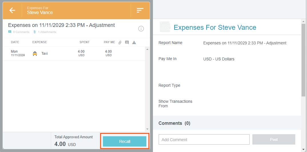 Expense Management Dashboard The Expense Management Dashboard allows users with appropriate permissions to view all the exported expense reports of individual expense owners in a central location, eliminating the need to delegate into individual users’ accounts. Users may open expense reports and view them as the expense owner would, including line items, attachments, and tracking details. Users with appropriate permissions may also recall exported reports from the Expense Management Dashboard. Admins may control user access to the Expense Management Dashboard via the Access Permissions admin screen. See "Expense Management Dashboard Permissions" in Access Permissions Admin Screen for details. Expense Management Grid 1. Click the MENU button in the upper left corner, then click EXPENSE MANAGEMENT. Note: Only users of wide-screen devices may access Expense Management; the menu item will not display on narrow-screen mobile devices. The Expense Management Dashboard will open. 2. Use the text box in the upper left to search for expenses by Expense Owner or Report ID. 3. Click a column header to sort the list of expenses by that criterion. Report Name Report ID Submit Date Status Export Date Expense Owner Pay Me (Amount) Approved (Amount) Currency You may drag a column header into the blue bar at the top of the screen to group the list of expenses by that column. To remove the group, click the X next to the column header name. 4. Click ADVANCED SEARCH to filter reports based on status. Preview Expenses Click once on an expense in the list to open a preview. Click the back arrow in the upper left to return to the Expense Management Dashboard. There are several actions you may perform directly from the preview: Profile Card: Click on the Report Owner's name to view their profile card. Open: Click to open the full report. Tracking: Click to view the approval routing path. Recall: If you have appropriate permissions, you will see the option to recall the report. Access the Expense Report Clicking OPEN in the expense preview will allow you to view the report as the expense owner would, including line items and attachments. Recall Expense Reports The Expense Management Dashboard can allow users with appropriate permissions to recall a fully exported report. The report will be sent to the Approval Dashboard of the user who recalled it. From there, that user may adjust the report or return it to the expense owner for adjustment. Note: This functionality is only recommended under certain specific circumstances. Admins may see "Expense Management Dashboard Permissions" in Access Permissions Admin Screen for details. If this feature has been activated, there are two ways to recall a report from the Expense Management Dashboard. 1. Click RECALL in the report's preview on the Expense Management Dashboard. 2. Or open the report and click the RECALL button there. Expense Management Security Your organization may choose to restrict access to certain expense reports on the Expense Management Dashboard via AuthorizeUser rules. Restricted users will see an "Access required to view this report" error message when they search for reports to which they have no access. If you are interested in activating this feature, contact Support. Was this article helpful? Yes No