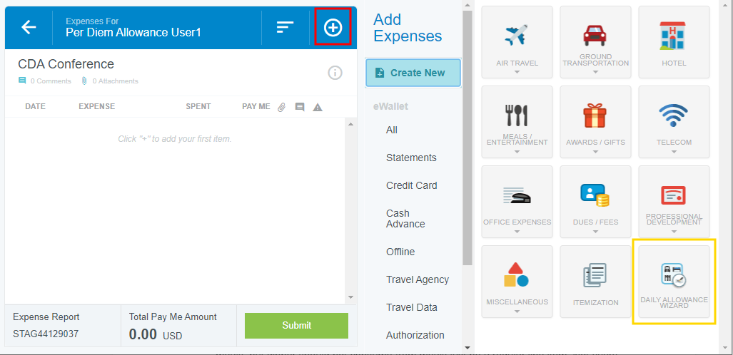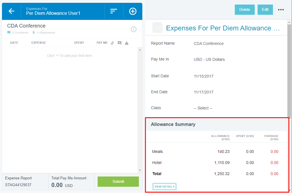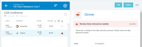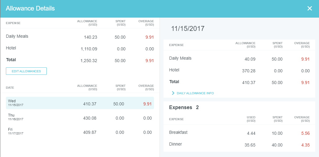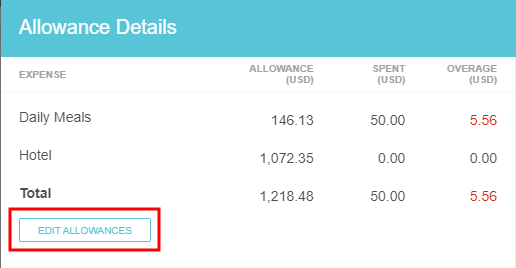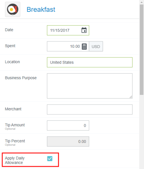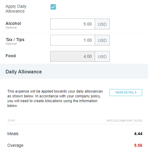 Add Daily Allowance Expenses to a Report Some companies allow employees to spend a specific amount per day on living and travel expenses associated with work. The amount usually varies by location and is defined by government guidelines. Emburse Enterprise's Expense Daily Allowance feature lets customers track actual spend against allowable spend via allowance line items on expense reports. While Emburse Enterprise’s Per Diem Expenses feature gives users a lump daily sum, Expense Daily Allowance only reimburses users for the actual amount spent on meals and lodging, and it tracks any overages. For example, if you are allowed $100 per day for meals and spend $10 on breakfast, $10 on lunch, and $150 on dinner, the system will fully reimburse breakfast and lunch but show that only $80 of dinner is within the allowance, with a $70 overage displayed on the expense report. Consult your Emburse Enterprise administrator to learn how your organization has chosen to handle overages. Additionally, allowances may be used across separate reports for the same user over the same dates. Complete details of all reports for that date may be viewed on a single Allowance Details screen. Create Daily Allowance 1. On the Add Expense screen, click CREATE NEW and click the DAILY ALLOWANCE WIZARD expense type in the mosaic. 2. Enter the details of the expense, including the full address in the Location field and Allocation, and click ADD TO PREVIEW. 3. The preview shows you the allowable spend for each day and lets you select deductibles, if necessary. Click APPLY. 4. An Allowance Summary will now appear in the report's header preview. 5. Click VIEW DETAILS in the Allowance Summary for complete information on the allowances for your selected location. The top section displays the total Daily Meals and Hotel amounts for the entire trip in the Allowance column. The bottom section shows the sum of the Daily Meals and Hotel amounts per day in the Allowance column. 6. Click EDIT ALLOWANCES to change the location or date; you will not be able to enter the amount. Once you have created allowances via the Daily Allowance Wizard, you may add line items to your report and apply the daily allowance to them. Add Meal Expenses 1. Create a new line item for the appropriate meal and check the APPLY DAILY ALLOWANCE box. Note that your organization may choose to automatically apply Daily Allowance without requiring you to check the box. 2. The amount will itemize in the Daily Allowance section to show you how much of the allowance will be used. Note that alcohol is never reimbursed by Daily Allowance, so it will display as an overage. Any alcohol expenses you enter must be paid for out of pocket. If your organization has disabled the ability to add alcohol expenses, you will not see the Alcohol, Tax/Tip or Food fields at all. 3. If you enter a Tax/Tips amount, it will be split based on the ratio of food to alcohol. Click SAVE. 4. When you add your next meal expense for the day, you will only be reimbursed up to the Daily Allowance amount. In the example pictured, the expense owner only had $35.65 in remaining allowance for meals that day, so $4.35 of a $40 dinner will be considered an overage. 5. Click VIEW DETAILS to see how the amounts are being calculated. Add Lodging Expenses 1. Create a Hotel expense and click ITEMIZE. As you create each applicable itemization, check the APPLY DAILY ALLOWANCE box. Note that your organization may choose to automatically apply Daily Allowance without requiring you to check the box. 2. Depending on your organization's configuration, you may only be able to apply Daily Allowance to Lodging, or you may be able to use the allowance for multiple hotel itemization types, like WiFi, parking or laundry. Additionally, there are multiple ways your organization may configure Room Tax. Consult your Emburse Enterprise administrator for more details on entering Room Tax. 3. For each day's Lodging itemization, you will only be reimbursed up to the Daily Allowance amount. In the example pictured, the expense owner only had $370.28 in remaining allowance for lodging that day, so $29.72 of a $400 hotel room rate will be considered an overage. 4. Click VIEW DETAILS to see how the amounts are being calculated. Edit Daily Allowance You may edit the Daily Allowance location, dates, deductibles and any other details except the amounts. 1. Click VIEW DETAILS in the Allowance Summary. 2. Then click EDIT ALLOWANCES. 3. You will be returned to the Daily Allowance Wizard to make changes to any details except the amounts. 4. If the amounts change as a result of your edits, you will receive a violation message on the affected line item(s). You will be unable to submit the report until you confirm the changes or correct the violation. 5. In the Daily Allowance section, click CONFIRM to accept the changes. Alternatively, if your organization requires you to split allocations when overages occur, you will need to manually adjust the those allocations according to the new Daily Allowance amount. Was this article helpful? Yes No