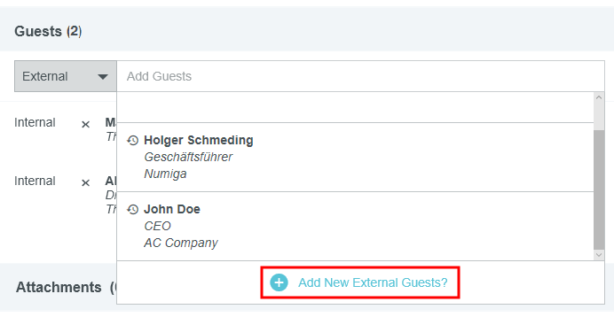 Add Guest Expenses to a Report Certain expense items, like meals and events, include the option to distinguish between attendees who belong to your organization and those who don’t. If you are already familiar with the Allocations functionality, you will find the Guest Selector functions similarly. The Guest Selector appears at the bottom of the expense entry screen. It automatically adds the expense owner as a guest, eliminating the possibility of counting him or her twice. Internal Guests Internal guests are those who are Emburse Expense Enterprise users at your organization. Emburse Enterprise automatically identifies internal guests who are listed in the InterAction database and adds them to line items automatically. They are distinguishable by a CRM Number. To add non-InterAction internal guests to a line item, click the Guests field to open the Guest Selection pane. Recently selected guests will be listed at the top. As you begin to type a name into the search bar, a list of all guests will appear in the lower half of the screen. Use the scroll bar to navigate through the list, if necessary. Then click the desired name to select it. External Guests External guests are all other types of guests who are not Emburse Enterprise users at your organization. Searching for external guests who are already in the system is the same process described above, with recent guests denoted by a clock icon. Add New Guest If the external guest is not in the system, click + ADD NEW EXTERNAL GUESTS. Multiple fields will appear to capture the new guest's information. Depending on your company's policies, you may not be able to click ADD until information has been entered into every field. Delete External Guest from History You may delete external guests from the guest selector drop-down in order to streamline and shorten the list of potential guests. Simply click the trash can icon next to external guests' names to remove them from the list. Other Guest Types Depending on your organization's configuration, you may see other types of guests in the Guest Selector drop-down menu. These are supplied by an integration with your organization's CRM system and may have different labels than the examples pictured below. Choose the appropriate type to access your organization's list of guest contacts. Guest Loader For large groups of guests, Emburse Enterprise's Guest Loader feature enables users to upload a list of guests directly to the report rather than entering each guest’s information by hand. Note that the uploaded file will replace any guest information already present on the expense. 1. Create a .CSV file containing internal guest names and any external guest names, including titles and companies. For internal guests you only need to list the guest's Emburse Enterprise Login name or the primary email address on the account. Optionally, you may specify an expense amount for each guest. If no amounts are given, the expense line-item amount will be divided evenly among all guests. Do not put commas in the CSV file; this will cause an Invalid File Format error. Click here for a sample .CSV file you can customize. Login Name First Name Last Name Title Company Amount svance 10.00 akram 10.00 Elrod Stooble Partner Dewey Cheatem & Howe 20.00 Hermione Anenome Partner Dewey Cheatem & Howe 20.00 2. Click the UPLOAD CSV button in the Guests area of the expense entry screen and attach the .CSV file. 3. You will be asked to confirm that you want to override any guests already entered on the report. Click UPLOAD. 4. An error message will alert you if the file is invalid or if specific rows need to be corrected. Allocation The system automatically divides the cost equally among each of the guests so that the total amount is 100% allocated. You may manually adjust the per-person percentages or amounts individually to reallocate portions of the expense. The total percentage will be shown in gray at the bottom so you can be sure the adjusted amounts add up to 100%. It is best to do this after all guests have been added, since the amounts will redistribute equally as each new guest is added. It is even possible to allocate a 0.00 amount to one or more guests, as long as the other guests' amounts add up to 100% of the total for that expense. Create Guest Expense from Meeting Invitation You may automatically import guests from business meals and meetings by inviting Emburse Enterprise as an attendee in an ICS calendar application like Gmail or Outlook. Once the actual expense enters Emburse Enterprise, you will be able to merge the Calendar event with the credit card transaction or the receipt to automatically populate guest data. The app will even be able to differentiate between Internal and External guests when creating the expense item, and the expense details will be populated automatically by the receipt or credit card item. 1. Add Emburse Enterprise to the ICS calendar meeting by sending an invitation to the same email address you use to submit receipts. (See Create Expense Items Via Email for more details.) 2. To see the expense automatically created by the calendar invite, navigate to the Offline section of the E-Wallet. 3. After the credit card transaction or receipt for the meal or activity associated with this calendar event has been imported into Emburse Enterprise, merge the two items and add them to your expense report. From inside the expense report, click + to add expenses, then click ALL to view all your eWallet items together. Select the calendar event and the corresponding receipt or credit card transaction, then click the MERGE button. 4. Now select the merged item and click the + button or drag it over to add it to the expense report 5. The line item you have created will open for editing. Scroll down to Guests to see the guest data captured from the calendar event. Emburse Enterprise’s software uses the email addresses of the other attendees to determine whether they are Internal or External guest