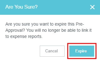 Expire a Pre-Approval to Release Encumbered Funds For customers who take advantage of Emburse Enterprise's Pre-Approval Encumbrance Budget feature, we run Pre-Approval Multiple Check rules on a scheduled basis in order to close (expire) pre-approvals and release the encumbered funds. Users with appropriate permissions may also manually expire an approved pre-approval—for example, when a planned trip has been canceled or when budgeted-but-unused funds need to be released. Additionally, users with these permissions may expire pre-approvals when they are working as delegates for other users who have these permissions. 1. Click the approved pre-approval in the Submitted Pre-Approvals list to open the preview. 2. On the Preview screen, click EXPIRE. This button is only accessible in the Preview, not if you open the pre-approval. On narrow screens you may need to click the three dots icon and select EXPIRE from the drop-down list. 3. On the confirmation screen, click EXPIRE. The pre-approval will remain in the Submitted Pre-Approvals list, but it will no longer be able to be linked to an expense. Was this article helpful? Yes No