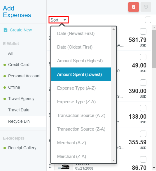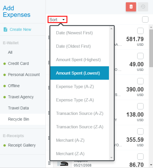 Delete and Restore Items in the Recycle Bin The Recycle Bin contains expense items that have been deleted from expense reports and your eWallet. It does not contain images that were uploaded directly to an expense report that has been deleted—to preserve these, you must detach them from the expense report via the paperclip button in the upper left corner of the Image Viewer before you delete it. They will be sent to the Receipt Gallery. The Recycle Bin also does not contain images that were uploaded directly to the Receipt Gallery first and then detached from or deleted along with an expense report—those return to the Receipt Gallery. However, the Recycle Bin may contain Receipt Gallery images that were processed by Emburse's AI-powered Optical Character Recognition (OCR) and turned into Offline items, added to a report, deleted from that report, and then returned to the Offline folder before being deleted. From the Recycle Bin you may either delete items permanently or restore them to the E-Wallet. You may sort the items in the Recycle Bin by clicking SORT in the upper left-hand corner of the list and selecting a sort criterion from the drop-down list. Choices include sorting by date, amount spent, expense type, transaction source and merchant. Click the check box in the upper right corner of an item to select it. Then click the RESTORE arrow button to send it back to your E-Wallet. Clicking the EMPTY trashcan button—regardless of whether any items have been selected via check box—will permanently delete all items in the Recycle Bin. Was this article helpful? Yes No