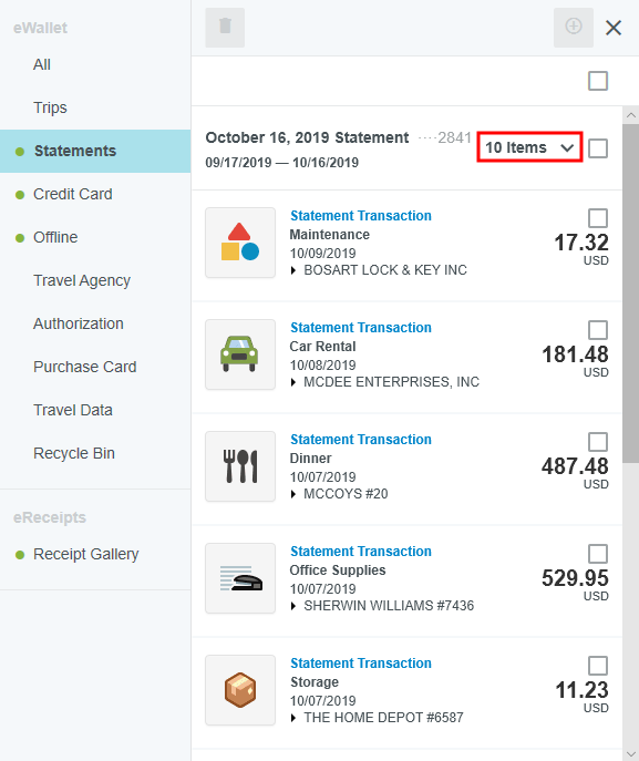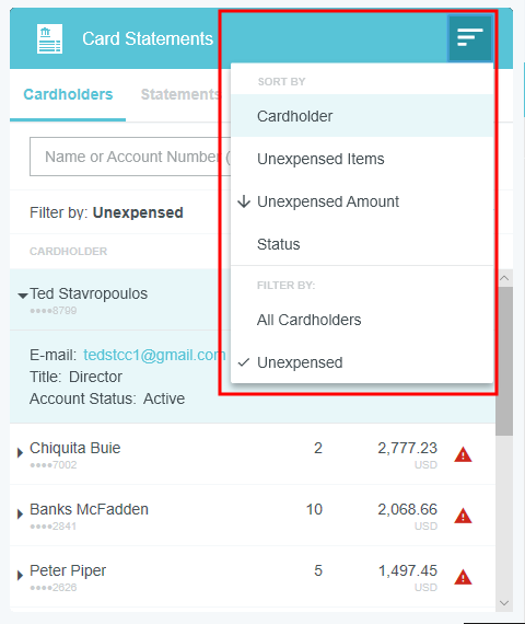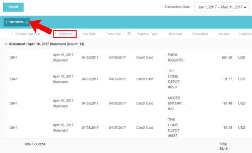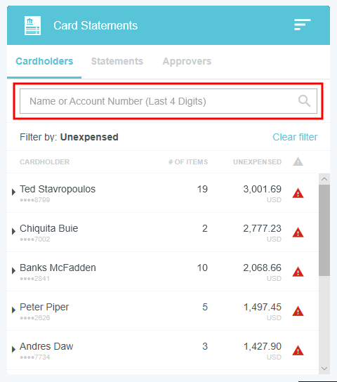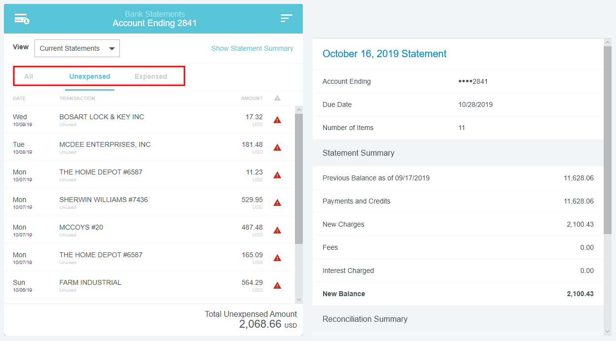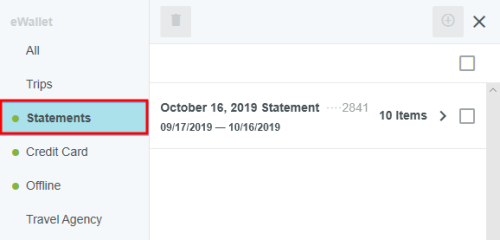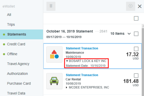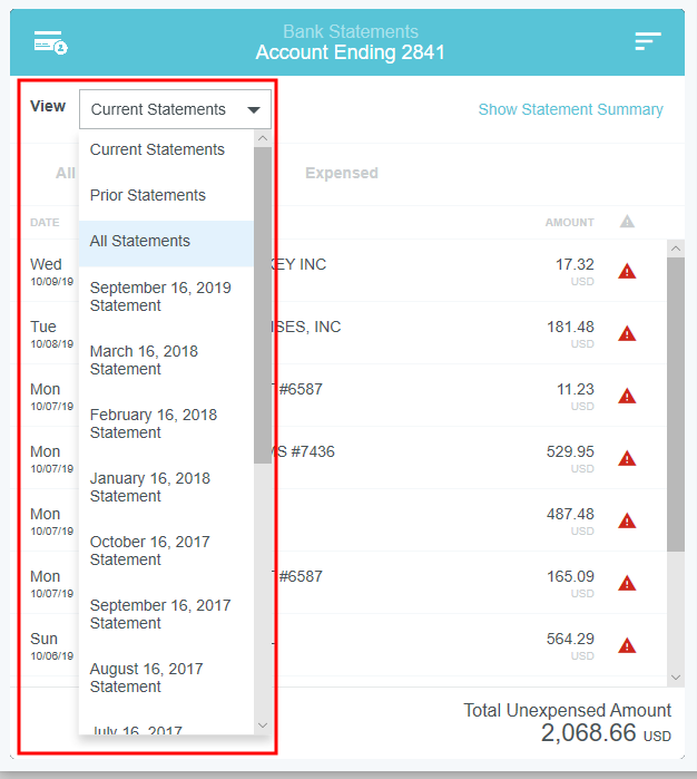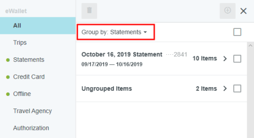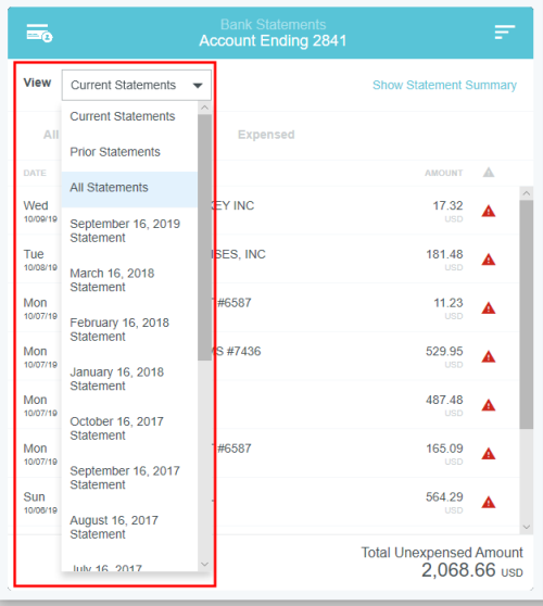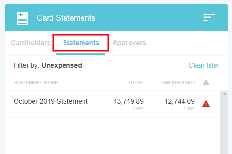 View Credit Card Transactions by Statement If your organization has activated the Statements feature, you may view credit card transactions grouped by statement, making it easy to add them to expense reports, see at a glance where that month's expense items are in the approval process, and automatically reconcile them with the corresponding credit card bill. This is especially helpful for users of individually billed cards, who can easily determine when a statement is due, which transactions have already been added to an expense report, and whether those transactions have been approved, exported and paid. Customers who do not wish to activate the Statements feature may still request to have corporate credit card transactions grouped by statement date for most credit card transaction feeds that provide the statement date. A configuration change to the credit card feed may be necessary. If you are interested in taking advantage of this feature, please submit a Support ticket. Group Expenses By Statement You can easily add all the expenses on one statement to an expense report directly from the eWallet. 1. On the All tab of the eWallet, click the GROUP BY drop-down at the top of the list. Or just click the STATEMENTS tab in the eWallet. 2. You will see the dates of the statement and the last four digits of the corresponding credit card. Click the arrow next to the total number of items to view all the transactions. 3. If necessary, click the arrow at the bottom of the Expense Type tile to change the expense type. 4. Click the arrow next to the vendor name to view further details. 5. To add all the transactions on that statement to an expense report, click the check box in the upper right to select all and then click the blue plus button. 6. You will have the option to add them to an existing draft expense report or to create a new one. 7. You will have the opportunity to enter details about each expense as it is added to the report. 8. Click the arrow in the gray bar under Downloaded Details to view further information about a transaction—for example, if you need help selecting an expense type. 9. All of the selected transactions will be created as line items on your report. Personal Cardholder Statements Dashboard If you have a credit card that you use for business expenses but are individually responsible for paying, the My Statements dashboard will show you your statement details at a glance. Current: The number of transactions on the current statement awaiting reconciliation and their total value. Prior: The number of transactions on previous statements still awaiting reconciliation, along with their total value. Upcoming Due: The days until the statement due date. Once the transactions are expensed, the number resets to 0. A negative number indicates that the newest statement was not loaded. 1. Click on CURRENT or PRIOR to be taken to the Bank Statements dashboard in the desired view. The statement's complete details will be displayed on the right. By default, only that statement's transactions unexpensed transactions will be displayed on the left. Click ALL to see every transaction on the statement. Click EXPENSED to see the transactions that have already been added to an expense report. 2. Warning indicators allow you to see each item's status at a glance: A red warning triangle indicates an item that has not been submitted on an expense report. An orange warning triangle indicates an item that has been submitted and is awaiting approval. 3. Click on an item to see more details in the pane on the right. If the item has been submitted, the Tracking section shows you where it is in the approval routing process and who is assigned to approve it. 4. You may use the View drop-down menu to filter what you see on the dashboard. Cardholder Statements Inquiry Report 1. To access Inquiry Reports, click the MENU button in the upper left corner and then click INQUIRY. 2. Select MY CREDIT CARD STATEMENTS. This report provides the status of all expense items associated with a credit card statement. If you have multiple credit cards, the report will automatically group statements by card. 3. Drag the Statement column heading onto the blue report header bar to group the results by statement. 4. For users who have multiple cards, drag the Account Last Four column heading onto the blue report header bar to create an expandable group of results by the last four digits of each credit card number. For complete details on using this screen, see View Inquiry Reports on Expense Activity. Corporate Accounts Payable Statement Management If you are a member of the Accounts Payable team, you can easily manage centrally billed credit card statements via the Company Statements dashboard. This allows you to see at a glance which transactions are remaining to be approved and who is responsible for expensing and approving outstanding transactions. Unexpensed Cardholders: The number of cardholders with unexpensed transactions. Unexpensed Statements: The number of statements still awaiting reconciliation. Upcoming Due: The days until the statement due date. A negative number indicates that the newest statement was not loaded. Click on CARDHOLDERS or STATEMENTS to be taken to the Card Statements dashboard in the desired view. Cardholders 1. In Cardholders view, you will see a list of all cardholders, the number of items and the total unexpensed amount of these items. Use the search box at the top to search by card holder name or account number. 2. Click on a cardholder to view user details—email address, title and account status—on the left and a list of all transactions for that user on the right. 3. Use the filter drop-down in the upper right to sort the Cardholders list. Statements Click the STATEMENTS tab to view details of individual statements. Approvers Click the APPROVERS tab to view all the transactions awaiting approval, grouped by approver. Credit Card Statements Reconciliation Analytics Reports The Cr