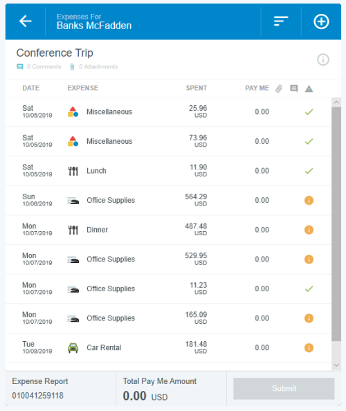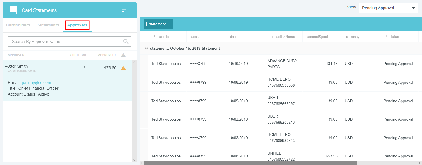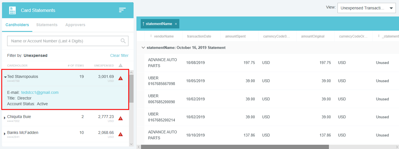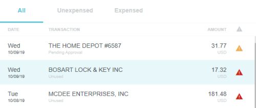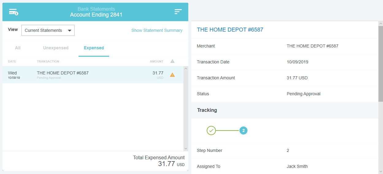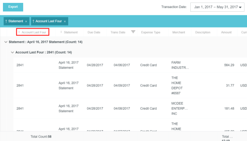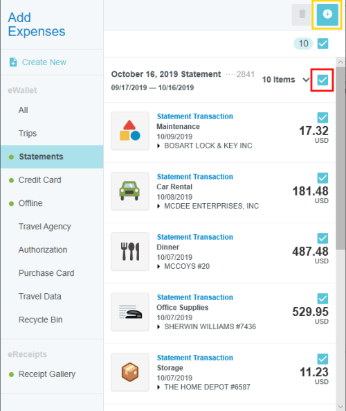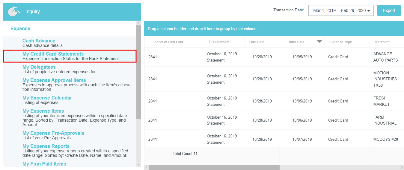 View Credit Card Transactions by Statement If your organization has activated the Statements feature, you may view credit card transactions grouped by statement, making it easy to add them to expense reports, see at a glance where that month's expense items are in the approval process, and automatically reconcile them with the corresponding credit card bill. This is especially helpful for users of individually billed cards, who can easily determine when a statement is due, which transactions have already been added to an expense report, and whether those transactions have been approved, exported and paid. Customers who do not wish to activate the Statements feature may still request to have corporate credit card transactions grouped by statement date for most credit card transaction feeds that provide the statement date. A configuration change to the credit card feed may be necessary. If you are interested in taking advantage of this feature, please submit a Support ticket. Group Expenses By Statement You can easily add all the expenses on one statement to an expense report directly from the eWallet. 1. On the All tab of the eWallet, click the GROUP BY drop-down at the top of the list. Or just click the STATEMENTS tab in the eWallet. 2. You will see the dates of the statement and the last four digits of the corresponding credit card. Click the arrow next to the total number of items to view all the transactions. 3. If necessary, click the arrow at the bottom of the Expense Type tile to change the expense type. 4. Click the arrow next to the vendor name to view further details. 5. To add all the transactions on that statement to an expense report, click the check box in the upper right to select all and then click the blue plus button. 6. You will have the option to add them to an existing draft expense report or to create a new one. 7. You will have the opportunity to enter details about each expense as it is added to the report. 8. Click the arrow in the gray bar under Downloaded Details to view further information about a transaction—for example, if you need help selecting an expense type. 9. All of the selected transactions will be created as line items on your report. Personal Cardholder Statements Dashboard If you have a credit card that you use for business expenses but are individually responsible for paying, the My Statements dashboard will show you your statement details at a glance. Current: The number of transactions on the current statement awaiting reconciliation and their total value. Prior: The number of transactions on previous statements still awaiting reconciliation, along with their total value. Upcoming Due: The days until the statement due date. Once the transactions are expensed, the number resets to 0. A negative number indicates that the newest statement was not loaded. 1. Click on CURRENT or PRIOR to be taken to the Bank Statements dashboard in the desired view. The statement's complete details will be displayed on the right. By default, only that statement's transactions unexpensed transactions will be displayed on the left. Click ALL to see every transaction on the statement. Click EXPENSED to see the transactions that have already been added to an expense report. 2. Warning indicators allow you to see each item's status at a glance: A red warning triangle indicates an item that has not been submitted on an expense report. An orange warning triangle indicates an item that has been submitted and is awaiting approval. 3. Click on an item to see more details in the pane on the right. If the item has been submitted, the Tracking section shows you where it is in the approval routing process and who is assigned to approve it. 4. You may use the View drop-down menu to filter what you see on the dashboard. Cardholder Statements Inquiry Report 1. To access Inquiry Reports, click the MENU button in the upper left corner and then click INQUIRY. 2. Select MY CREDIT CARD STATEMENTS. This report provides the status of all expense items associated with a credit card statement. If you have multiple credit cards, the report will automatically group statements by card. 3. Drag the Statement column heading onto the blue report header bar to group the results by statement. 4. For users who have multiple cards, drag the Account Last Four column heading onto the blue report header bar to create an expandable group of results by the last four digits of each credit card number. For complete details on using this screen, see View Inquiry Reports on Expense Activity. Corporate Accounts Payable Statement Management If you are a member of the Accounts Payable team, you can easily manage centrally billed credit card statements via the Company Statements dashboard. This allows you to see at a glance which transactions are remaining to be approved and who is responsible for expensing and approving outstanding transactions. Unexpensed Cardholders: The number of cardholders with unexpensed transactions. Unexpensed Statements: The number of statements still awaiting reconciliation. Upcoming Due: The days until the statement due date. A negative number indicates that the newest statement was not loaded. Click on CARDHOLDERS or STATEMENTS to be taken to the Card Statements dashboard in the desired view. Cardholders 1. In Cardholders view, you will see a list of all cardholders, the number of items and the total unexpensed amount of these items. Use the search box at the top to search by card holder name or account number. 2. Click on a cardholder to view user details—email address, title and account status—on the left and a list of all transactions for that user on the right. 3. Use the filter drop-down in the upper right to sort the Cardholders list. Statements Click the STATEMENTS tab to view details of individual statements. Approvers Click the APPROVERS tab to view all the transactions awaiting approval, grouped by approver. Credit Card Statements Reconciliation Analytics Reports The Cr