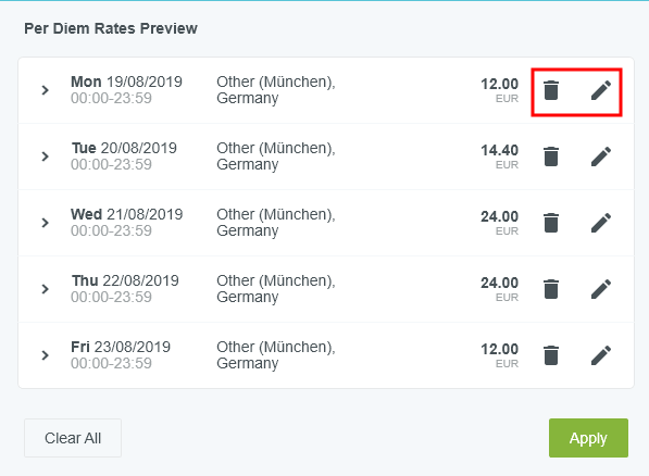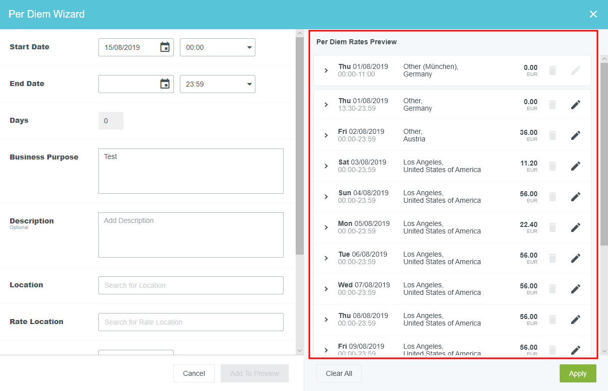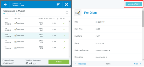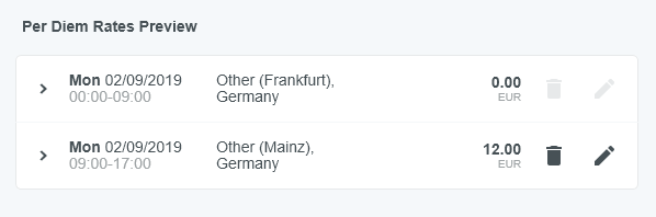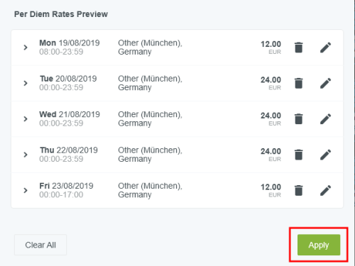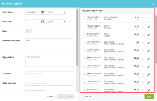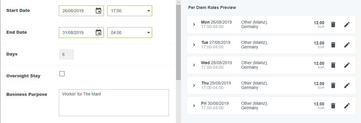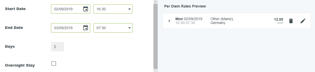 Add German Per Diem Expenses to a Report Per Diem expenses for organizations who do business in Germany are calculated differently from per diem expenses in other countries. The German Per Diem Wizard is designed to automatically recognize continuous trips that include multiple destinations so that users will receive full per diem reimbursement amounts on days that they travel to a different location, rather than the lower reimbursement amounts received on start and end travel days. The wizard also makes it easy to handle situations like border crossing, overnight stays and working in multiple locations on a single day. Per Diem Wizard On the Add Expenses screen, click CREATE NEW and select the Per Diem Wizard from the mosaic. Your company may have created this as a subcategory under a broader expense category, like Meals or Mileage. If you have already created per diem entries for previous trips on the same expense report, you will be able to preview these in the Per Diem Wizard. 1. Enter the Start Date and End Date of the trip, including the exact start and end times. For trips with multiple segments, enter the start and end dates for one segment at a time. The number of days of your trip/segment will be automatically calculated in the Days box. The Overnight Stay check box will appear for any trip/segment that spans two or more days. 2. Enter the Business Purpose (reason) for your trip. Depending on your organization's rules, a Description of the trip may be optional. 3. Next, you must enter the exact address of the workplace location you traveled to. You may search for it in the location-selector drop-down one of two ways: Begin typing the full address and select the correct one from the suggestions. Begin typing the name of the location or institution (e.g., LAX airport or Disneyland) and select the correct one from the suggestions. Depending on the location you choose, the Rate Location may automatically populate or you may be required to select the correct location from a drop-down. 4. Enter the Allocation that will apply to all entries created with these details. 5. Click ADD TO PREVIEW to see the entry you created in the Per Diem Rates Preview screen. Note: This does not save your entry as a line item. You must click APPLY in the Per Diem Rates Preview screen to save entries as line items. Per Diem Rates Preview Here you will see the dates, times and location for each entry. Delete: Click the trash can icon to remove an entry. Edit: Click the pencil icon to edit an entry. Deductibles: Click the arrow to the left of the date to check off per diem items for which you do not need to be reimbursed. For example, if you did not use your per diem to pay for lunch because it was provided at the conference you attended, checking the "Lunch" box will reduce your reimbursement by the amount that your company allows for lunch. Clear All: If you need to make a change that affects all entries, click CLEAR ALL to delete all the entries and start over in the Per Diem Wizard. When you are satisfied with the entries you have created, click APPLY to save them to the expense report as line items. Edit Per Diem Items Once you have created and saved an entry as a line item, the only way to edit it is to return to the Per Diem Wizard. Select the item and click VIEW IN WIZARD in the preview. Once you are in the Per Diem Wizard, you may delete or edit individual entries. Note that, under certain circumstances, you may not be able to delete or edit an entry because it would affect the logic of all the other entries. In this situation, you must click CLEAR ALL entries and start over. Overnight Stay The Overnight Stay check box is used for German Per Diem trips of two or more days to create one continuous entry. The box is checked by default when you create a multi-day entry. Unchecking the Overnight Stay box allows you to document commuter trips where you don't sleep over, creating individual entries for each day, rather than a continuous group of entries. For example, if you traveled to another location to work but returned home each day to sleep, you would uncheck the Overnight Stay box when creating your per diem expense. Overnight Stay Box Checked Overnight Stay Box Unchecked Unchecking the Overnight Stay box also allows you to merge a two-day trip without an overnight stay into a single day or remove a day if the trip is longer than two days. This type of trip will only be created if the start time of the first day is later than 16:00 and the end time of the last day is earlier than 08:00. If the total number of hours for a day is below eight, a 0.00 amount will be calculated. Otherwise, a half-day rate will be calculated. For multi-day trips with no overnight stay where the pre-midnight portion is longer than the post-midnight portion, the last day of the trip will be discarded. For example, if you worked from 17:00 to 04:00 every day of your trip, the first day of your trip (on which you worked from 17:00 to 23:59) will be counted but the last day (on which you worked from 00:00 to 04:00) will be discarded. Conversely, if the post-midnight portion of your working hours is longer than the pre-midnight portion, the first day of the trip will be discarded. Multiple Locations on One Day The German Per Diem Wizard allows you to enter multiple working locations for a single day, but you will only be reimbursed at the rate of the longest entry for that day. However, all locations will display in the preview for your reference, with a 0.00 rate for all the earlier entries. Border Crossing The Border Crossing section of the Per Diem Wizard will be activated when the following three conditions are met: The trip is two or more days. The Overnight Stay box is checked. Travel is to a country outside of Germany. You will need to enter the local date at which you reached your destination, and the local date at which you departed from the destination. Note that border-crossing entries may only be created as new en