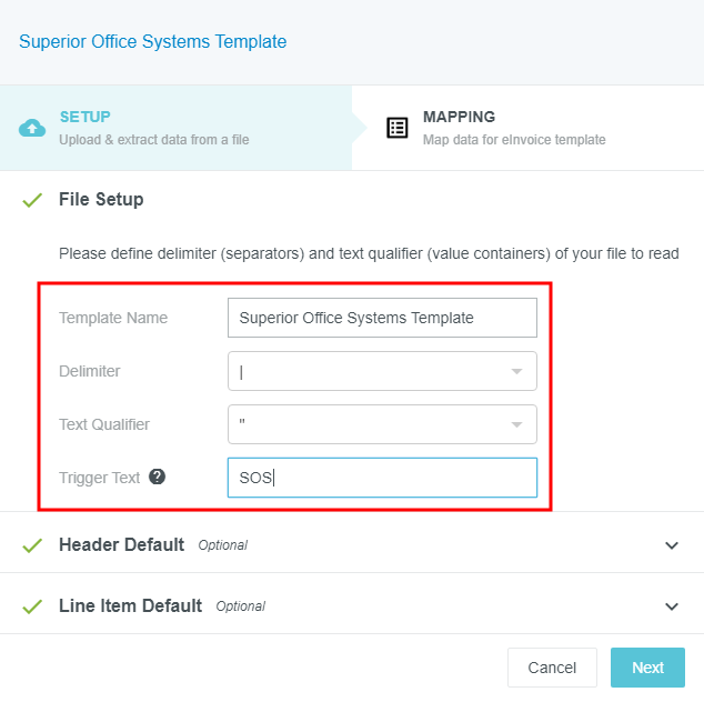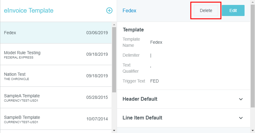 Automatically Format eInvoice Data via Mapping Templates Emburse Enterprise's eInvoice mapping template functionality allows you to create templates that convert incoming supplier eInvoice data files from their proprietary format into your organization's specific format via mapping. You can create different templates for each supplier and use them over and over. Once a template has been created, that supplier's eInvoice files can be systematically imported and processed in Emburse Invoice Enterprise directly from their native format. Note that, while you cannot specify an image to add to each invoice record at the time of creation via mapping templates, you can add an image to the invoice record after it has been created, just as you would with any other invoice record. The configurable eInvoice business rules that subsequently run when eInvoice data files are processed provide virtually unlimited flexibility in validating data and/or populating data, allowing you to create invoice records that contain both supplier-provided data and data required by your organization. Emburse Enterprise's existing line-item compliance- and routing-rule process is integrated within eInvoice, ensuring that the resulting eInvoice records are highlighted for any compliance issues and routed based on invoice-specific conditions for either exception or approval processes. Access eInvoice Templates Admin Users with appropriate permissions may access the eInvoice Template admin screen by clicking Admin Settings > Maintenance > eInvoice Templates. Create a New eInvoice Template 1. To create a new eInvoice template, click the + button. 2. Under File Setup you will define the delimiter (separator) and text qualifier (value containers) so that the system will be able to read the supplier-generated data files you upload. Template Name: Give your template a name that will help you distinguish it. Delimiter: Select whether a pipe character, a semicolon or a comma is used to delimit data in the supplier-generated data files. Text Qualifier: Select whether a single or a double quote is used to specify what is text and what is not. Trigger Text: This is the text that will enable your template to be associated with vendor-supplied files. You will place it at the beginning of the name of the files you want this template to be able to process. Note: No two templates may have the same trigger text, so you will need to vary the names if you need more than one template per supplier. 3. Next, you may optionally add key invoice header and line item data fields values that you wish to have added by default, including Header-level descriptions and line-item fields like cost codes, GLs and matters. Header Defaults: Use the drop-down boxes to search for and select the appropriate name, address and/or requester. You may also enter a Check Memo and a Description. All of these are optional. Line-Item Defaults: Use the drop-down boxes to select a default expense type, cost code and/or allocation. All of these are optional. 4. Click NEXT. 5. Upload a sample data file from your supplier to map it to Emburse Enterprise's format. At this time, all supplier files must be pipe-, semicolon- or comma-delimited; tab-delimited files cannot be accepted. Uploaded File: Click ADD ATTACHMENTS to select the desired file. Header Included: If the first row of the data file contains column header information, select YES. Note: When mapping, if you specify that your mapping file has a column header, the app assumes all subsequent files have a header. 6. Once you have uploaded a sample data file, the Data Mapping section will populate the data to allow you to map the supplier's column names to Emburse Enterprise's names. Then every file with the trigger text at the beginning of its name that is uploaded to Emburse Enterprise's FTP server will automatically be mapped to the correct format for processing. Column: The number of each column in the data file. Column Name: The field names provided by your supplier if the file has a header row. Every column name in the header must be fewer than 50 characters long. Sample Data: The data values from the supplier's file. Emburse Enterprise Mapping: The Emburse Enterprise equivalent of each field name. See Emburse Enterprise Mapping, below, for more details. Format: The way the data is formatted, if applicable. See Emburse Enterprise Mapping, below, for more details. Emburse Enterprise Mapping The Data Mapping section allows you to manually map each header or line item value provided by the supplier to its equivalent in Emburse Enterprise. 1. Use the drop-down menu on each line to select the Emburse Enterprise Mapping value. If there is no equivalent, select NONE. Only the Invoice Number is required to be mapped, but it is helpful to map as many fields as possible. 2. Certain data fields require you to specify the way they are formatted (e.g., to indicate the order of month and day in a date). These may be selected from the Format drop-down menu. If a data field requires no special format, the only option will be ANY STRING. 3. You must click SAVE after each row is mapped or the changes won't take effect. 4. See Uploading eInvoice Data, below, for complete instructions on using your new eInvoice template. Deleting an eInvoice Template 1. To delete a template, select it in the list and click DELETE. 2. Click DELETE in the confirmation pop-up window. Uploading eInvoice Data Once the template has been saved and the corresponding eInvoice rules have been configured, you can submit the supplier-generated files that the eInvoice mapping template will read and transform into a format that the Emburse Enterprise application can process. 1. Be sure the supplier-generated file name starts with the appropriate trigger text you included during template creation. 2. Place the supplier-generated data file on your Emburse Enterprise-provided FTP site in the appropriate location: /files/eInvoice/[environment] Note: [environment] cor
