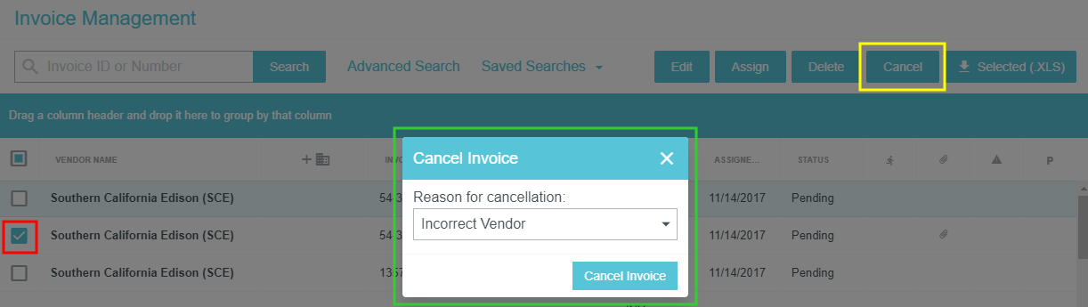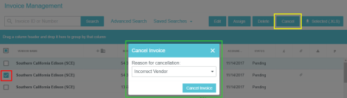 Cancel or Delete an Invoice via the Invoice Management Dashboard There are two ways to remove an invoice from the approval process: Cancel: Stops an invoice from routing through the approval process without removing it from the system entirely. The invoice is still visible on the Invoice Management Dashboard, as results in duplicate checking, and via the Exported Invoices standard report in Emburse Analytics (use Update filter: Invoice Header Invoice Status is Canceled). Canceling is available for invoices of any status except Draft. Delete: Removes an invoice from Emburse Enterprise completely. The only way to see any of its details is to run the Emburse Analytics Invoice Spend Detail standard report (use Update filter: InvoiceHeader Status is Deleted and add the fields Invoice Header Create Date and Invoice Creator FullName). Deleting is available for invoices of any status except Paid, Exported, or Cancelled. Cancel an Invoice 1. Select the desired invoice in Invoice Management and click CANCEL. 2. On the pop-up screen, you will be asked to select from a list of cancellation reasons. For details on how to set your company's list of cancellation reasons, see Configure Invoice Cancellation Codes in the Invoice Management Dashboard help article. Delete an Invoice Select the desired invoice in Invoice Management, click DELETE, then click DELETE again to confirm. Was this article helpful? Yes No