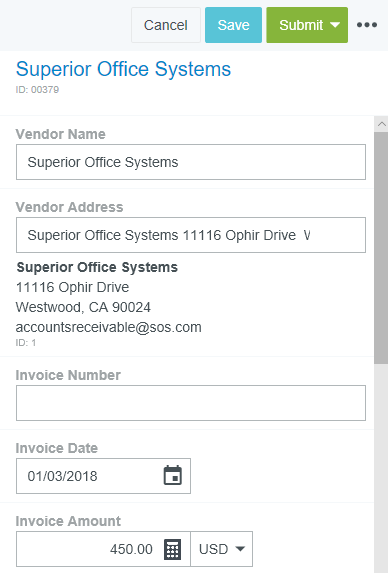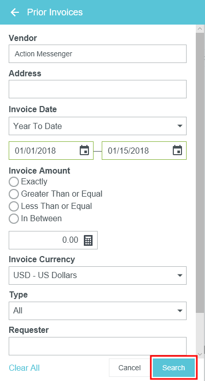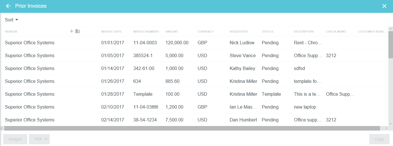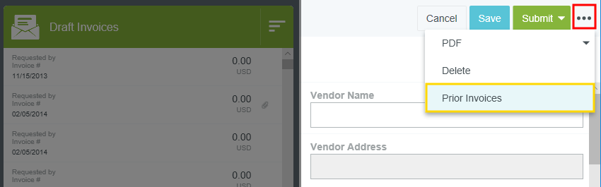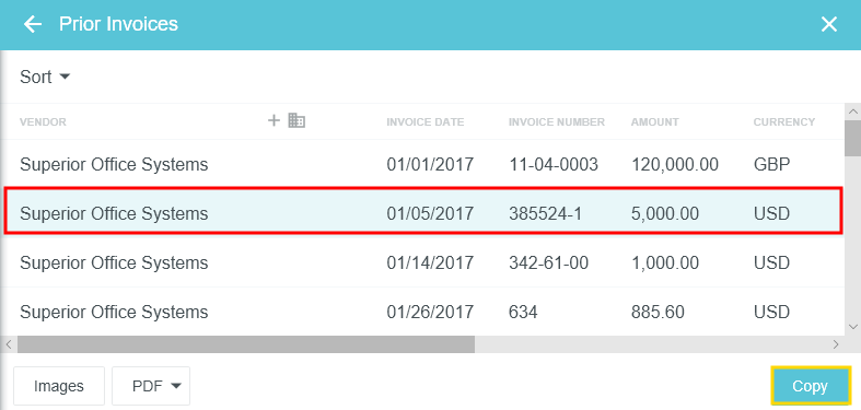 Copy Prior Invoice Details into a New Invoice During the creation of a new invoice, Emburse Invoice Enterprise allows you to search and access prior invoices from a specific vendor. This is a great tool for viewing the invoice history for that vendor and ensuring you are not processing a duplicate invoice from them. It also allows you to copy the details of a previous invoice into a new invoice, including any tax rates associated with the header and line items. Note that tax rates will be based on the date of the invoice being created, not the date of the prior invoice. Tax amounts on the header will need to be entered manually, but they will be calculated automatically on any line items. Search for Prior Invoices 1. On the New Invoice screen, click the three-dots button and then click PRIOR INVOICES. Begin typing the vendor name in the VENDOR field, then click on the desired vendor when it appears. 3. You may filter your invoice search by Address Invoice Date: Use the drop-down menu or select custom dates using the calendar icons. Invoice Amount: Select the function (Exactly, Greater Than or Equal, etc.) and then enter the amount in the box below. Invoice Currency Type: Filter for invoices or templates, if your organization uses them Requester Customer Address Click SEARCH. View Prior Invoices The Prior Invoices grid provides you with a quick summary of the invoice details. On wide-screen devices, you will see a list of prior invoices in a grid. On narrow-screen devices, each invoice will be listed in its own square. To view a specific invoice, click it in the list, then click the IMAGES button in the lower left corner. On a narrow-screen device, you will need to click the three dots icon to access the IMAGES button. Click the PDF button to view the invoice's Cover Page, Full Report or Full Report Image. Copy Prior Invoice You may copy the details of an invoice previously created in Emburse Enterprise to create a new invoice. Note: If the status of the invoice on this screen is “Converted,” the invoice record was NOT processed in Emburse Enterprise and no detailed invoice information is available in Emburse Enterprise to be copied. 1. Select the invoice you would like to copy and click COPY. 2. Fill out the Confirmation screen with the new invoice date and invoice amount. Click COPY. 3. A new invoice will be generated for you with the line-item data from the prior invoice updated to reflect the new invoice total. You may now fill out the remaining fields for the invoice and continue processing it. Was this article helpful? Yes No