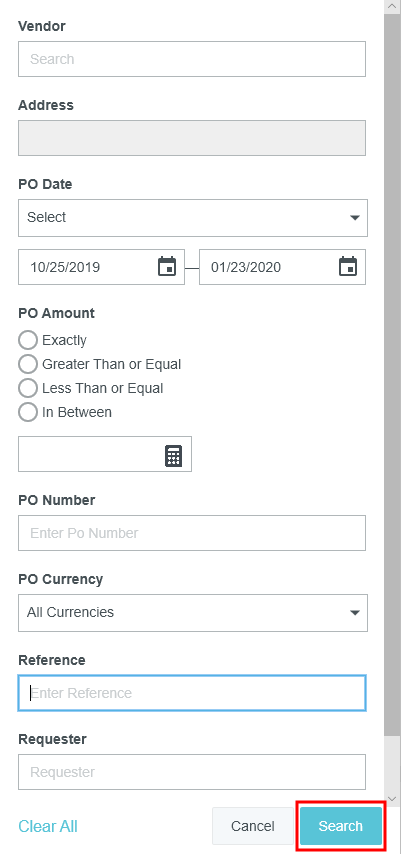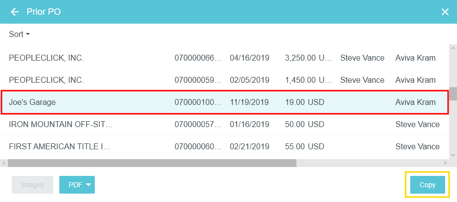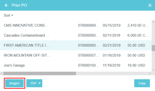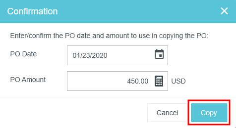 Copy Prior PO Details into a New PO During the creation of a new purchase order, Emburse Enterprise PURCHASE ORDER allows you to search and access prior purchase orders from a specific vendor and copy the details into a new purchase order. Search for Prior Purchase Orders 1. On the New Purchase Order screen, click the three-dots button and then click PRIOR PO. 2. If a vendor has been selected on the current PO, the search results will automatically populate with results for that vendor from the last 90 days. Otherwise, begin typing the vendor name in the Vendor field, then click on the desired vendor when it appears. A clock icon appears next to recently used vendors. 3. You may filter your purchase order search by Address PO Date: Use the drop-down menu or select custom dates using the calendar icons. PO Amount: Select the function (Exactly, Greater Than or Equal, etc.) and then enter the amount in the box below. PO Number PO Currency Reference Number Requester Creator Click SEARCH. View Prior Purchase Orders The Prior PO grid provides you with a quick summary of the purchase order details. On wide-screen devices, you will see a list of prior purchase orders in a grid. On narrow-screen devices, each purchase order will be listed in its own square. Select the desired purchase order in the list and click the PDF button to view the PO Report or Full Report. If a purchase order has an image attached, the IMAGES button in the lower left corner will be active. Click the button to view the image. Copy Prior Purchase Order You may copy the details of a purchase order previously created in Emburse Enterprise to create a new purchase order. All the header and line-item data from the prior purchase order will be copied into the new one. 1. Select the purchase order you would like to copy and click COPY. 2. Fill out the Confirmation screen with the new purchase order date and amount. Click COPY. 3. A new purchase order will be generated for you with the line-item data from the prior purchase order updated to reflect the new purchase order total. You may now fill out the remaining fields for the purchase order and continue processing it. Was this article helpful? Yes No