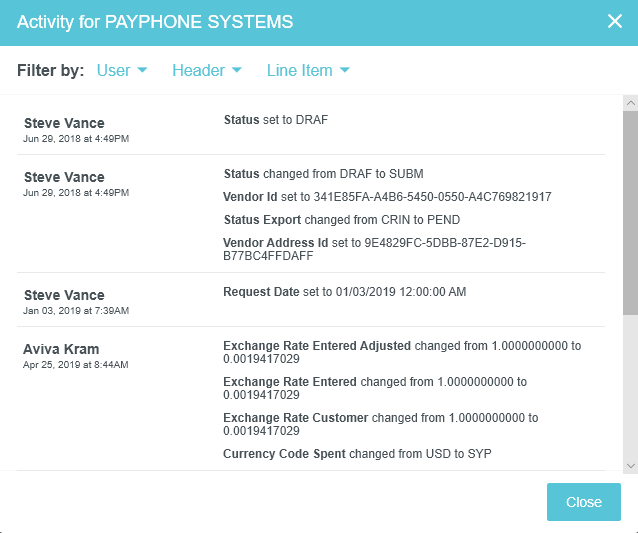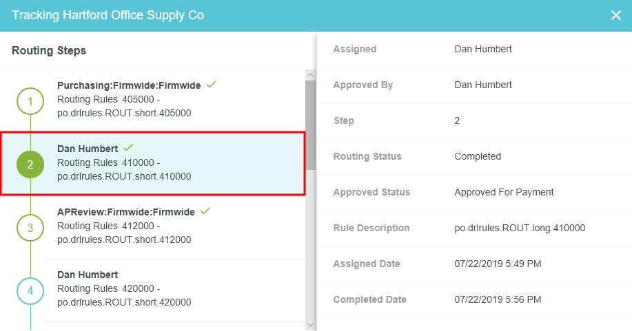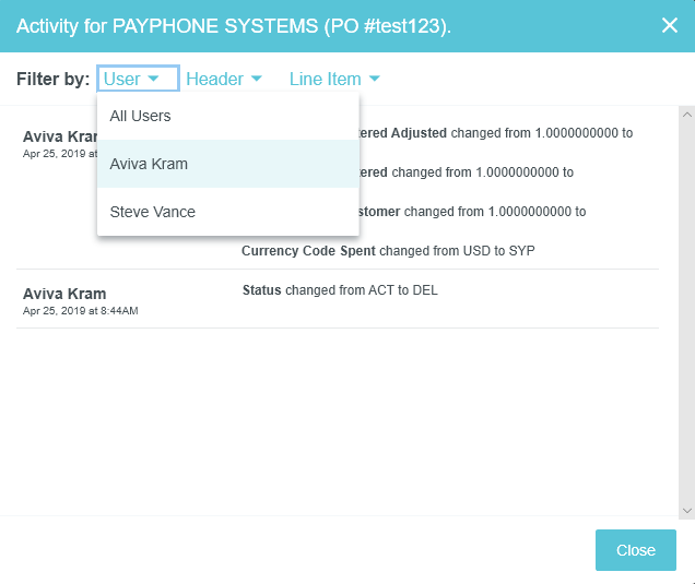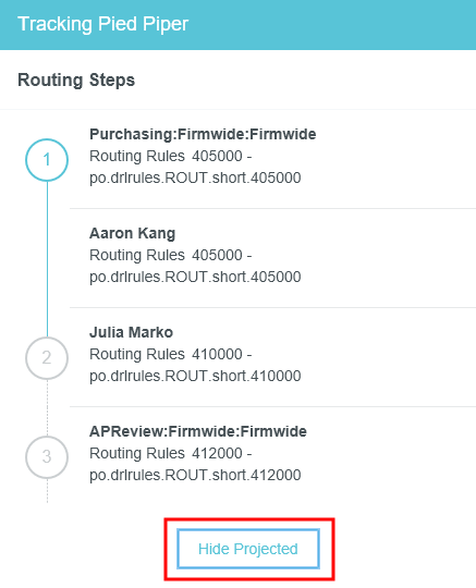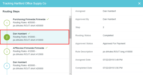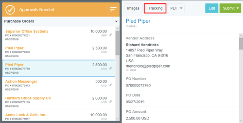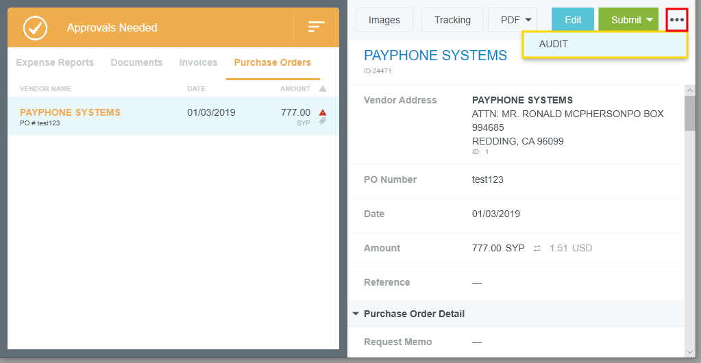 Track Your Submitted Purchase Orders The Tracking screen allows you to view where a purchase order is in the approval process and track the history of changes made to it. Access Tracking Navigate to the Submitted Purchase Orders screen and click on the purchase order you want to track. Then click TRACKING in the preview pane. Alternatively, navigate to the Approvals Needed screen and click on the purchase order you want to track. Then click TRACKING in the preview pane. Tracking The Tracking screen displays all the current steps of the approval routing process and the routing rule or reason for that step. If this view is blank, the purchase order has successfully completed all approval routing. Click SHOW PROJECTED to view the future routing path of the purchase order. Click HIDE PROJECTED to hide the future path. Click a routing step to view complete details about that step. Assigned: The individual or entity assigned by the company to review and approve the purchase order. Based on your firm’s approval guidelines, a purchase order can be assigned to a single individual or an entity (group of individuals). Approved By: The name of the person who approved the purchase order for this step. Step: The routing step for the approval assignment. Routing Status: The routing status for the approval assignment. Approved Status: The approval status for the approval assignment. Rule Description: A brief description of the rule applied at this approval step. Assigned Date: The date this purchase order was assigned to this approver. Completed Date: The date this purchase order was approved or returned by the approver. By: Displays whether approval occurred in the Emburse Enterprise application, by email or via auto-approval. Last Rank: The number of the last approved rule as defined by company-specific routing rules. A “-1” in this field means that the purchase order did not have a last approved rule at that step. Audit History The Audit drop-down menu allows you to track the history of edits to a purchase order's fields. It is accessible from the preview pane on the Draft, Recently Submitted and Approvals Needed lists. 1. Select the desired purchase order in the list, then click the three dots icon and select AUDIT. 2. The pop-up window will display the history of edits to each field of the PO, including date, time and user. 3. You may filter the history display by user, header fields and/or line-item fields by clicking on the USER, HEADER and/or LINE ITEM drop-down menus at the top. The filters may be used individually or in combination. Was this article helpful? Yes No