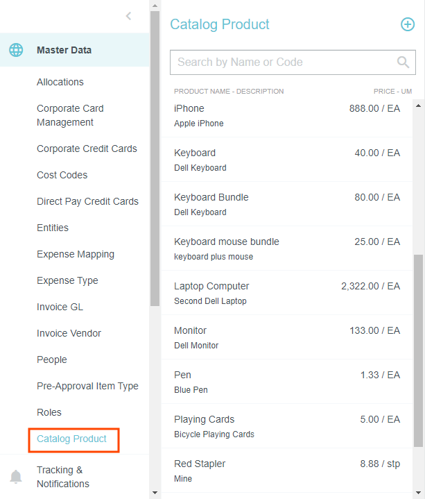 Catalog Product Admin Screen Our Catalog Product feature allows administrators to create an internal catalog of items from multiple vendors that users may select when creating purchase order requests. This allows you to limit users to specific items and to offer items from vendors not supported by our Catalog Punchout feature. Click ADMIN SETTINGS > MASTER DATA > CATALOG PRODUCT. Enable Catalog Product 1. Click ADMIN SETTINGS > CONFIGURATION > CUSTOMER PREFERENCES. 2. Select PURCHASE ORDER and click EDIT. 3. Under General, check the "Enable Catalog Product" box and click SAVE. Create a New Item Click the blue plus button and enter all the details of the product you wish to create. Product Number: The SKU number provided by the vendor. Manufacturer Reference ID: The part number or ASIN provided by the manufacturer. Click SAVE. It is also possible to upload products to the catalog in bulk via an API. Contact Support for more details. Edit an Item To edit a catalog product, select it in the list and click EDIT. You may edit any of its properties and make it active or inactive. When all your changes have been entered, click SAVE. Was this article helpful? Yes No