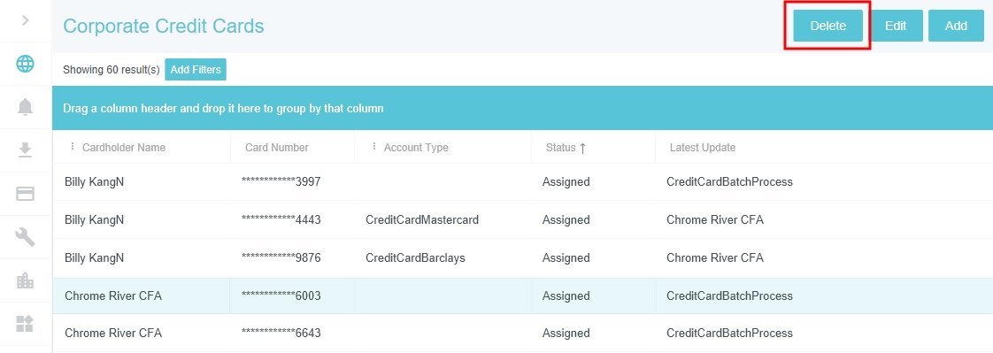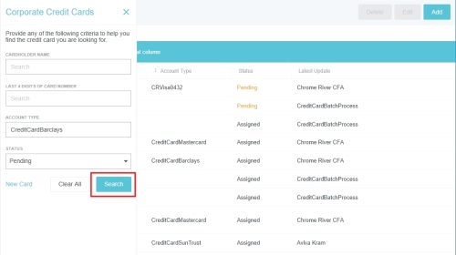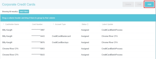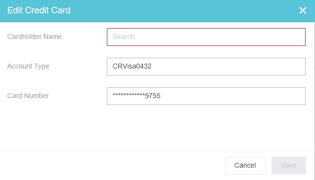 Corporate Credit Cards Admin Screen The Corporate Credit Cards screen allows administrators to manually add credit card numbers and map credit cards to users in the event that this data is missing from the bank’s data feed. Note: Emburse Enterprise only supports the following credit card data feed formats: Visa: VCF4, TVCFF Mastercard: CDF3 American Express: GL1025 Click ADMIN SETTINGS > MASTER DATA > CORPORATE CREDIT CARDS. Filter Search Results Use the filters to narrow your search results. Cardholder Name Last 4 Digits of Card Number Account Type: Select the desired data feed. Status: “Pending” returns cards with no users mapped to them. Edit Credit Card 1. Select the desired credit card and click EDIT. 2. Use the drop-down to select the desired cardholder name. You may also edit the Account Type and the Card Number. 3. When you are done, click SAVE. Add New Credit Card If a credit card is missing from the feed, you may add it manually and assign it to the desired user. 1. Either click NEW CARD from the filter screen... ...Or click ADD on the search results screen. 2. Select the desired user from the Cardholder Name drop-down and the desired Account Type from the drop-down. Then add the credit card number and click SAVE. Delete Credit Card 1. Select the desired credit card and click DELETE. 2. You will be asked to confirm by typing the word "DELETE" before you may click the DELETE button. Was this article helpful? Yes No
