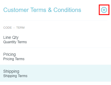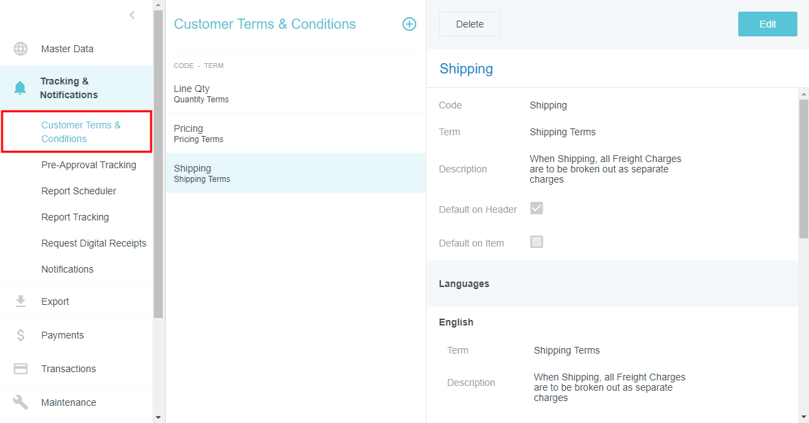 Customer Terms & Conditions Admin Screen The Customer Terms & Conditions admin screen allows you to enter standard "boilerplate" information you would like to have appear on your organization's purchase orders. You may configure the text to appear by default or to be manually added to each purchase order. Click ADMIN SETTINGS > TRACKING & NOTIFICATIONS > CUSTOMER TERMS & CONDITIONS. Edit Terms & Conditions 1. Select the desired set of Terms & Conditions and click EDIT. 2. You may edit the Code and the check boxes. The Term and Description are automatically populated based on what you enter in the English language Term and Description fields. 3. When you are finished editing, click SAVE. Create New Terms & Conditions 1. Click the blue PLUS button. 2. In the Code field, enter a name for the set of Terms & Conditions you are creating. The Term and Description fields will be populated automatically, depending on what you enter in the English Term and Description fields in the Languages section. 3. Use the check boxes to select whether you want to have the Terms & Conditions appear by default in the header section of the purchase order and/or the line items. If you check neither box, the Terms & Conditions will need to be added to each purchase order manually. 4. You will be able to enter term and the description for this set of Terms & Conditions in each language that your organization offers. Term: Fill in the name of the term. Description: Enter the Terms & Conditions text as you would like it to appear on your purchase orders. 5. Click SAVE. 6. For complete details on applying Terms & Conditions to a purchase order, see "Terms and Conditions" in Create a Purchase Order. Delete Terms & Conditions 1. Select the desired set of Terms & Conditions and click DELETE. 2. In the pop-up box, select DELETE. Was this article helpful? Yes No