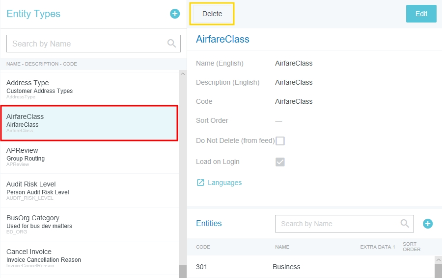 Entities Admin Screen The Entities Admin screen allows users with administrative privileges to add, edit and delete entity types and entities. Entities are groups or categories found throughout the Emburse Enterprise interface, including drop-down lists and rules (e.g., departments, offices or airfare/rail classes). Your company may send Emburse Enterprise entities via data feed or web service (API), or they may be entered manually via this screen. Entity Type: A collection of entities. For example, Airfare Classes is a type of entity. Entities: Individual elements in an entity type. For example, First Class, Business Class and Economy Class are all entities within the Airfare Classes entity type. Click ADMIN SETTINGS > MASTER DATA > ENTITIES. View an Entity Type and Its Entities Type all or part of the entity type name in the search box. Click on the desired entity type to display the information. You may also scroll through the list. More results load each time you reach the bottom of the list. The entities associated with that entity type appear in the Entities pane at the bottom. Create A New Entity Type 1. Click the blue + button to the right of "Entity Types." 2. Enter the entity type’s name and description in English, as well as its code. 3. Use the Sort Order drop-down to change the order in which this entity type will appear in the list. You may sort by Entity Name, Entity Code or Sort Order. 4. If your organization sends in an Entity Type data feed, it will overwrite your current entity types and all the associated entities. To prevent specific entity types from being overwritten, click the Do Not Delete (from feed) check box for each entity type. In the "Would you like to update all the DND flags for all belonging to this Entity Type to match your DND selection at the Entity Type level?" pop-up box, select APPLY. 5. Check the LOAD ON LOGIN check box. 6. Click SAVE. Create a New Entity 1. Click on the entity type for which you would like to create a new entity. 2. In the entity type's preview screen, click the blue + button to the right of "Entities." 3. Enter the name of the entity and its code. Emburse Enterprise offers up to five Extra Data fields for your use. 4. You may sort the entities in an entity type in numerical order by assigning each a number in the Sort Order field. In the example below, the First Class entity will appear third in the RailClass Type entity list. 5. If your organization sends in an Entities data feed, it will overwrite your current entities. To prevent specific entities from being overwritten, click the Do Not Delete (from feed) check box for each entity type. 6. Click SAVE. Edit an Entity Type Select the entity type in the list and click EDIT. When you are done, click SAVE. Edit an Entity In the Entity Types list, click on the entity type to which the desired entity belongs. Then click the desired entity in the Entities pane. When the new window opens, click EDIT, make the desired changes, then click SAVE. Delete an Entity Type Select the entity type in the list and click DELETE. This will also delete all the entities affiliated with that entity type. Delete an Entity In the Entity Types list, click on the entity type to which the undesired entity belongs. Then click the undesired entity in the Entities pane. Click DELETE. In the "Are you sure you want to delete this entity?" pop-up window, click DELETE. Add and Edit Entity Type Languages Although the primary entity type language is English, you may add alternate entity type names and descriptions in any language supported by your organization in Emburse Enterprise. These will be displayed for users who have selected one of those languages in their Settings. Select the desired entity type in the list and click EDIT. Then click LANGUAGES. 3. Add the desired entity type name and description for any of the supported languages, then click APPLY. Add and Edit Entity Languages Although the primary entity language is English, you may add alternate entity names in any language supported by your organization in Emburse Enterprise. These will be displayed for users who have selected one of those languages in their Settings. 1. In the Entity Types list, click on the entity type to which the desired entity belongs. Then click the desired entity in the Entities pane. 2. In the pop-up window, click EDIT. 3. In the Languages section, enter the desired entity name for any of the supported languages, then click SAVE. Was this article helpful? Yes No