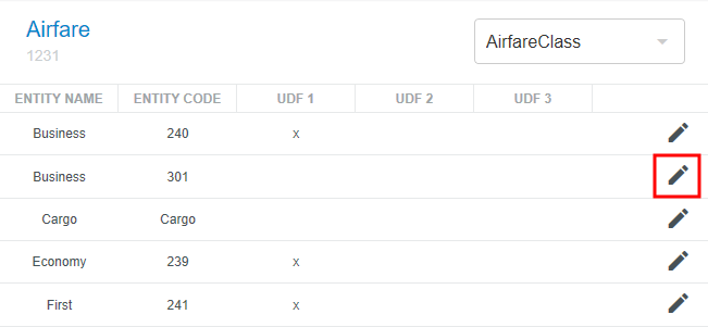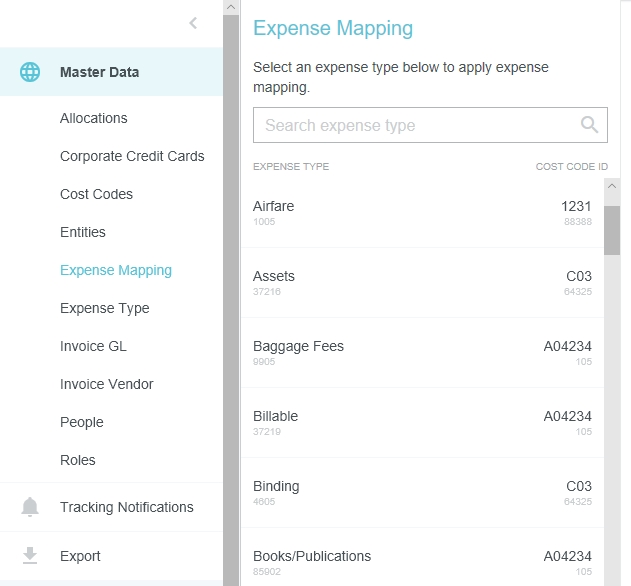 Expense Mapping Admin Screen The Expense Mapping screen allows admins to view how expense types are mapped to cost codes or other properties based on entities (categories). The set-up of these mappings is usually determined during the initial implementation of Emburse Enterprise at your company. Depending on your permissions, you may be able to edit the User-Defined Data Fields (UDFs) associated with these entities. View Expense Types and Entities 1. Click ADMIN SETTINGS > MASTER DATA > EXPENSE MAPPING. You will see a list of expense types and their associated cost codes. 2. Highlight an expense type and then select the desired entity type from the drop-down list in the upper right. You may begin typing the entity type name to narrow the search results. 3. You will see a list of all entities associated with the chosen entity type. Edit Entity UDF Data 1. Click the pencil icon to the right of the entity name. 2. Entered the desired UDF data, then click SAVE. Was this article helpful? Yes No