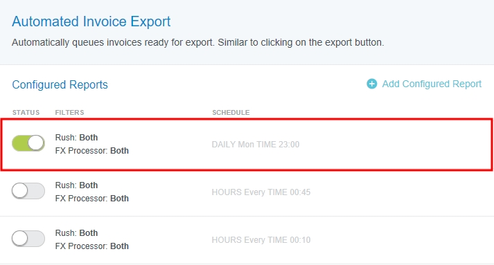 Automate Exports via the Report Scheduler In addition to viewing and editing scheduled reports, Emburse Enterprise's Report Scheduler admin window allows you to add and manage auto exports. Users with the appropriate security permissions may add multiple schedules, turn the auto export schedule on and off, and modify filter settings to customize the auto export schedule. For information on enabling user access, see "Configuring Access to Features in Reports Schedule" in Report Scheduler Admin Screen. 1. From the Admin Menu, click TRACKING NOTIFICATIONS > REPORT SCHEDULER. See Report Scheduler Admin Screen for detailed instructions on adding, editing and scheduling automated exports. Automatic Export Queuing for EXPENSE You can schedule the system to automatically queue all the expense line items that are ready for export. This function is the same as clicking on the EXPORT button. The export will run according to the schedule(s) activated in the Configured Reports section. In the highlighted example below, the export is scheduled to run daily (Sunday through Saturday) at 10:00 UTC. The Status column shows whether the export schedule is active. Click the toggle to change the status. Automatic Export Queuing has multiple filters. If the schedule uses more than can be displayed in the Configured Reports list, there will be a small black button indicating how many more when you hover over the schedule. Click that button to preview all the filters in a pop-up. To add or edit filters, hover over the desired schedule and click EDIT. Automatic Export Queuing includes a mutli-select country filter that narrows the results by expense owner country. You may continue adding countries by selecting them from the drop-down. See Report Scheduler Admin Screen for detailed instructions on adding, editing and scheduling automatic exports, including samples of Common Schedule Intervals and Parameters. Automated Invoice Export You can schedule the system to automatically export approved invoices. This function is the same as clicking on the EXPORT button. The export will run according to the schedule(s) activated in the Configured Reports section. In the highlighted example below, the export is scheduled to run weekly, on Monday at 23:00 UTC, including invoices that contain rush payments and/or foreign exchange payments. The Status column shows whether the export schedule is active. Click the toggle to change the status. Automated Invoice Export has multiple filters. If the schedule uses more than can be displayed in the Configured Reports list, there will be a small black button indicating how many more when you hover over the schedule. Click that button to preview all the filters in a pop-up. Note that the "Email export confirmation to" filter MUST have a value or the schedule will not run. There are several filters you can use to narrow the number of invoices exported. To add or edit filters, hover over the desired schedule and click EDIT. Rush and FX Processor filters offer you the following choices: Both: Includes this type of invoice and all other types Exclude: This type of invoice is not exported. Only: Includes only this type of invoice. See Report Scheduler Admin Screen for detailed instructions on adding, editing and scheduling automated invoice exports, including samples of Common Schedule Intervals and Parameters. Was this article helpful? Yes No