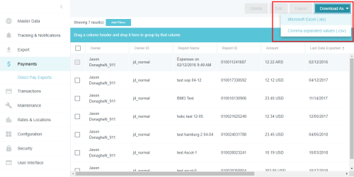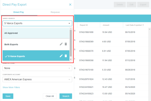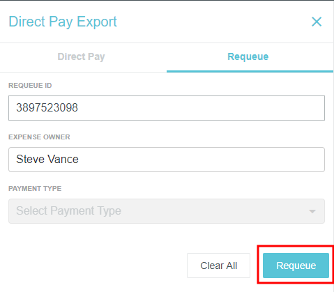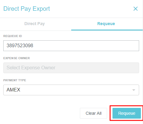 DIRECT PAY Exports Admin Screen The availability of this function depends on your company's security rules. Only expenses that have gone through a regular export may be exported via DIRECT PAY (see Export Approved Expenses Admin Screen for more information). It is possible to export reports with negative payment values if the total value of the export is positive. For further details on DIRECT PAY, see DIRECT PAY Credit Cards Admin Screen. Click ADMIN SETTINGS > PAYMENTS> DIRECT PAY EXPORTS. Find and Filter Approved Expenses If you click SEARCH without selecting any filter criteria, the screen will show you all expenses that have been approved and exported to the accounting system. You may also filter the results in order to pay only certain expenses. Enter the criteria you would like to use to create your filter (e.g., expense owner, payment type). Then click SEARCH. To save your filter criteria for future use, click SAVE before you search, then click CREATE NEW SEARCH. Enter the desired search name and click CREATE. Your saved search will be available in the SAVED SEARCH drop-down. To edit or delete a saved search, select it from the drop-down and then click the pencil icon (to edit) or the trash icon (to delete). Export Approved DIRECT PAY Expenses The list displays expenses that need to be reimbursed to the requestor’s bank account (ACH or REIM) and expenses that need to be reimbursed to the company’s credit card (AMEX). Select the approved DIRECT PAY expense(s) you would like to export. At the bottom of the screen, you will see the total number of expense owners selected and separate total amounts for each type of payment you are about to export. Click EXPORT in the upper right corner. You will receive an email confirmation. Expenses displayed in gray italics cannot be submitted. Hover your cursor over the check box for that expense to display the reason. If you attempt to export an expense when no bank account has been selected, you will receive an error message. See Edit Bank Accounts for Reimbursing Expenses, below. Edit Bank Accounts for Reimbursing Expenses You can select different company bank accounts from which to reimburse each expense. Select an expense in the list and click EDIT. In the pop-up window, use the drop-down menu to select the bank account from which to pay that expense and click EDIT. Delete Approved Expenses For payments made outside Emburse Enterprise, you may remove approved expenses from an export. Note: Payments made made via Global Reimbursements by Wise may not be removed from an export. Check all the expenses that need to be removed and click DELETE at the top of the screen. In the confirmation pop-up, type "DELETE" and then click DELETE. Download Export Data To download a .csv or .xls version of all the data on the DIRECT PAY Exports Screen, click DOWNLOAD AS and select the desired file type. The generated file will contain all the items returned by the current filter on the screen. Requeue DIRECT PAY Transactions When a user’s DIRECT PAY payment is returned due to an invalid bank account number or routing number, the administrator receives a notification email containing the expense owner name(s) and export requeue ID(s). The administrator contacts the expense owner to notify them to update the bank information. Then, the administrator may requeue the expense report for the next DIRECT PAY export via Emburse Enterprise’s Requeue DIRECT PAY Exports screen. Note: Payments made via Global Reimbursements by Wise will automatically requeue if they are returned. First, click the REQUEUE tab. Enter the Requeue ID from the email notification and select the expense owner from the drop-down list, then click REQUEUE. Alternatively, you may enter the Requeue ID and the Payment Type, which will requeue all payments for that type. Was this article helpful? Yes No