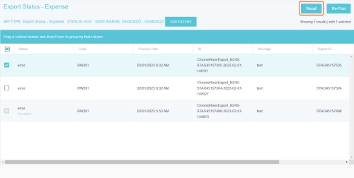 API Monitor Admin Screen API Monitor gives Emburse Enterprise customers who use our connectors or Export API visibility into the status of Expense and Invoice exports. Administrators may search by date or status to view the Process Date, Unique ID, Report ID and Expense Owner name for each export. If such optional data as Code, Message or Description was passed via the API, it will also be visible. Admins may also recall failed expense exports, if this functionality has been activated for your organization. 1. Select the ADMIN SETTINGS option at the bottom of the left navigation menu. 2. Click MAINTENANCE > API MONITOR. 3. Choose the desired API: Export Status – Expense Export Status – Invoice 4. Set the date range and, if desired, select a status to filter on. Click SEARCH. Recall Failed Expense Exports Admins with appropriate permissions may activate the ability to recall expense reports with a status of “Error.” This allows admins to recall failed reports, make the necessary updates, and, if configured, reapply VAT rules to the updated report. The report will be sent to the dashboard of the user who recalled it. Your organization may choose to configure routing rules to also send the report to additional approvers, including the VAT Aubtobot. Note that this feature is not available for customers who use SAP Delta posting or DIRECT PAY. To activate this feature, an admin may navigate to SECURITY > ACCESS PERMISSIONS > API MONITOR and click EDIT. Check the box next to “Recall exported expense reports” and click SAVE. Once this feature has been activated, select the desired expense report and click RECALL. Was this article helpful? Yes No
